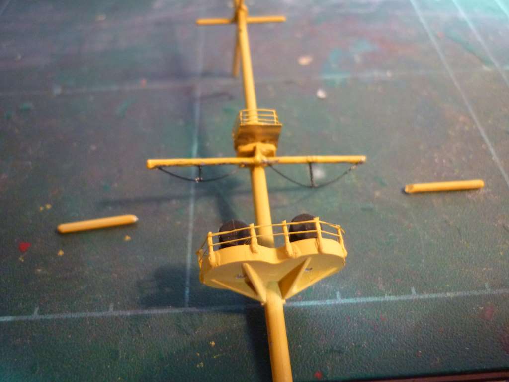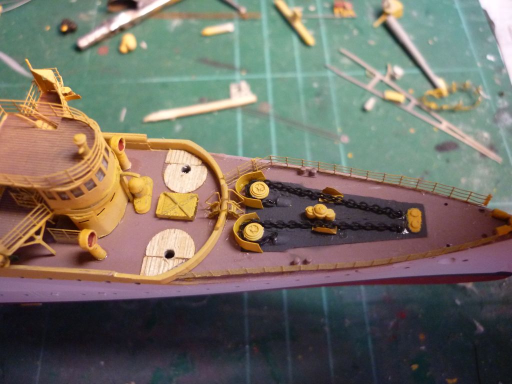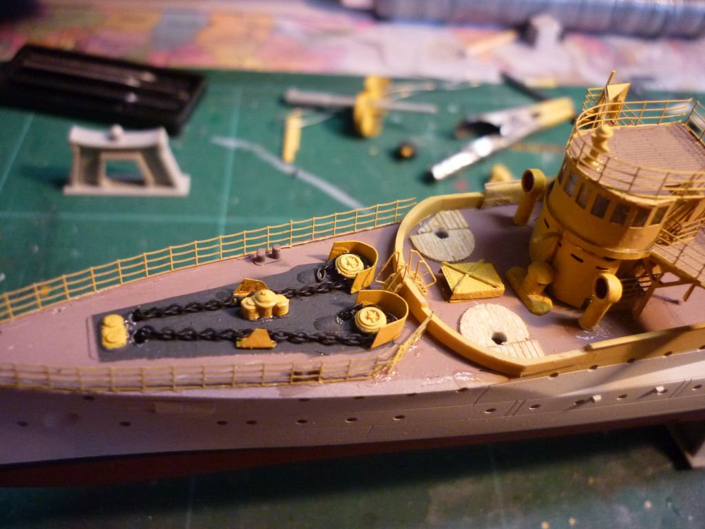 ich habe ein bisschen weiter gebastelt,und das Vorschiff komplettiert.Zunächst habe ich den Munitionsaufzug vor der Brücke und die