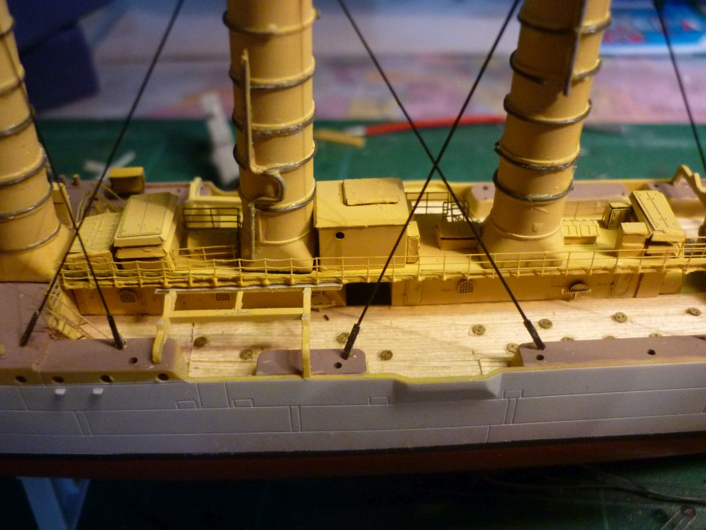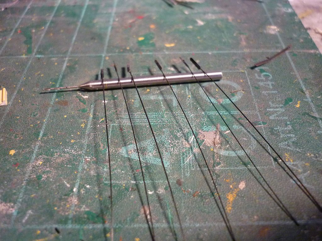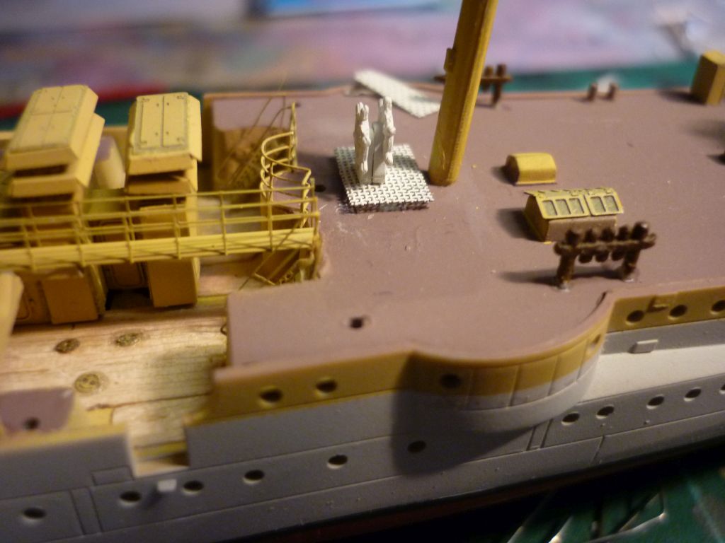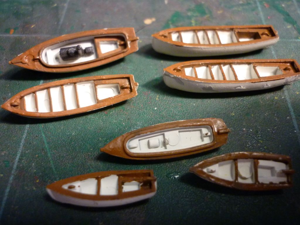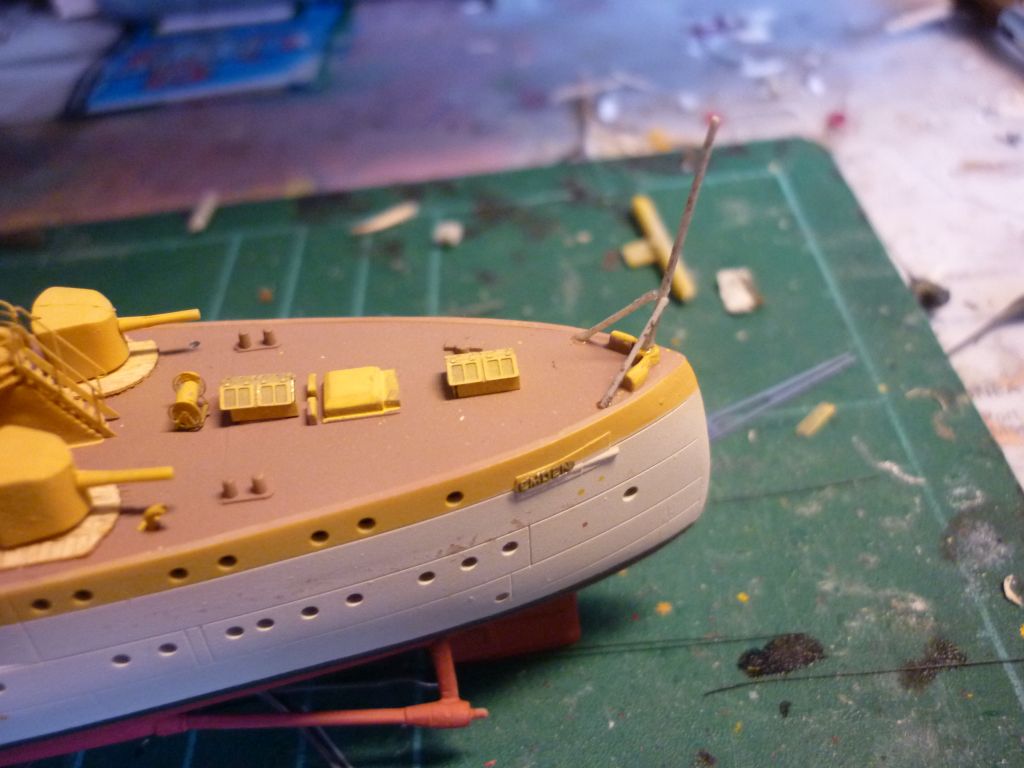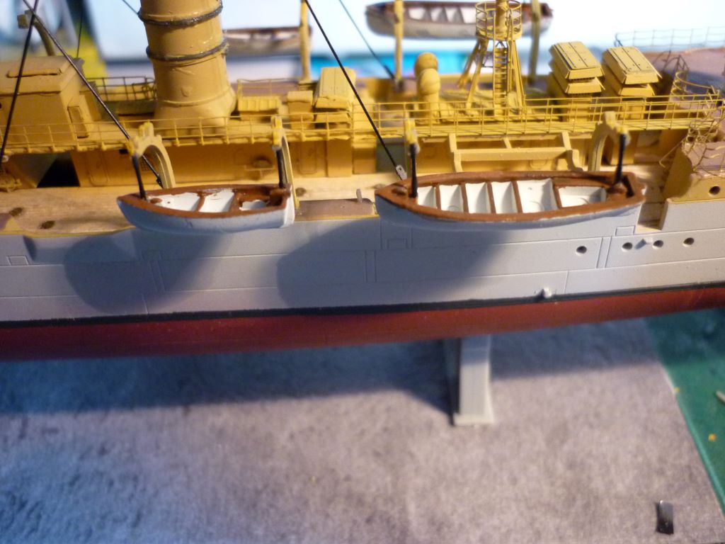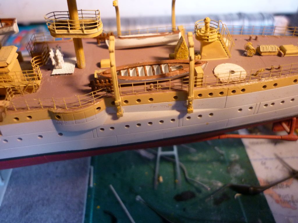 mittlerweile habe ich die Rettungsboote fertigbemalt,und die Masten etwas verfeinert indem ich die Querstangen abgetrennt und