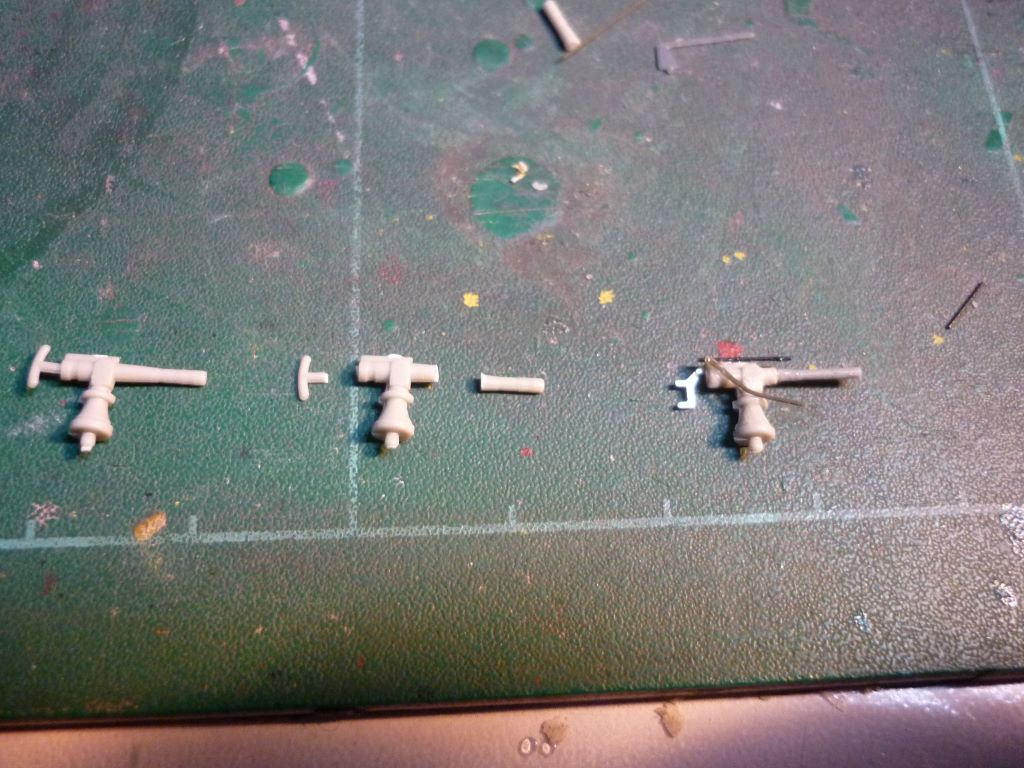 ich habe mir die 5,2cm Kanonen mal vorgeknöpft, sie haben im direktem Vergleich mit den Großen Geschützen die gleiche Rohrdicke und sie mit Teilen aus der Restekiste und gezogenem Gußast verfeinert.Mir gefällts so besser ich hoffe euch auch.