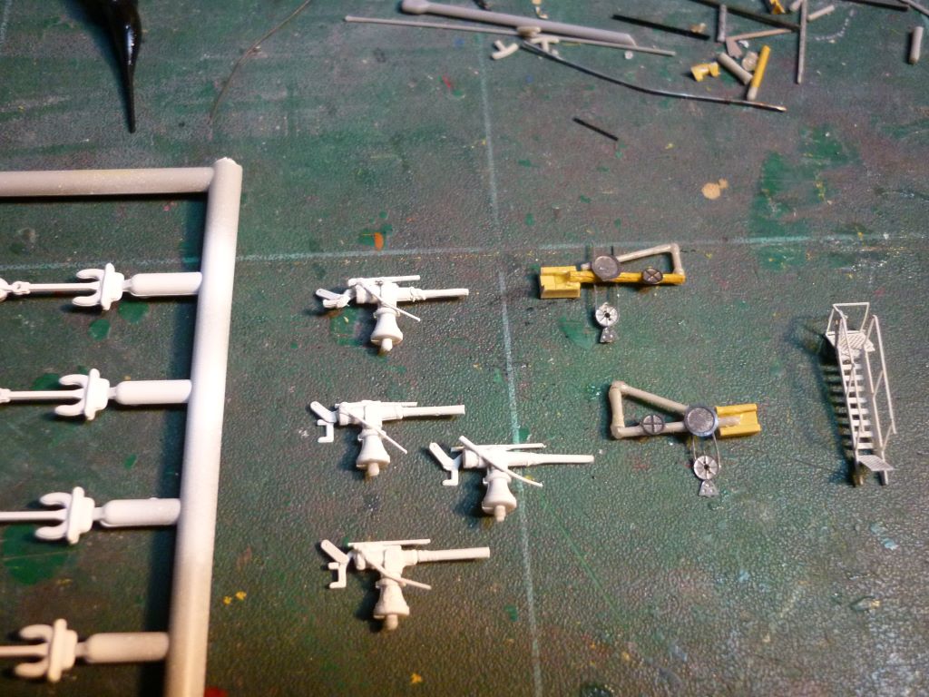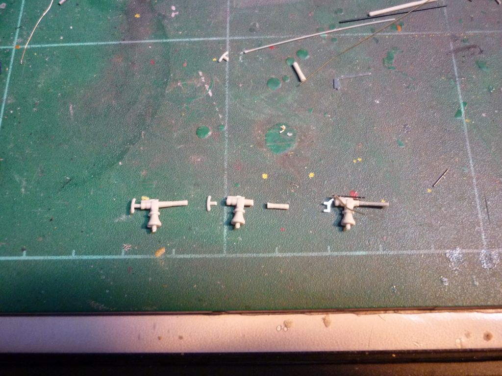 weiter gehts die geschütze sind nun fertig und lackiert.Ich habe die Torpedotransportkräne für Steuerbord u. Backbord mit teilen der Restekiste hergestellt.Und ich habe in meinem Fundus noch einige Fallreeps und habe eine davon weiß lackiert.Hoffe es gefällt.