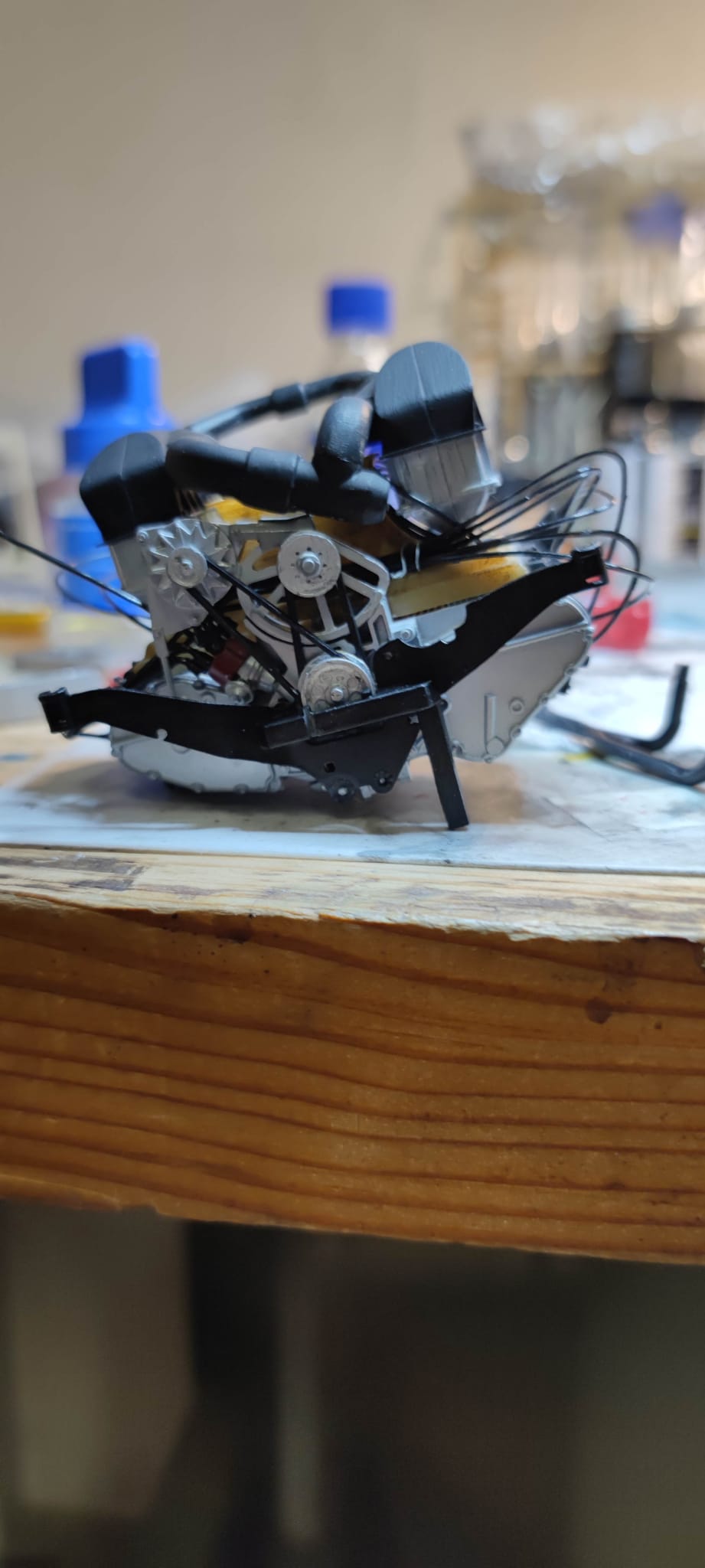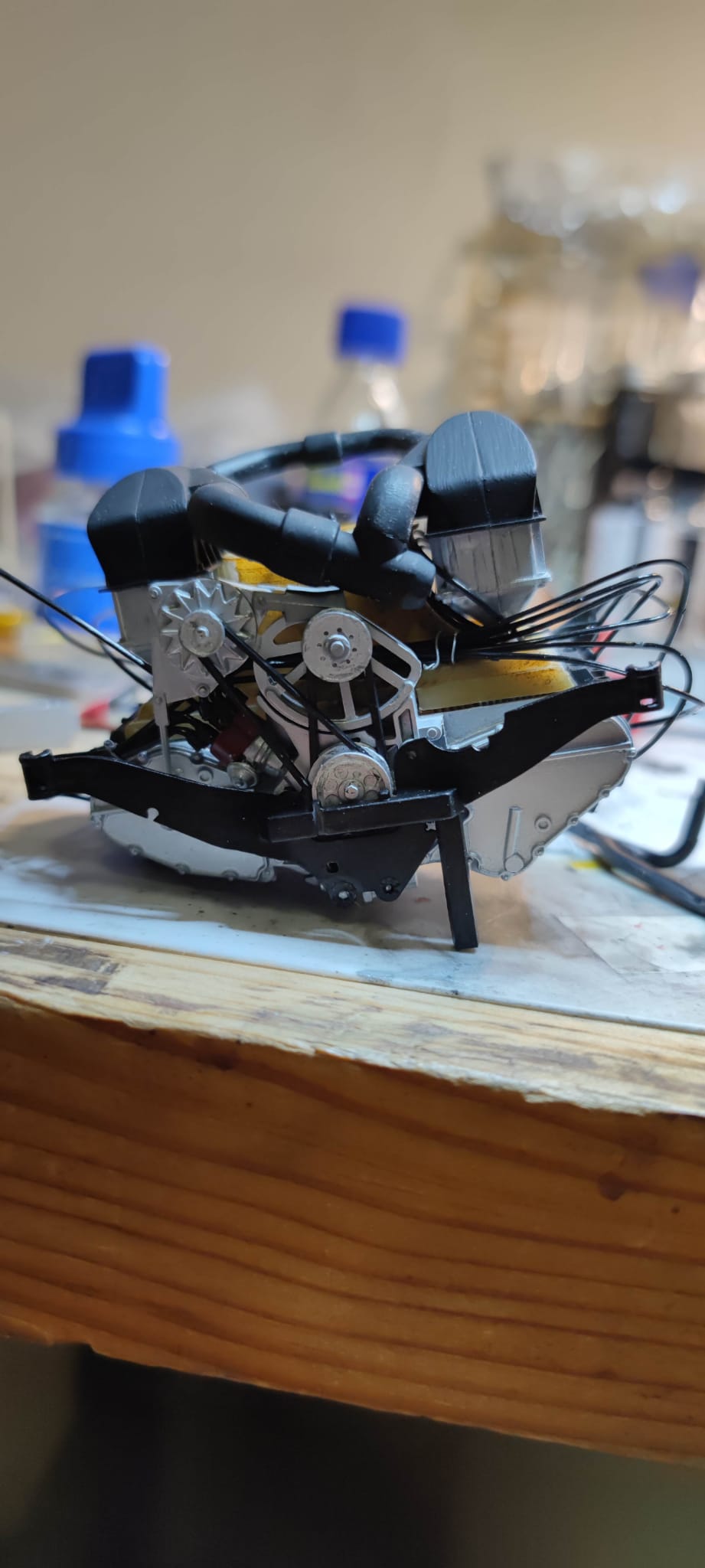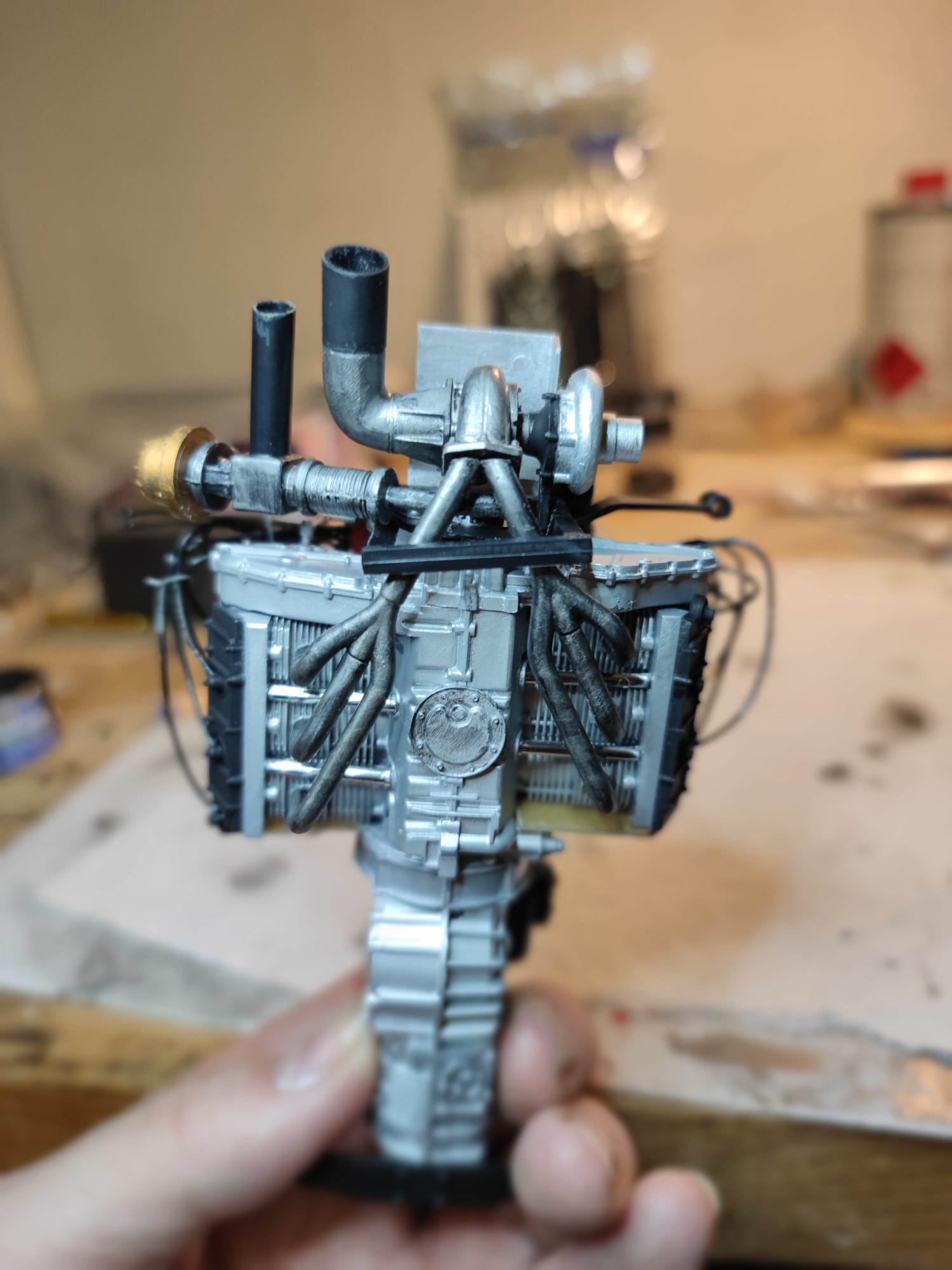 So, der Motor ist zu 80% fertig und macht keinen schlechten Eindruck. Bei den Schläuchen und Kabeln muss mir meine Frau helfen, die zu sortieren. Ich bin dafür zu grobmotorisch unterwegs.