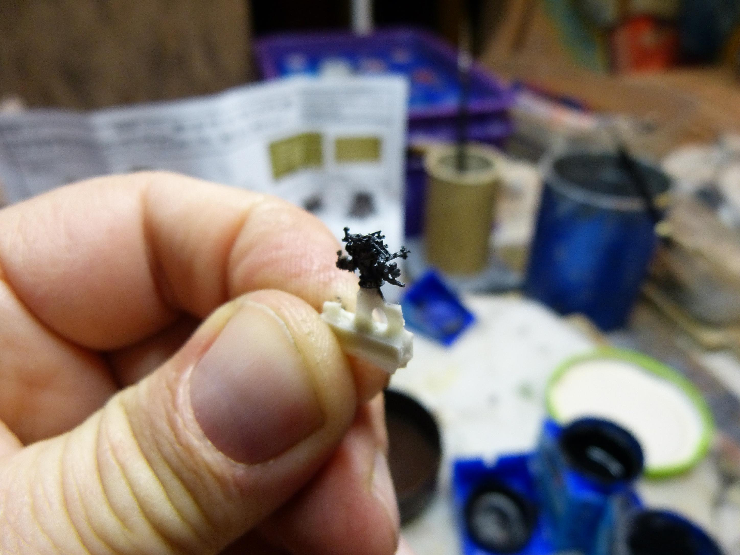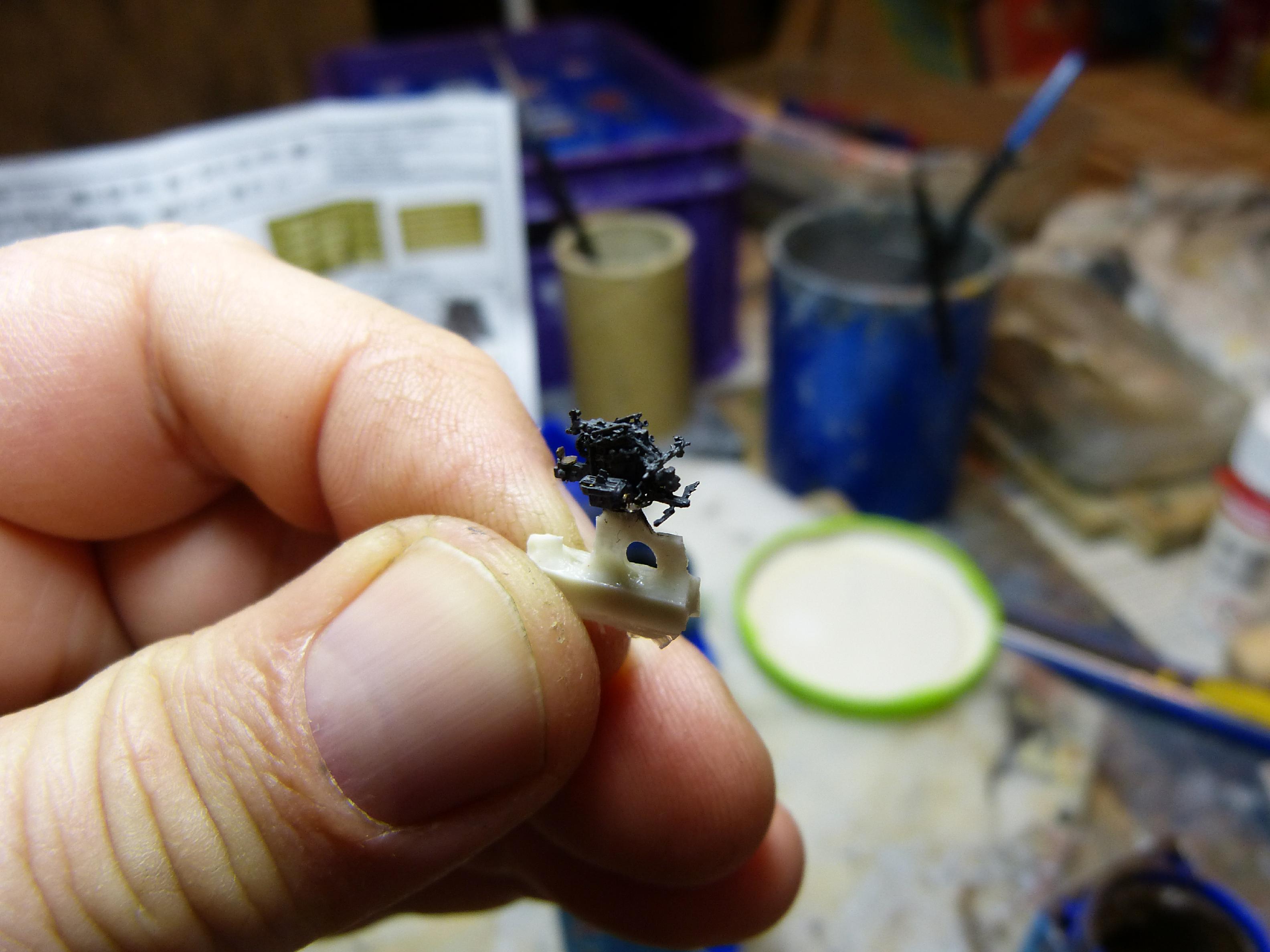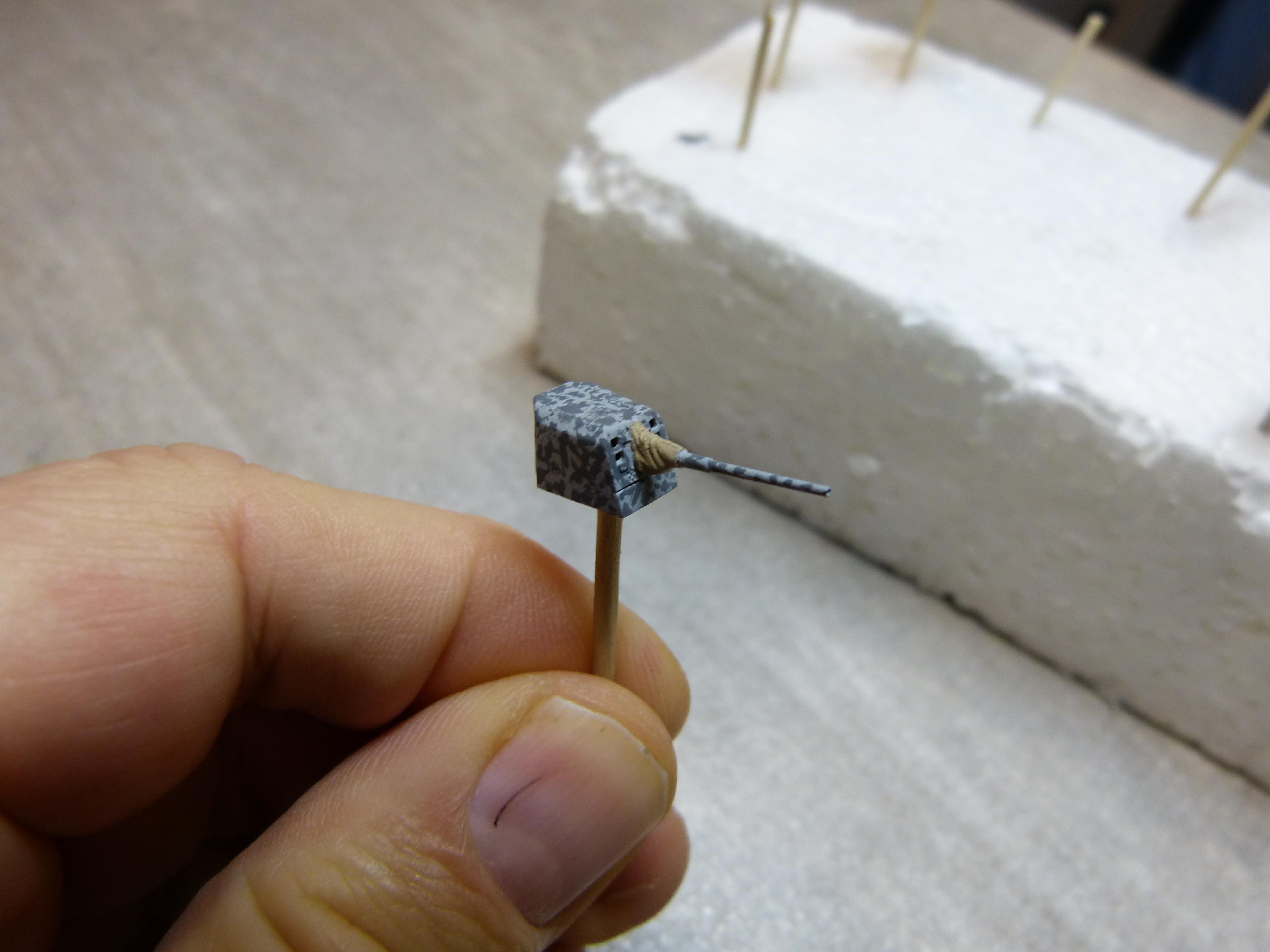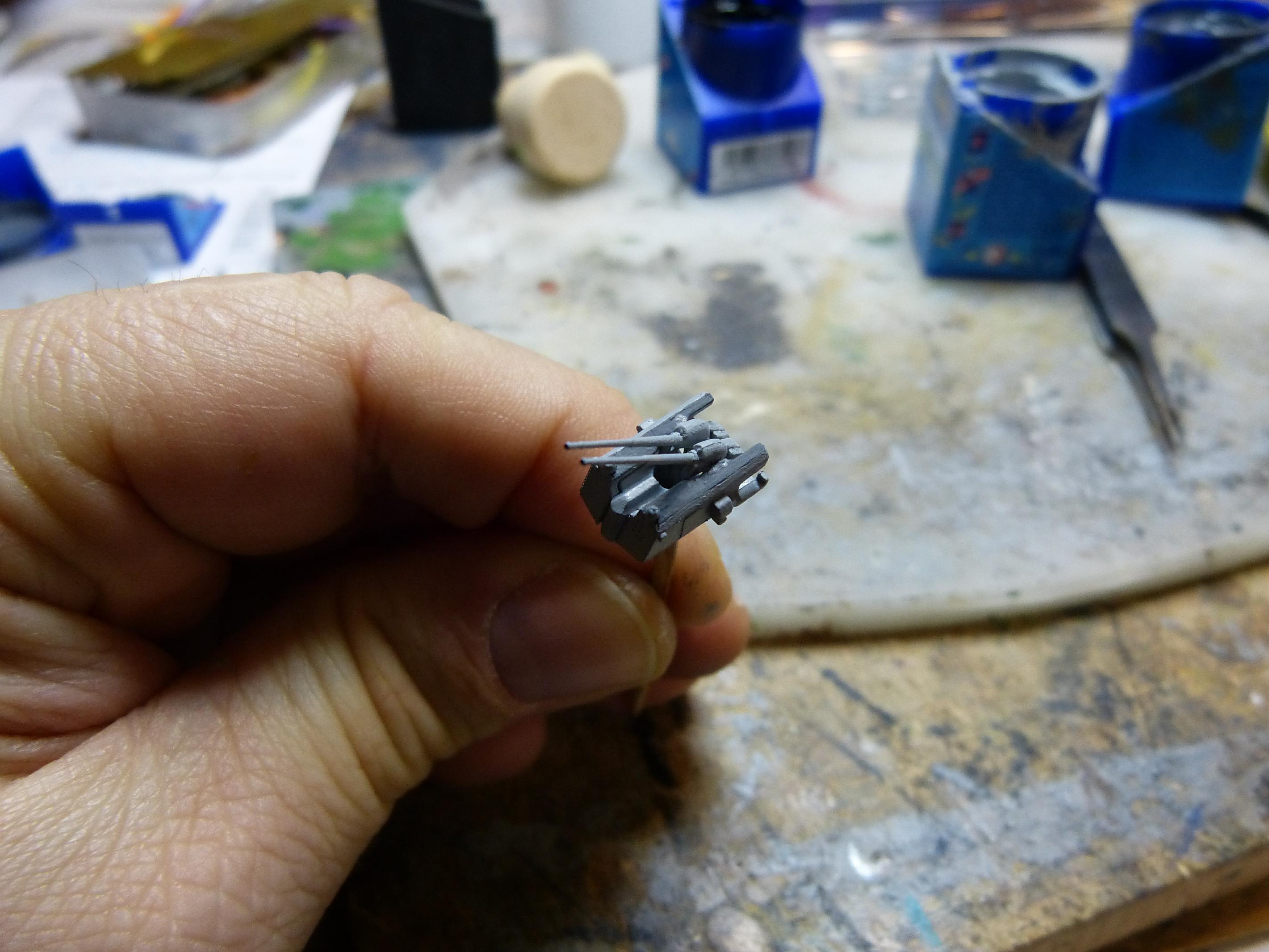 Der Bau der Einzelgeschütze war etwas schwieriger. Mit dem Ersetzen des Plastikrohres im Zusammenspiel mit dem Blastbag war es hier nicht getan, da die Geschütze hinten offen waren. Somit mussten auch weitere Plastikteile der Geschützrohreinheit wiederverwendet werden.