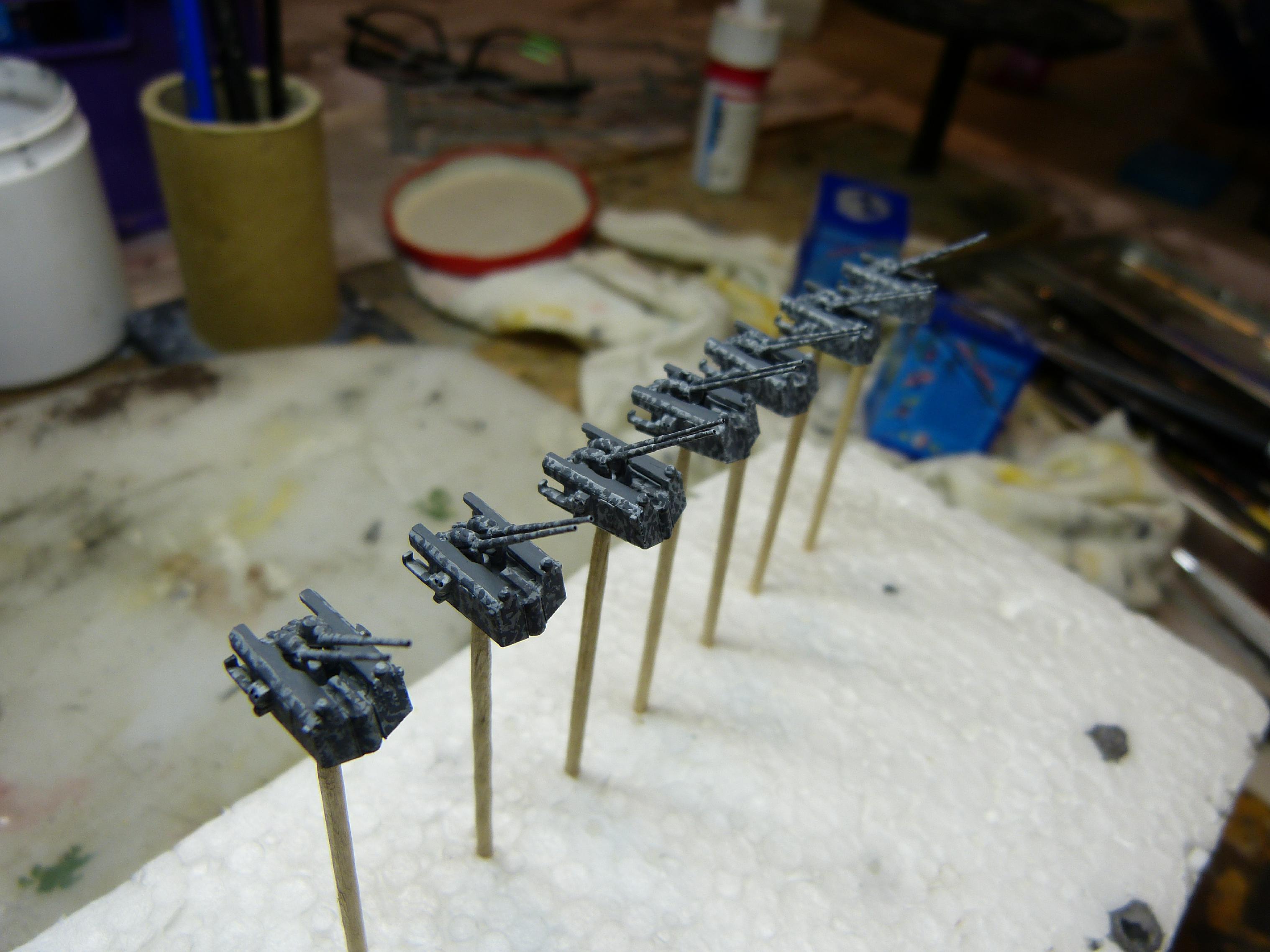 Nun waren noch jeweils 2 Flakvierlinge zu bauen: die Standardvariante C/38 und die ältere Bauform C/35. Warum hier damals (auch auf GU) teilweise die alten Typen verbaut wurden, entzieht sich meiner Kenntnis. Vermutlich waren diese gerade verfügbar. Somit hatte SH im Februar 1942 4 x C/38 und 2 x C/35. Vom Hersteller Veteran gibt es zum Glück Bausätze von beiden Ausführungen.
