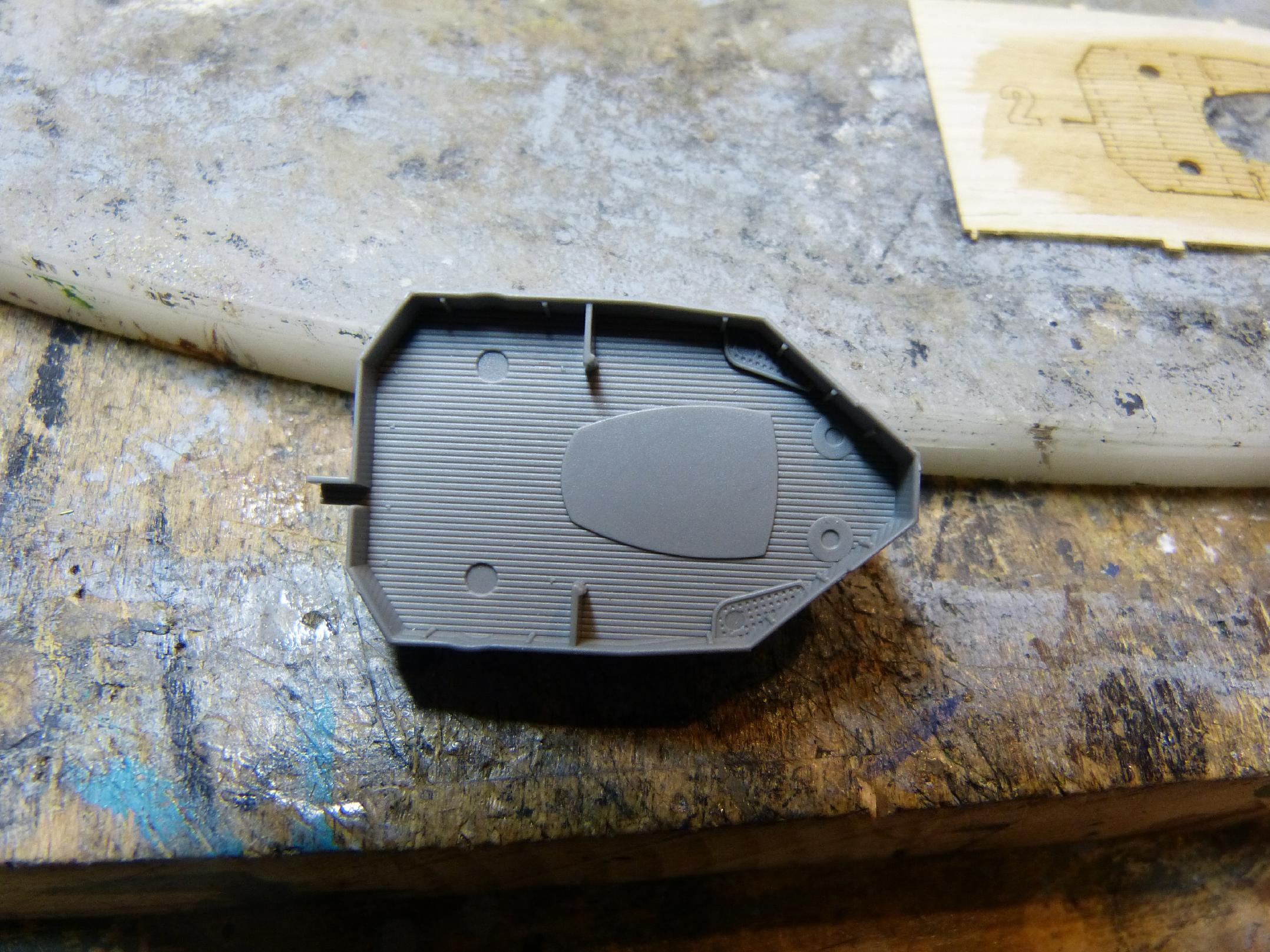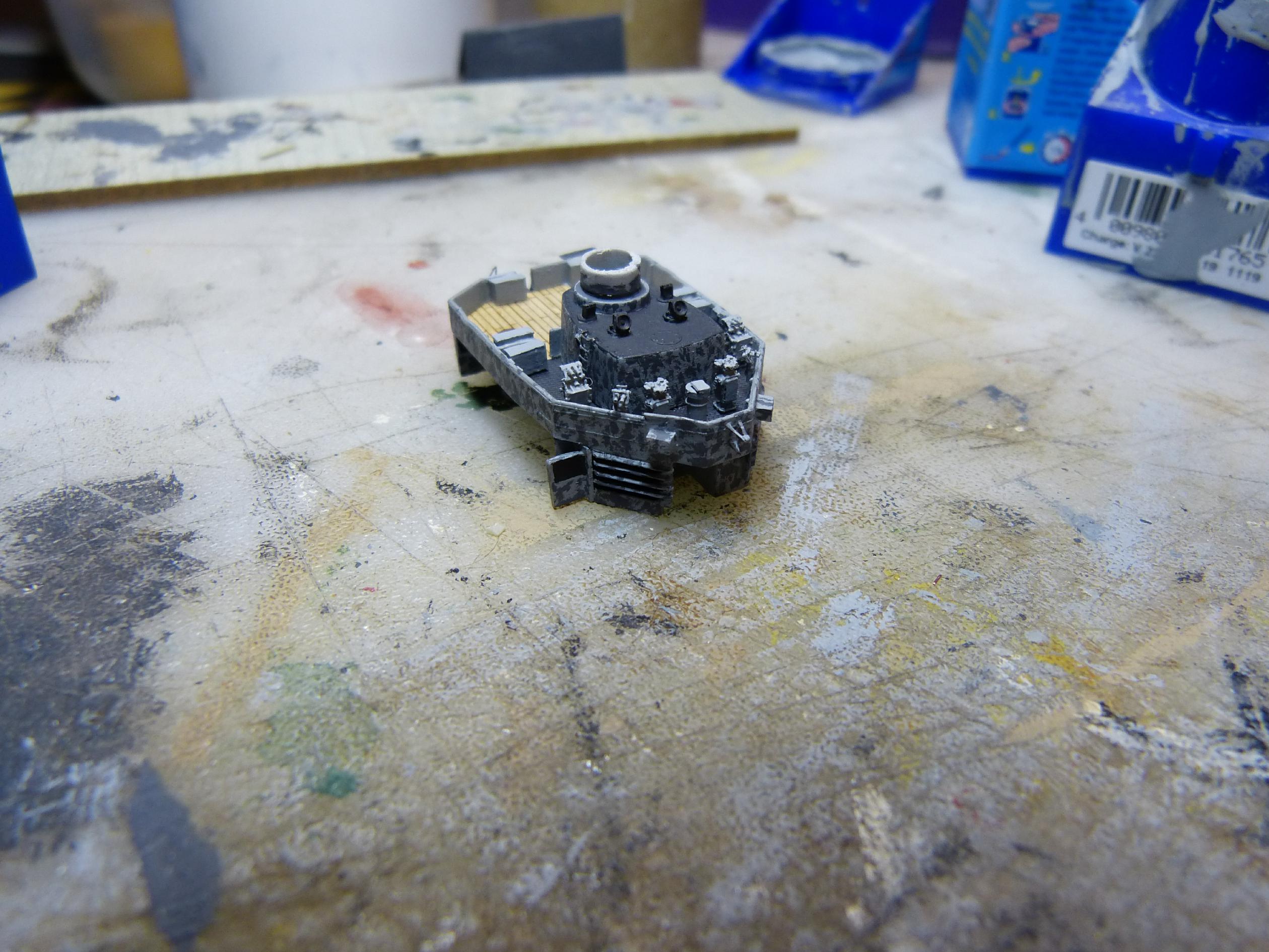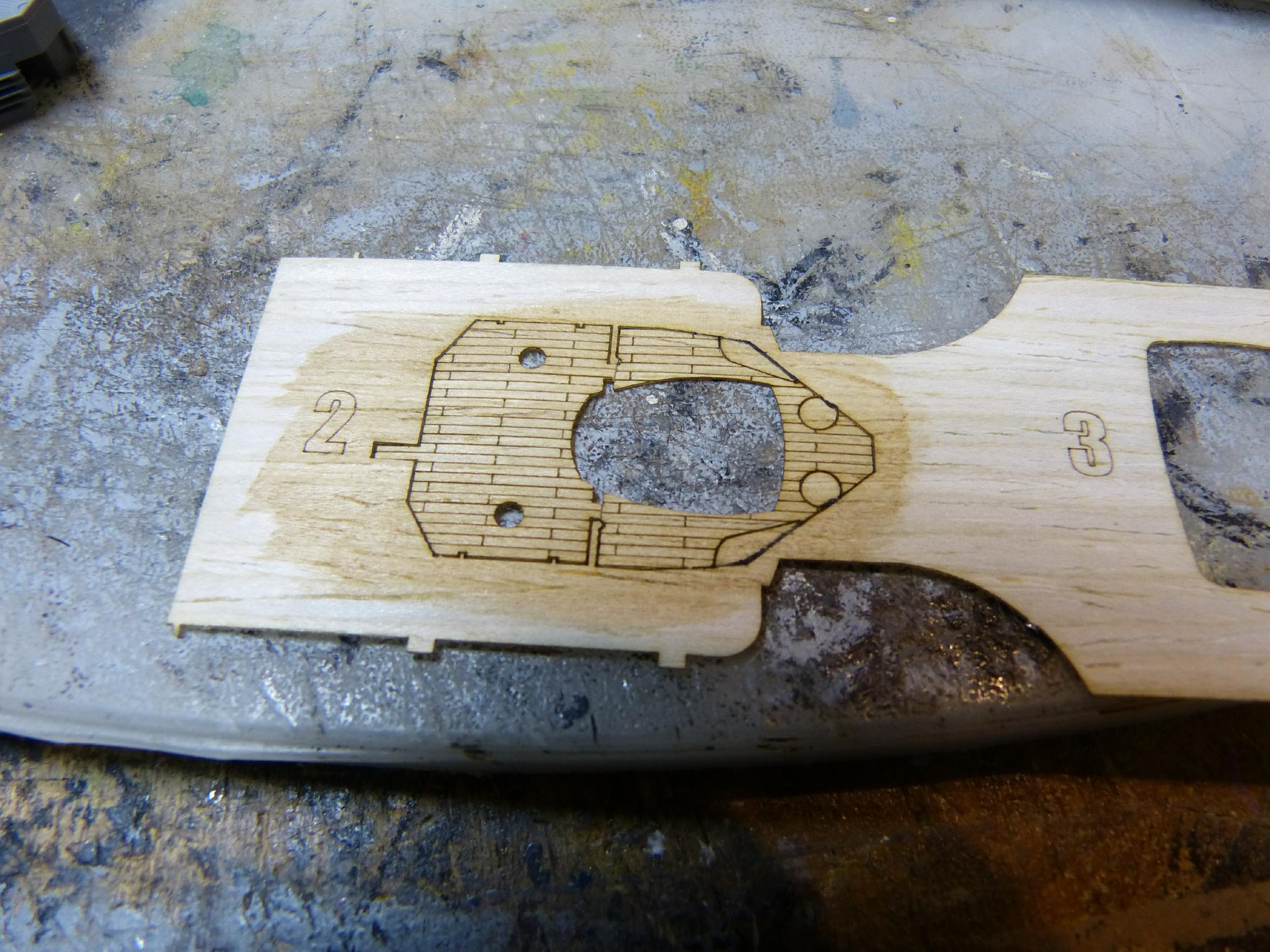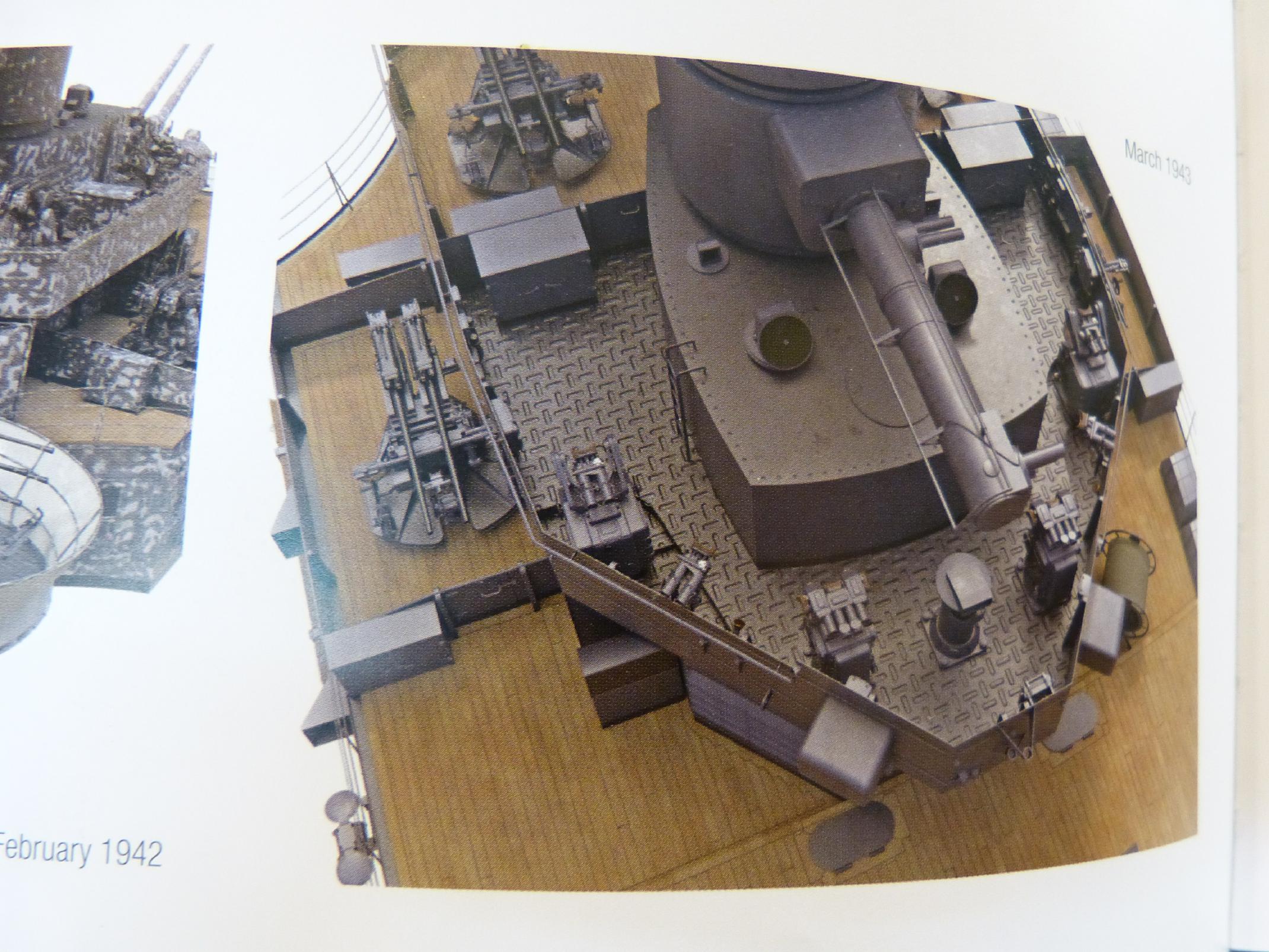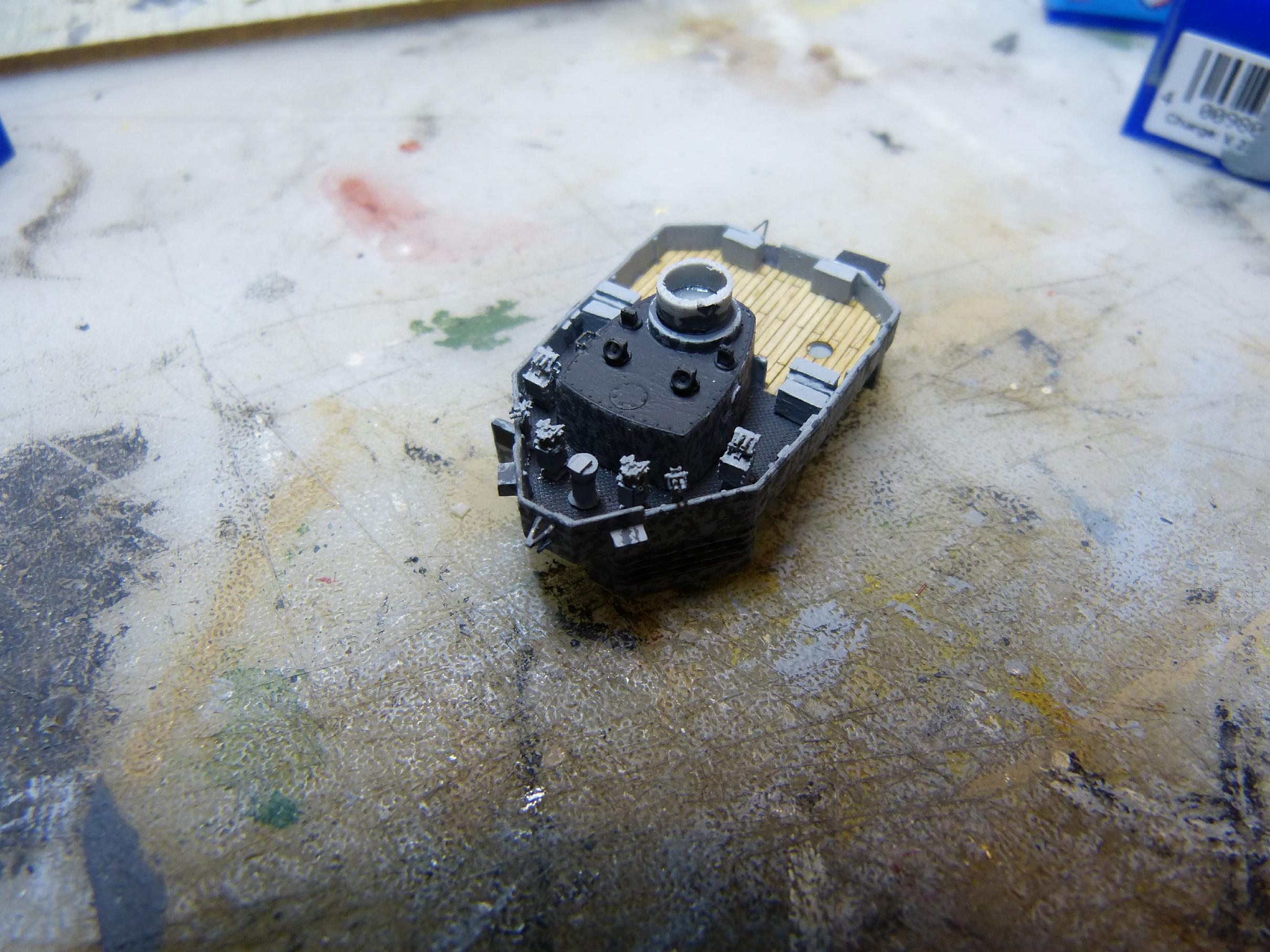 Danach beschäftigte ich mich mit Hangar und achterem Leitstand. Bei letzterem fiel mir auf, dass hier vom Bausatz her etwas falsch war. Der hintere Teil ist nämlich laut Buchvorlage nicht als Holzdeck, sondern mit Riffelblech ausgeführt.