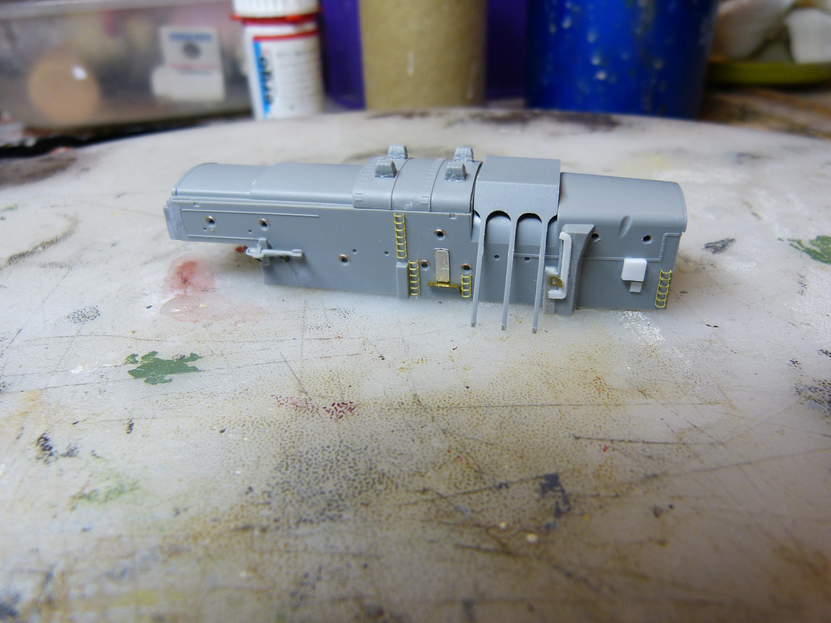 Nun war der Hangar dran. Hier waren einige „Verfeinerungen“ und Anpassungen nötig, z.B. „echte“ Steigeisen und nicht nur angedeutete aus Plastik. Weiterhin diverse „Kästen“ und Lüfter, Bullaugen aufgebohrt. Übrigens sind im Bausatz doch Ottergeräte enthalten (N58), aber nur 2 Stück. Die habe ich hier auch verwendet, da sie später kaum zu sehen sind.
