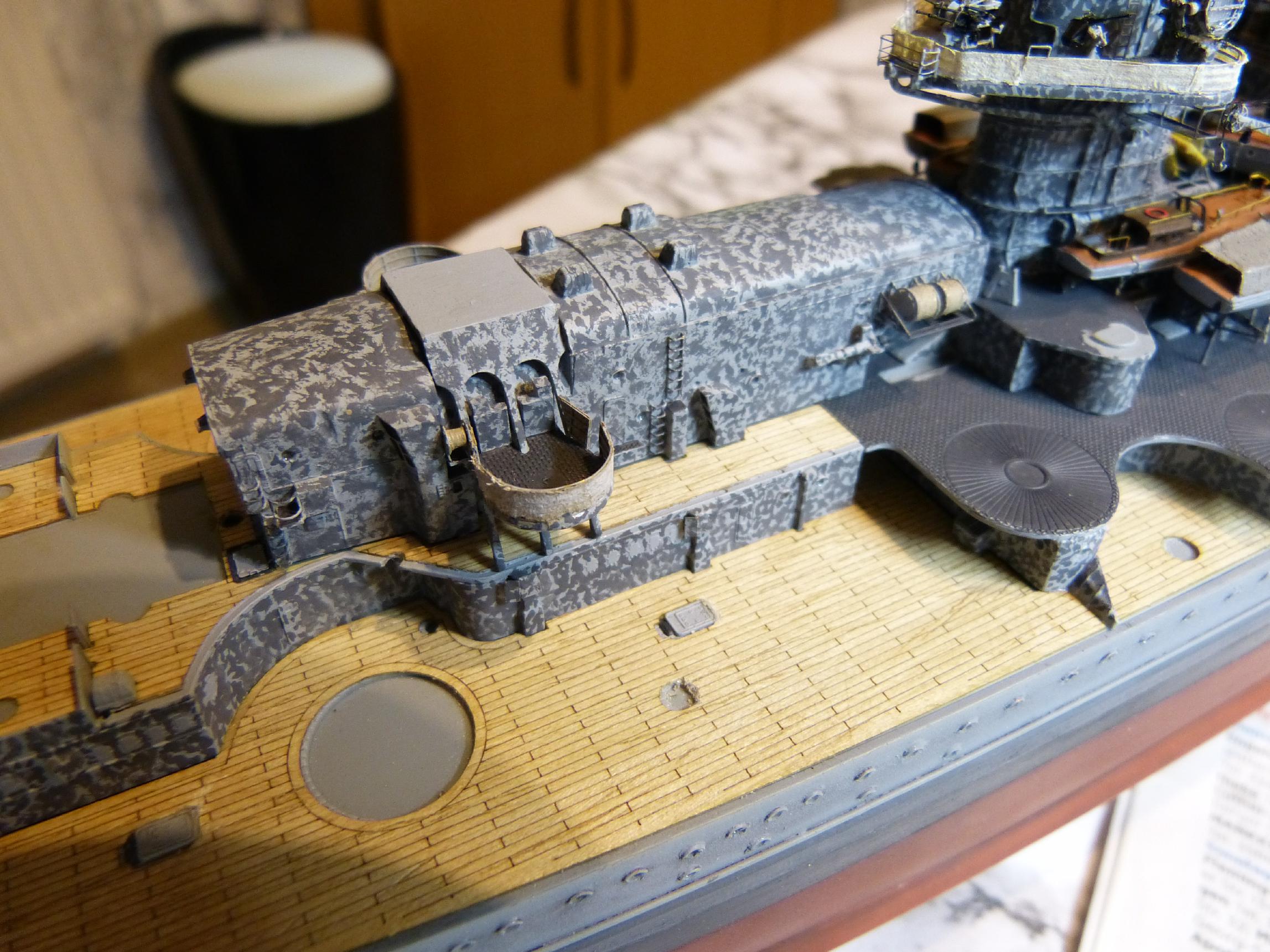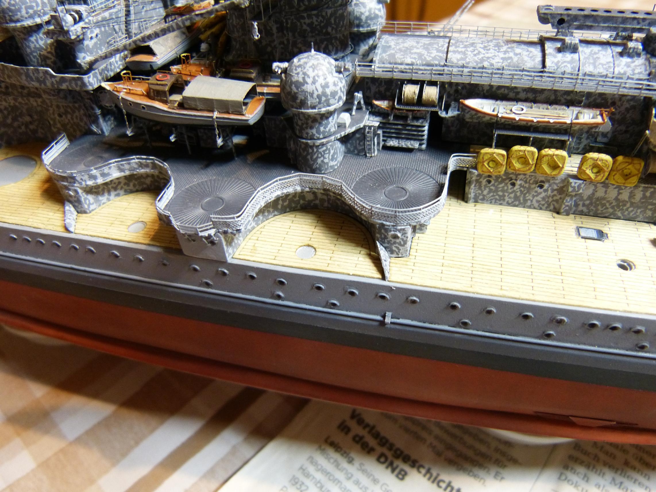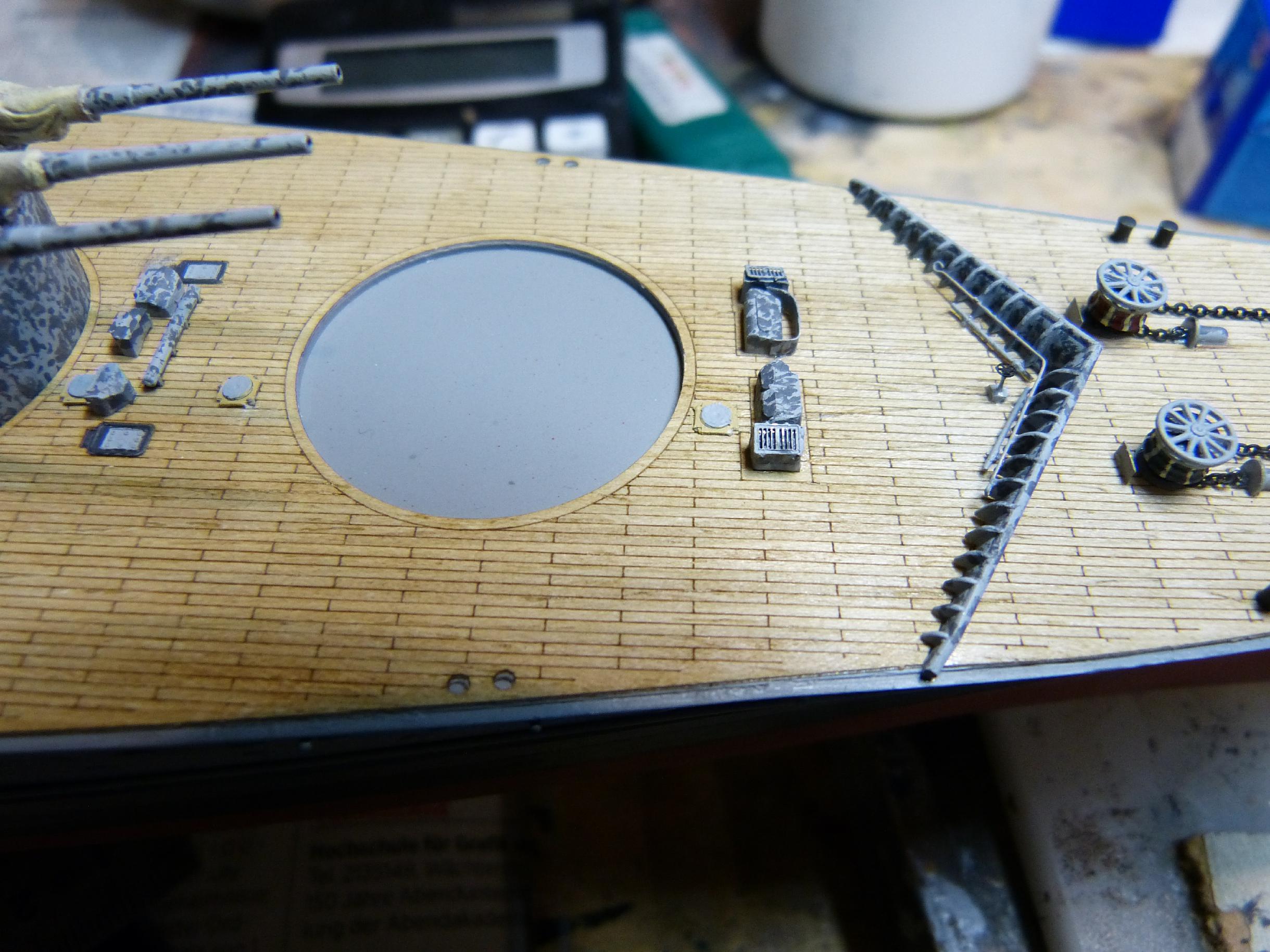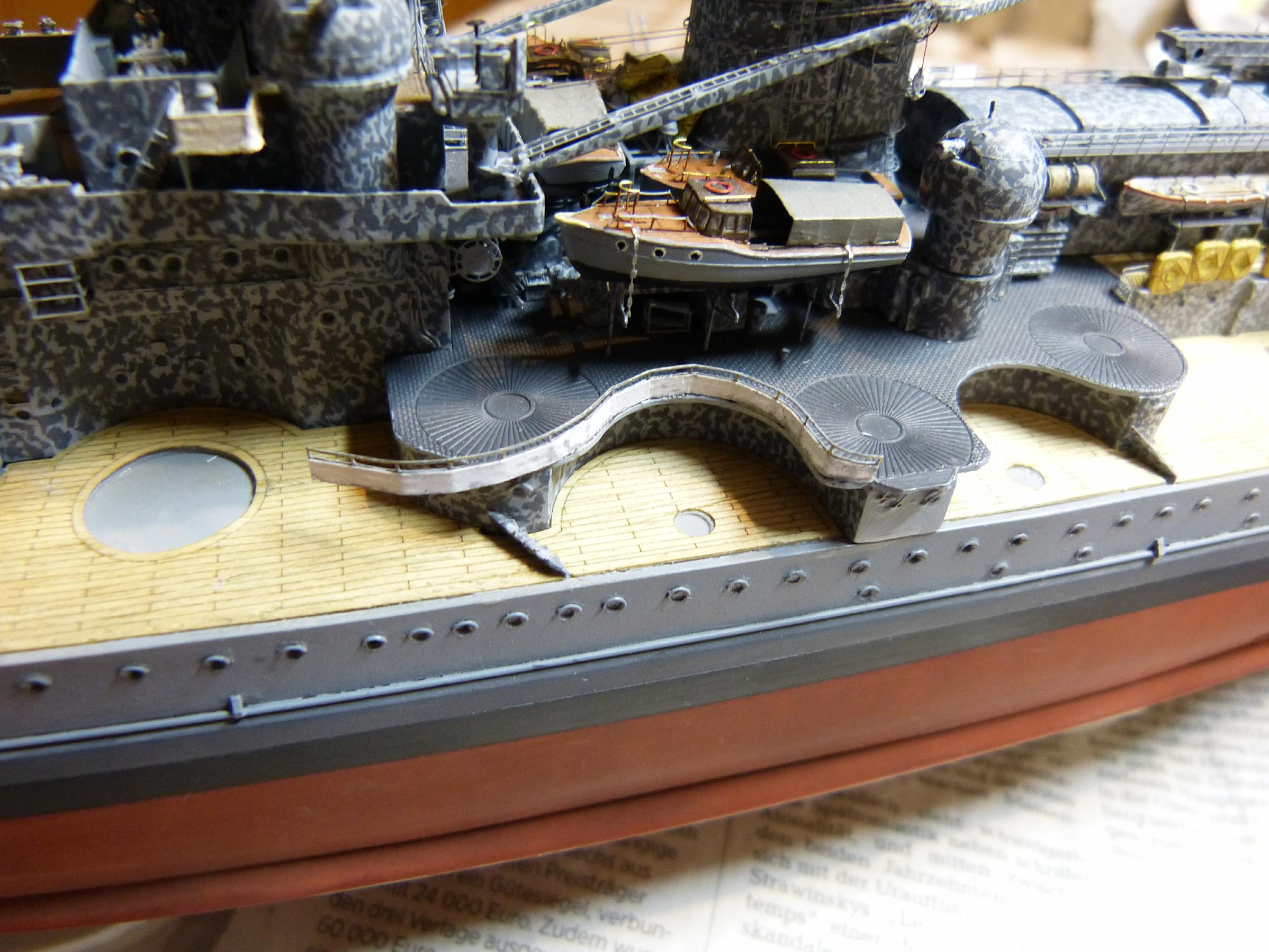 Die großen Reservebehälter sind eine Mischung aus Holz und dünnem Plastiksheet drumherum. Der Überhangkran das besagte Dragon-Ätzi, der Rest inkl. Torpedotransportwiege Fullscratch. Nebenbei habe ich dann noch die großen Kräne fertiggestellt (Dragon + KA-Ätzis + Rigging Black 0,135 mm) und positioniert. Die hinteren MA-Türme fanden nun auch ihren festen Platz.