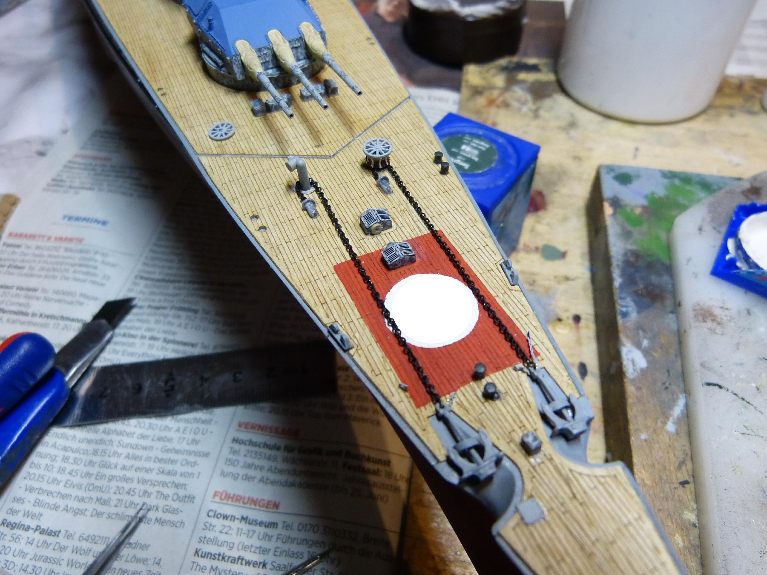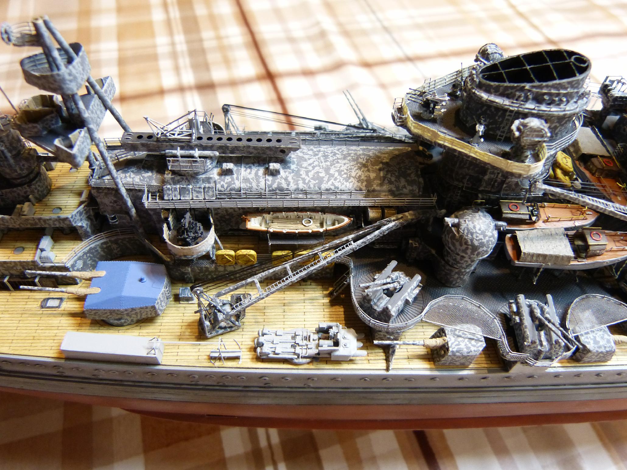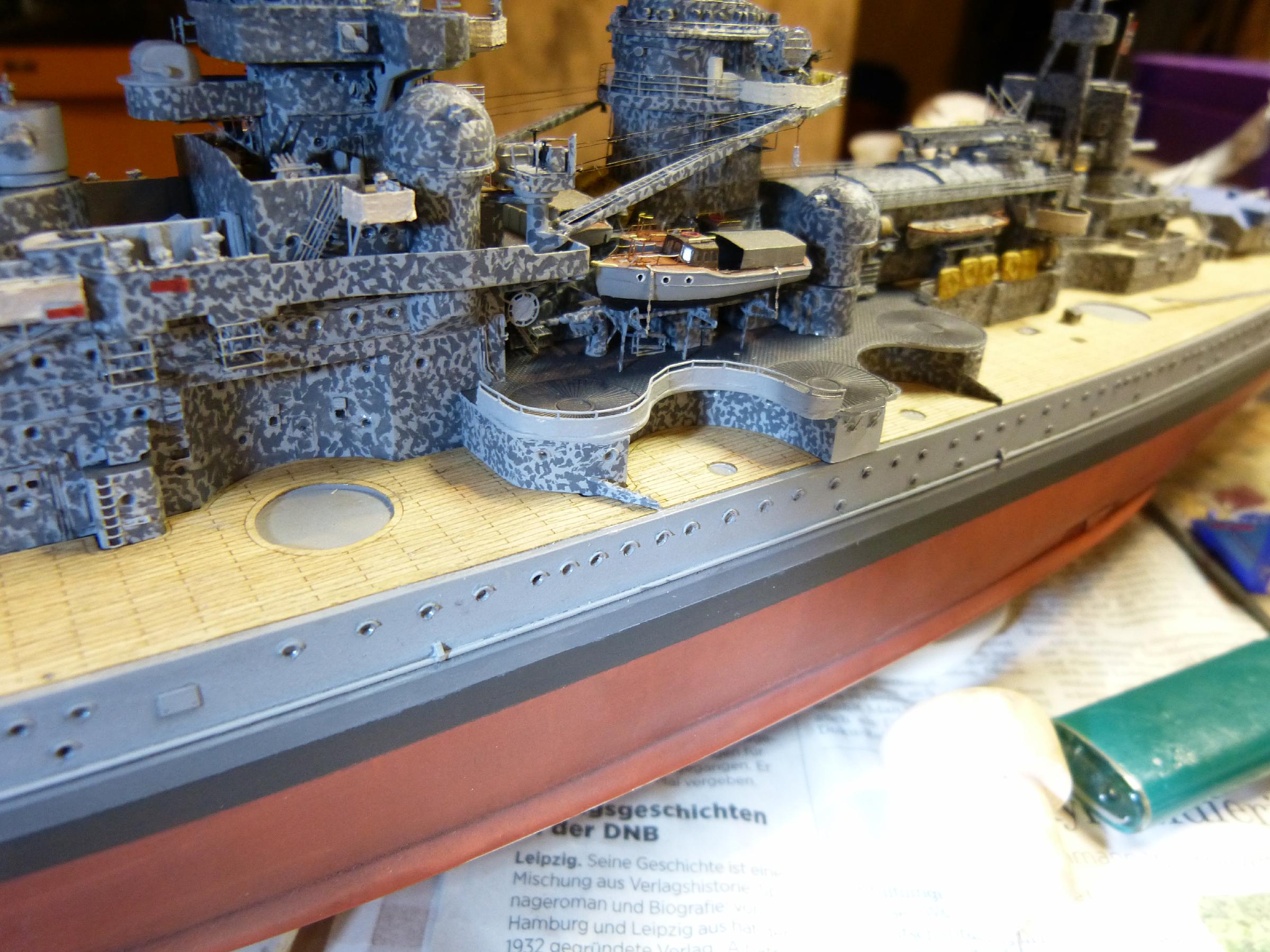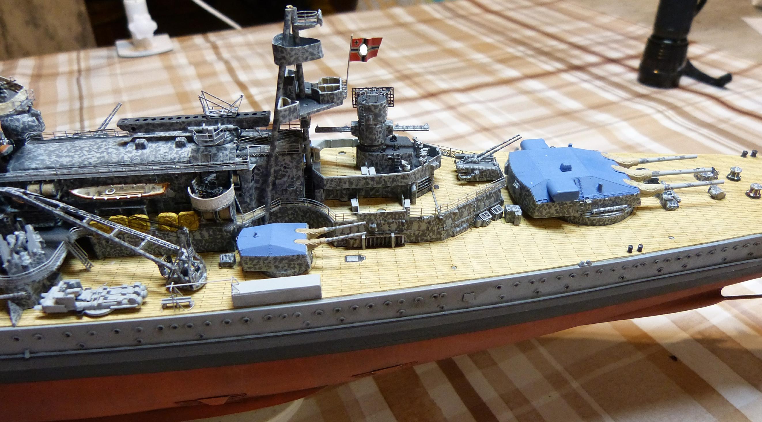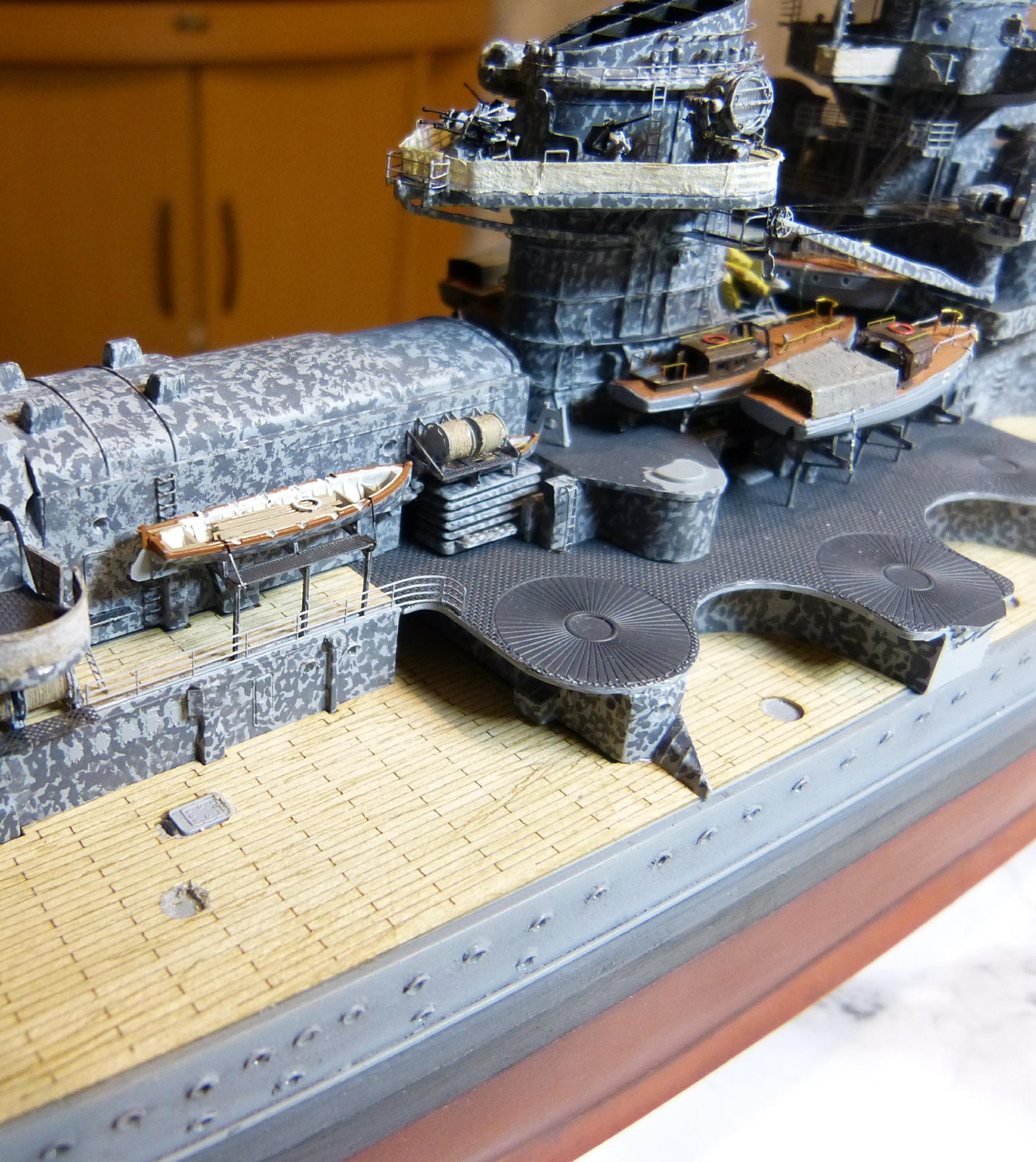 Die großen Reservebehälter sind eine Mischung aus Holz und dünnem Plastiksheet drumherum. Der Überhangkran das besagte Dragon-Ätzi, der Rest inkl. Torpedotransportwiege Fullscratch. Nebenbei habe ich dann noch die großen Kräne fertiggestellt (Dragon + KA-Ätzis + Rigging Black 0,135 mm) und positioniert. Die hinteren MA-Türme fanden nun auch ihren festen Platz.