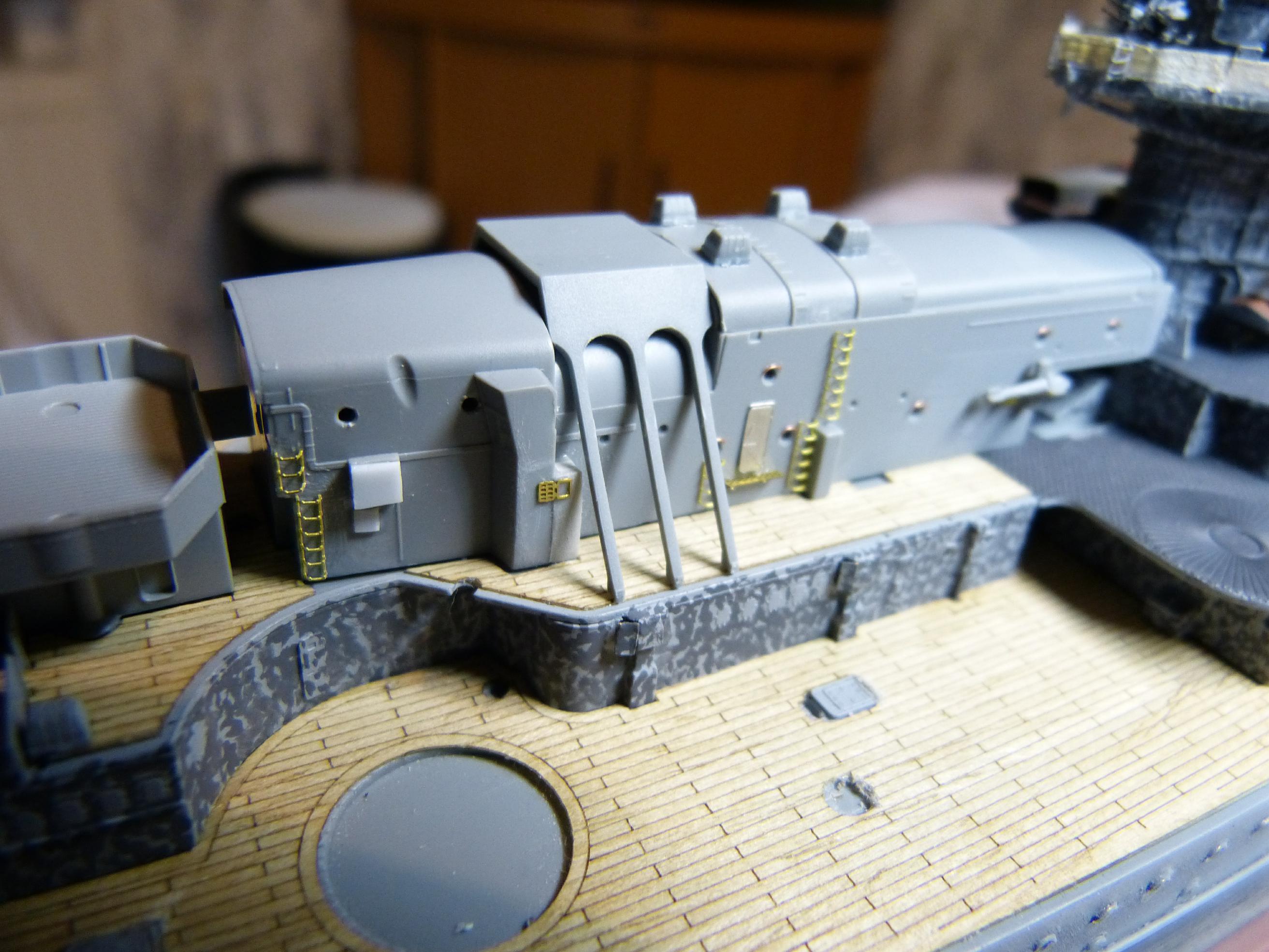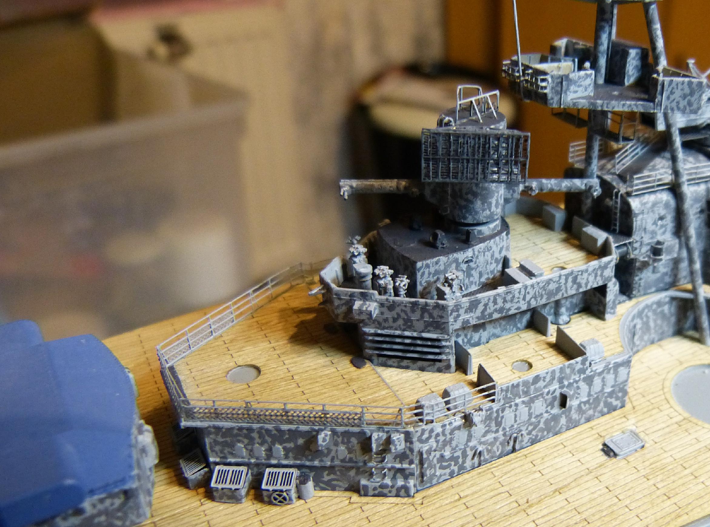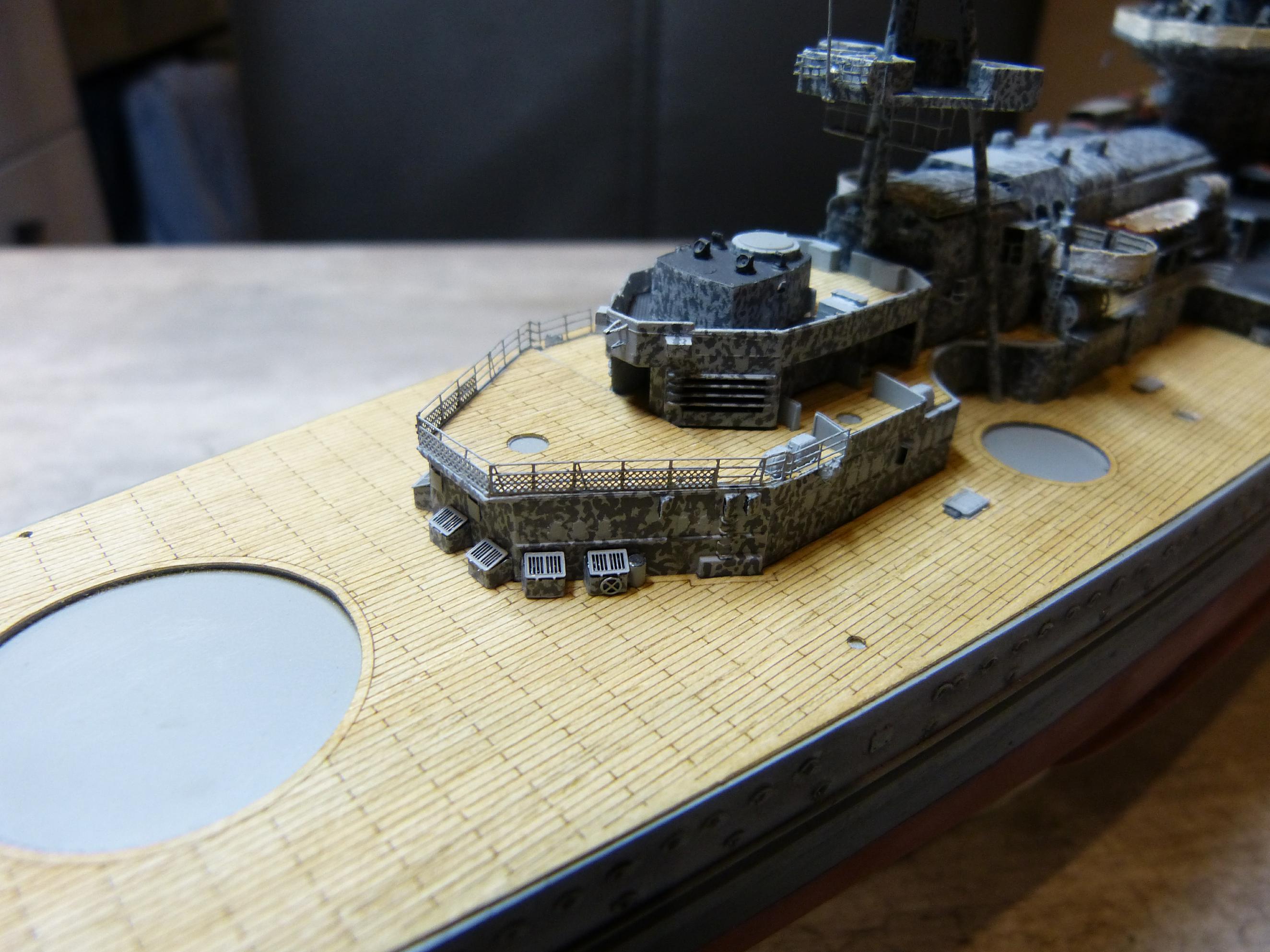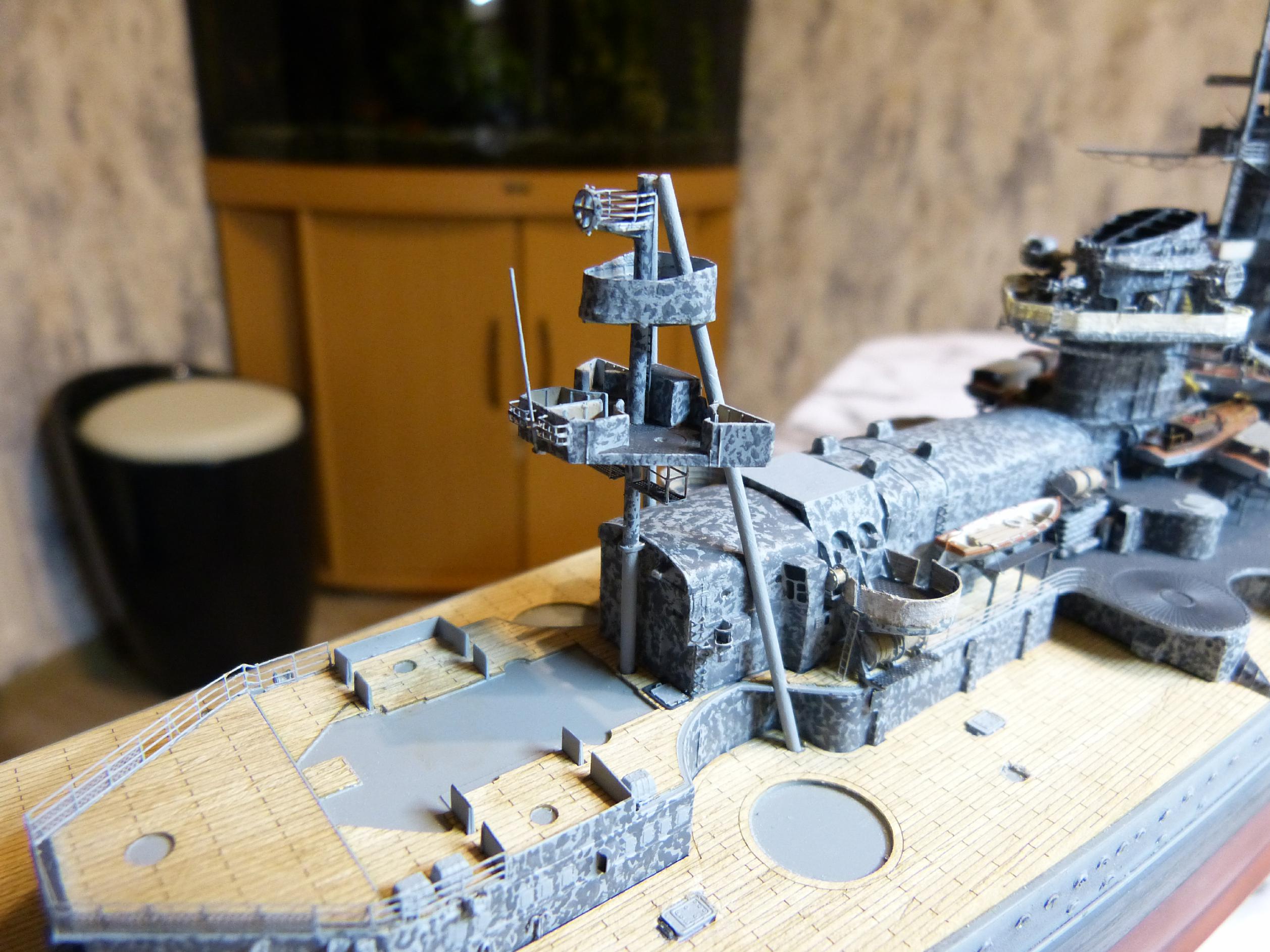 Die großen Reservebehälter sind eine Mischung aus Holz und dünnem Plastiksheet drumherum. Der Überhangkran das besagte Dragon-Ätzi, der Rest inkl. Torpedotransportwiege Fullscratch. Nebenbei habe ich dann noch die großen Kräne fertiggestellt (Dragon + KA-Ätzis + Rigging Black 0,135 mm) und positioniert. Die hinteren MA-Türme fanden nun auch ihren festen Platz.