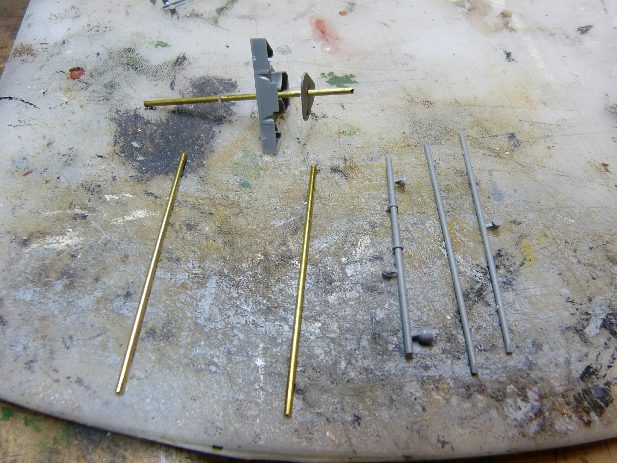 Beim Hauptmast wollte ich aber mehr Stabilität. Darum entschloss ich mich, die unteren Beine gegen Messingrohre auszutauschen. Diese gibt es in verschiedenen Stärken von Trumpeter. Durch meine Aufwertung der Torpedorohrsätze hatte ich noch einen passenden Bestand da. Das senkrechte Rohr gestaltete ich etwas länger, damit es noch bis ins Aufbaudeck hineinragt. Ansonsten wurden die Rohre so gut wie möglich den Plastikvorbildern angepasst.