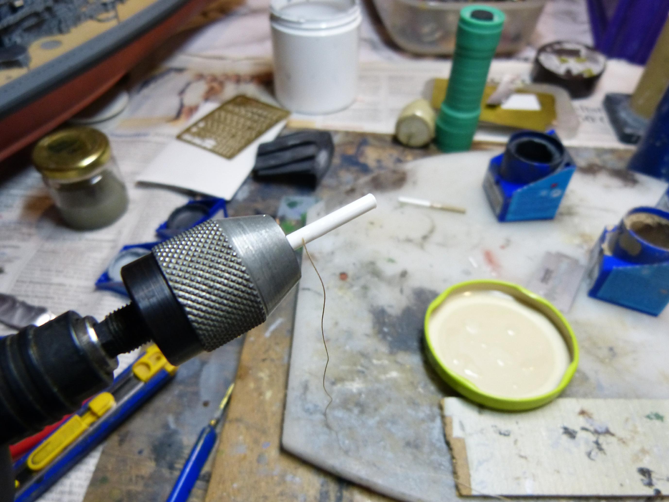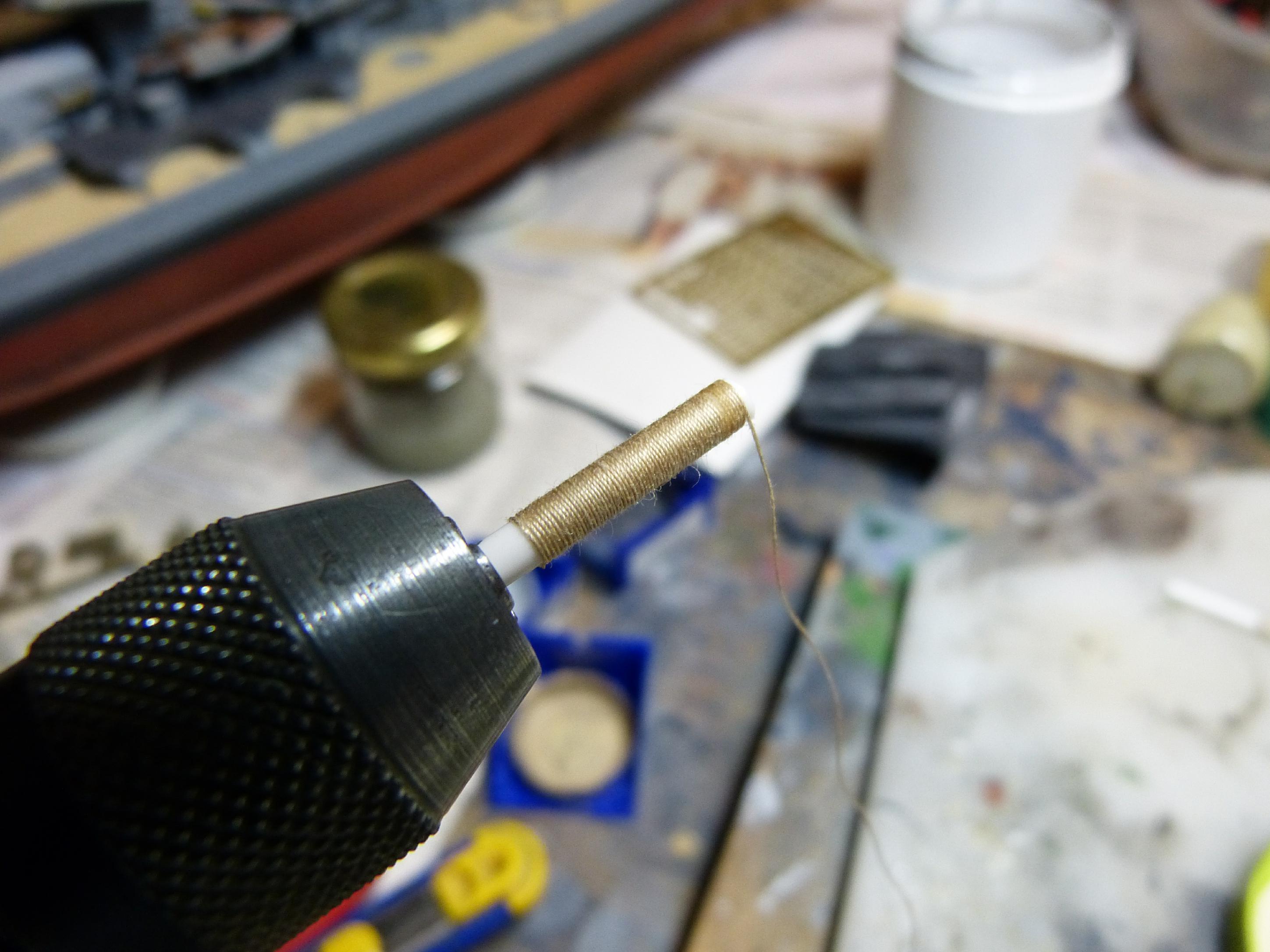 Benötigt wird etwas Plastiksheet (Rundstab) 2/3/4 mm. Die entsprechende Stärke für die gewünschte Trossenrollengröße in eine Bohrmaschine spannen. Das Ende von normalem dünnen Textilzwirn mit Sekundenkleber fixieren und warten bis es fest ist. Dann den vorderen Teil bis zum Ende mit Sekundenkleber bestreichen und sofort die Bohrmaschine mit niedriger Drehzahl rotieren lassen, dabei mit der anderen Hand den Zwirn so führen, dass er nebeneinander aufgespult wird.