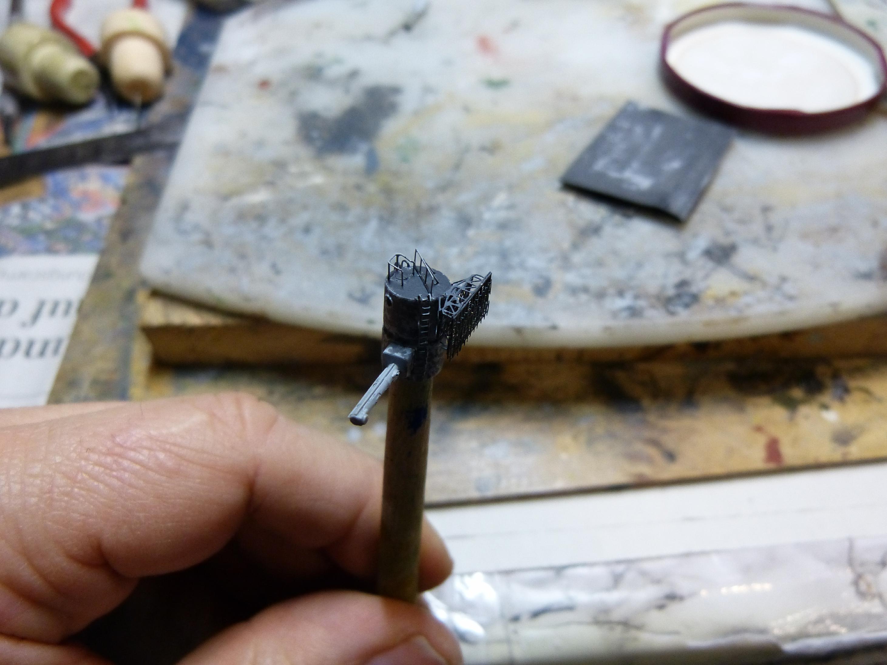Dann habe ich am achteren Leitstand weitergearbeitet, grob war er schon fertig. Vor allem fehlten noch der große E-Messer mit FuMO27 und das diverse Veteran-Beobachtungsequipment.