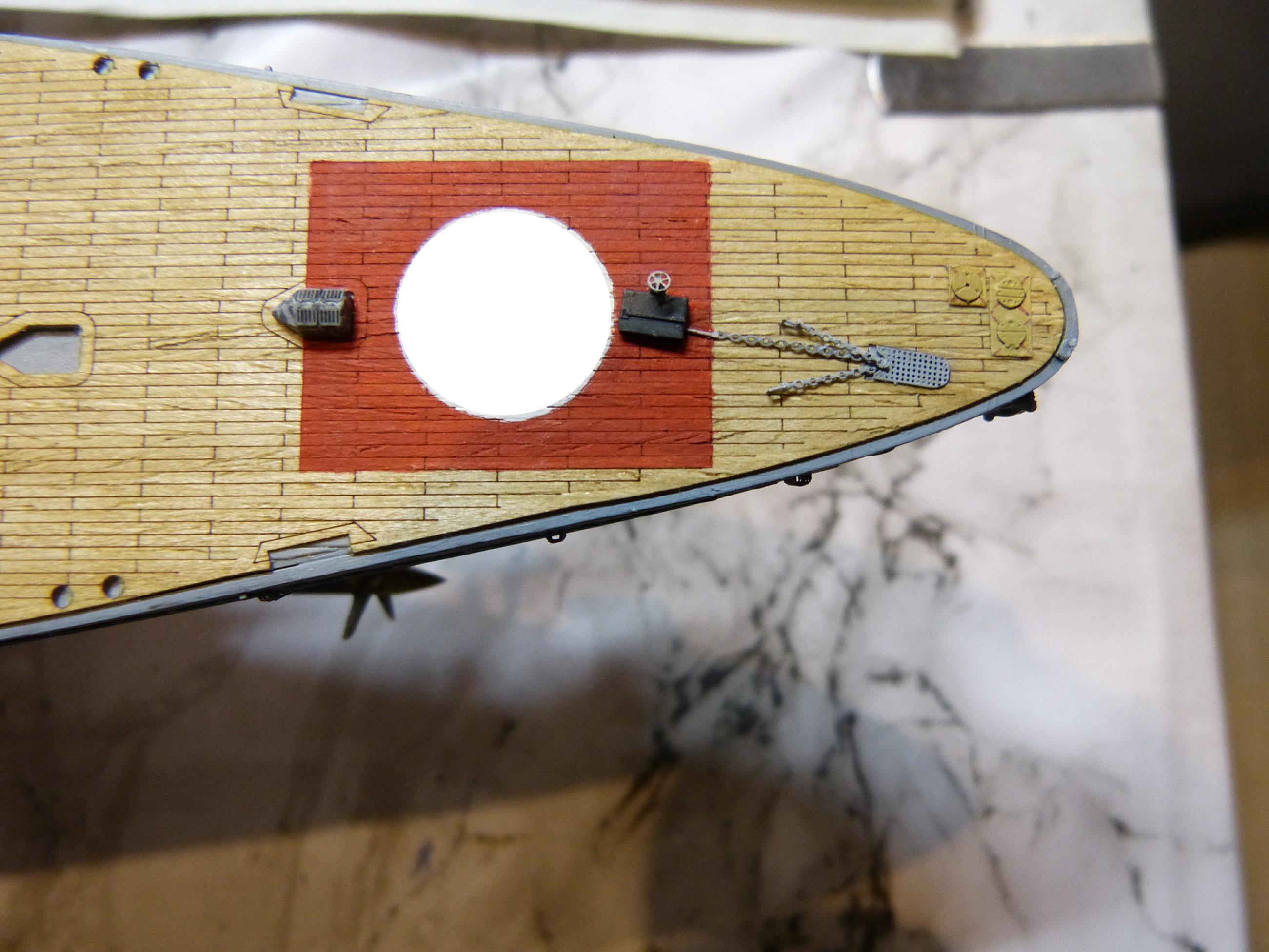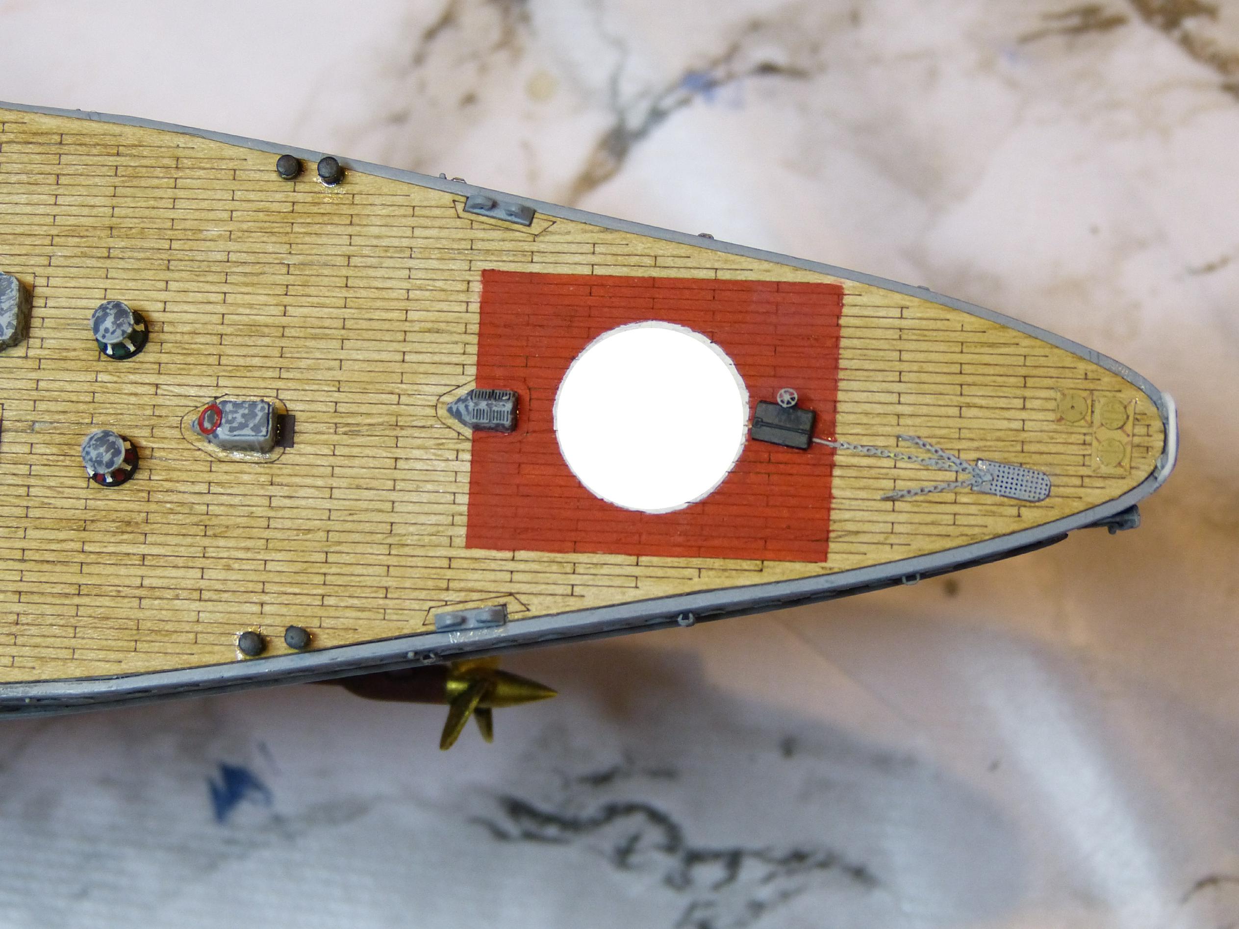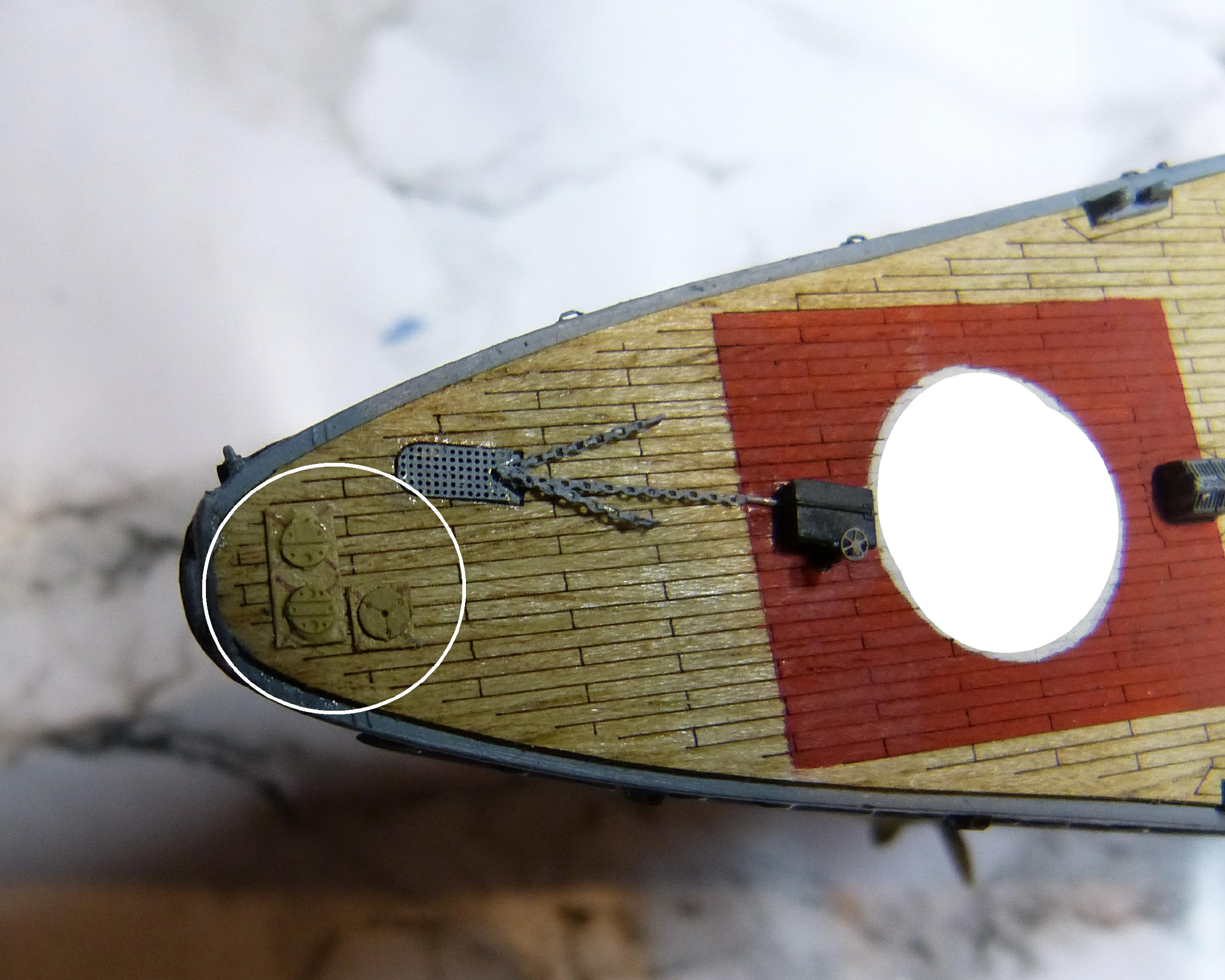 Dann nahm ich mir die Ankereinrichtungen (und parallel die vorderen Kleinaufbauten) vor, zunächst die vordere. Zur Info, seit September 1939 führte SH keinen Bugreserveanker mehr, bei GU wurde sogar beim Umbau des Stevens die entsprechende Klüse weggelassen. Offenbar war dieser 3. Anker vorn verzichtbar, oft wurde ein Ausbau „aus Gewichtsgründen“ angegeben.