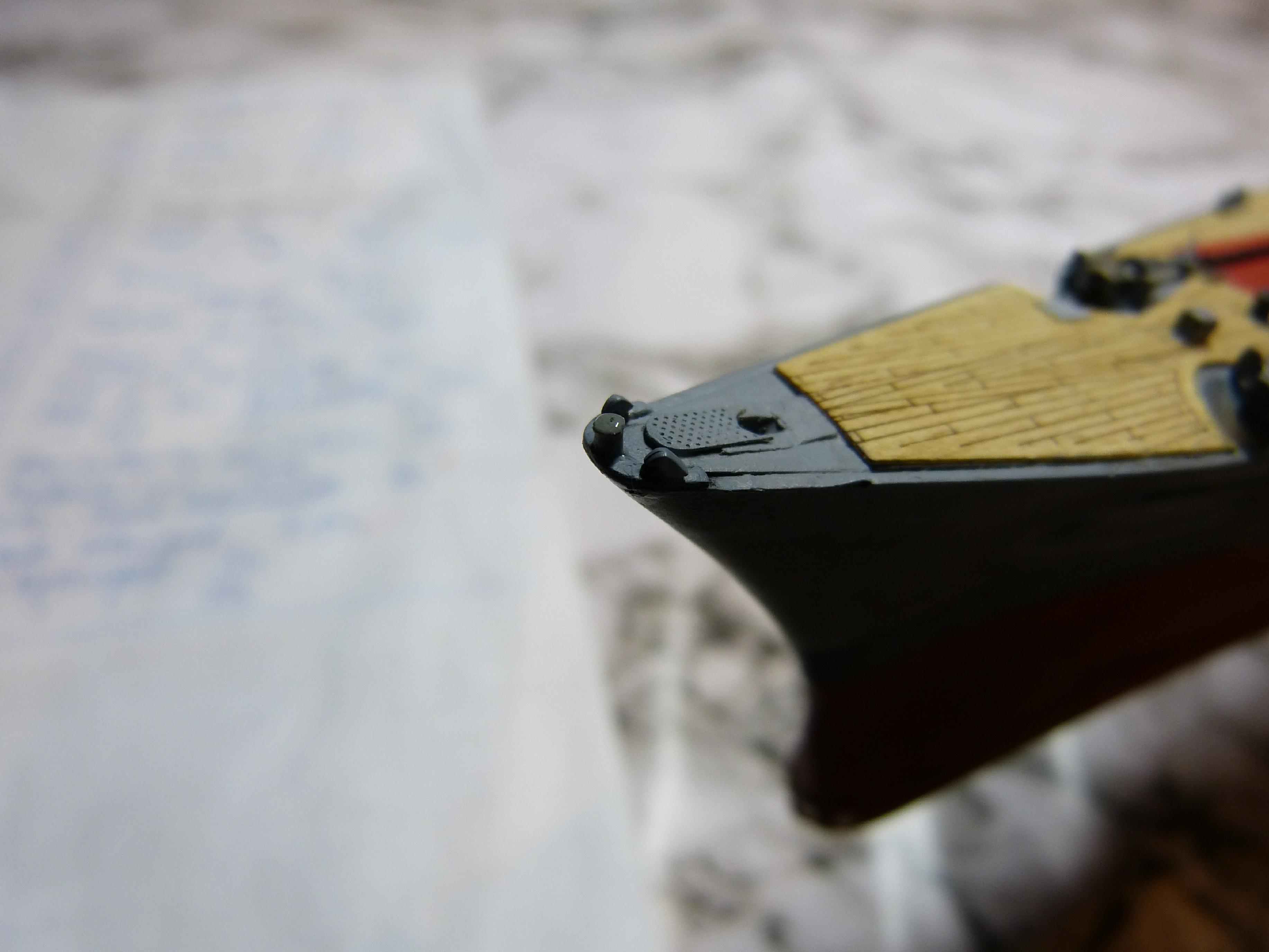 Wie schon erwähnt, habe ich parallel die Kleinaufbauten und den großen Wellenbrecher im Bugbereich gefertigt, zum Teil Dragon-Original, zum Teil Scratching. So auch die Kleinteile am Bug ganz vorn.