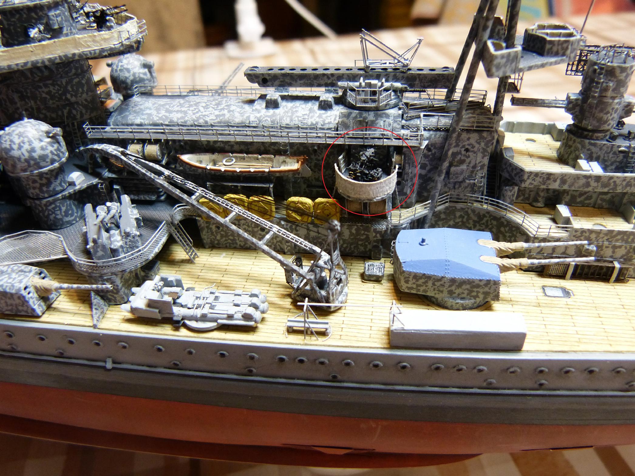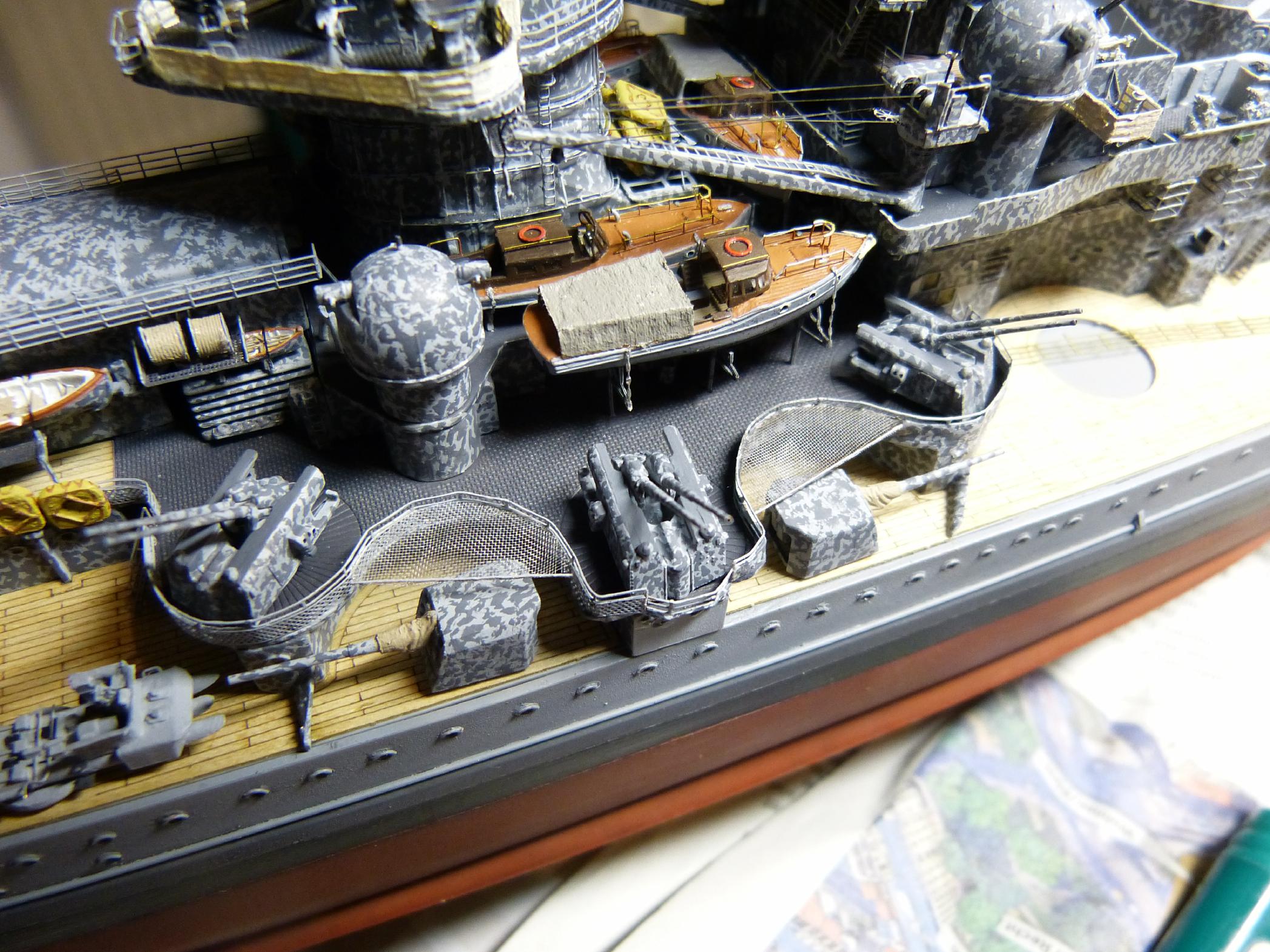 Danach dann mit Tarnung versehen und weiteres nach Stand 1942 platziert, Trossenrollen, Flakplattformen. Diese sind im Bausatz (für 1943) enthalten, nur die zugehörigen Ätzis für die Reling sind m.E. nicht verwendbar (schwer zu installieren – sieht dann Sch. aus). Ich habe sie aus Resten improvisiert und mit bewährter Klopapier-Persenning ausgestattet.