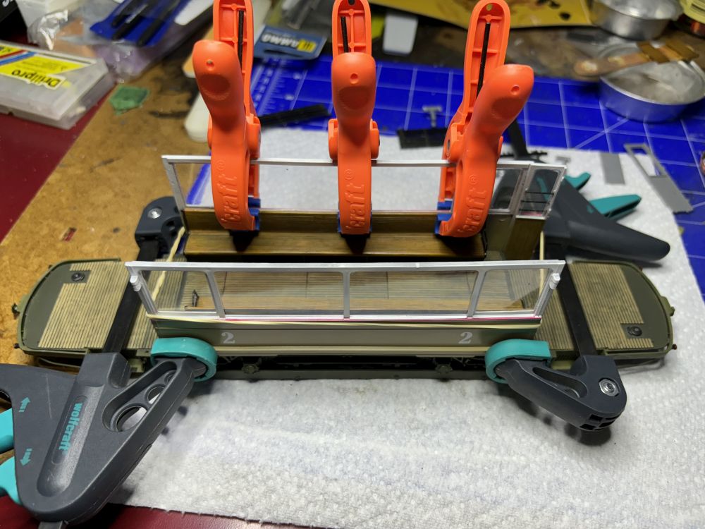 Dann habe ich die Seitenwände ans Fahrgestell montiert und verklebt. Mit hilfe einiger Klemmen ging dies ganz gut von der Hand.