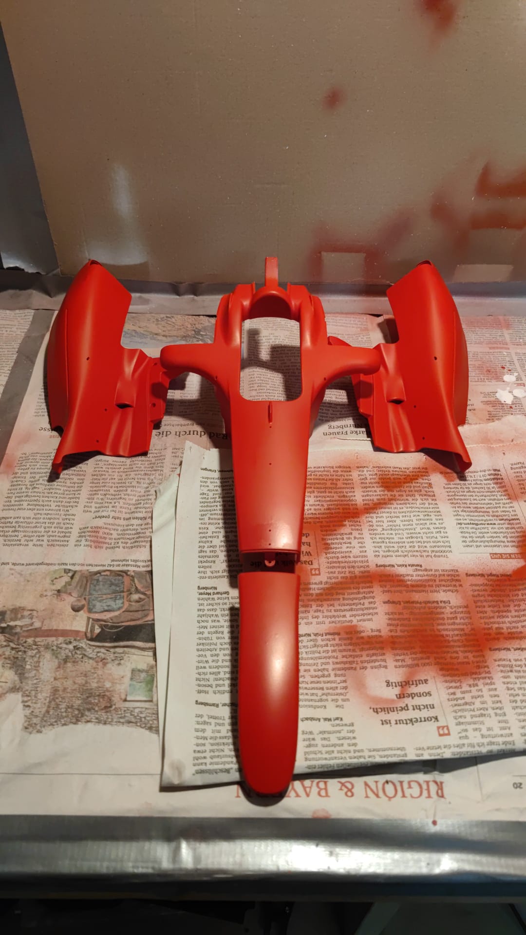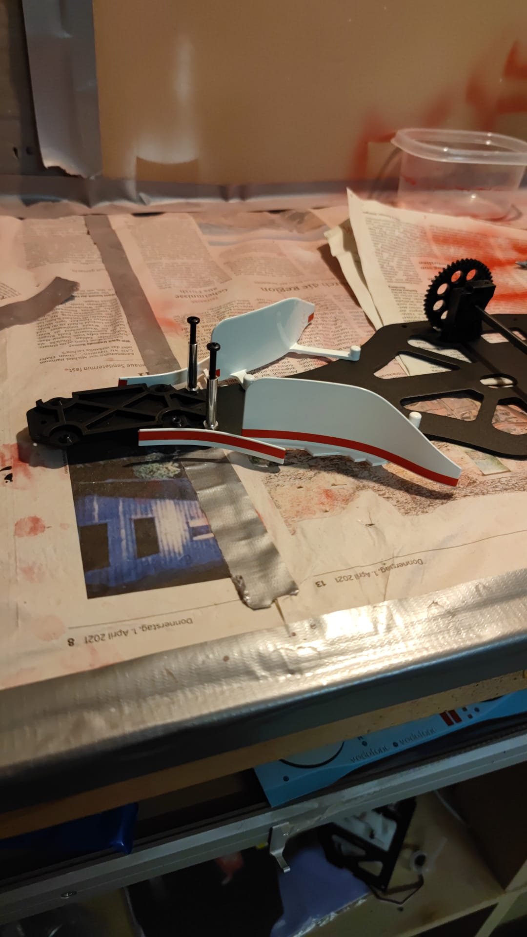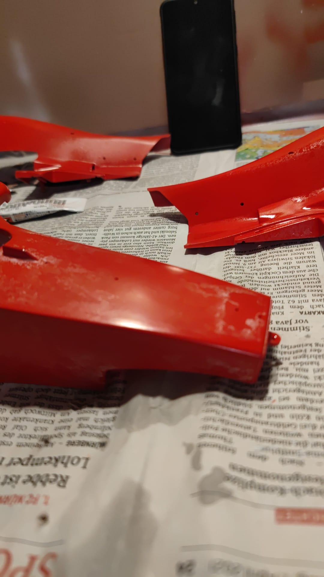 der größte Zeitfresser ist die Wartezeit zwischen den Lackiergängen..... ich will mir ein weiteres Desaster ersparen. Heute Nachmittag will ich die zweite Schicht Klarlack aufbringen. Der Heck- und Frontspoiler sind leider Fertigteile, welche man nicht in Einzelteile zerlegen kann, um es wie den Rest der Karosserie selbst zu lackieren.