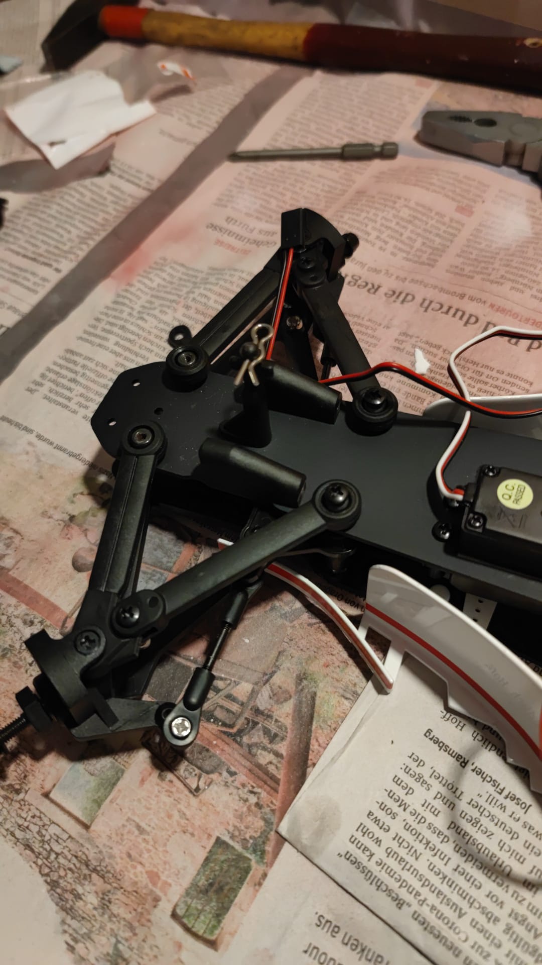 Ich hatte ja die vordere Aufhängung ja fast fertig, aber kam dann nicht weiter. Ok, Bauplan weggelegt und den Ordner mit der ausführlichen Bauanleitung gelesen. Auf Seite 130+ steht dann, dass der Bauplan anhand eines Prototypen erstellt wurde, dieser aber abgeändert wurde und man unbedingt anhand der Bauanleitung arbeiten soll.