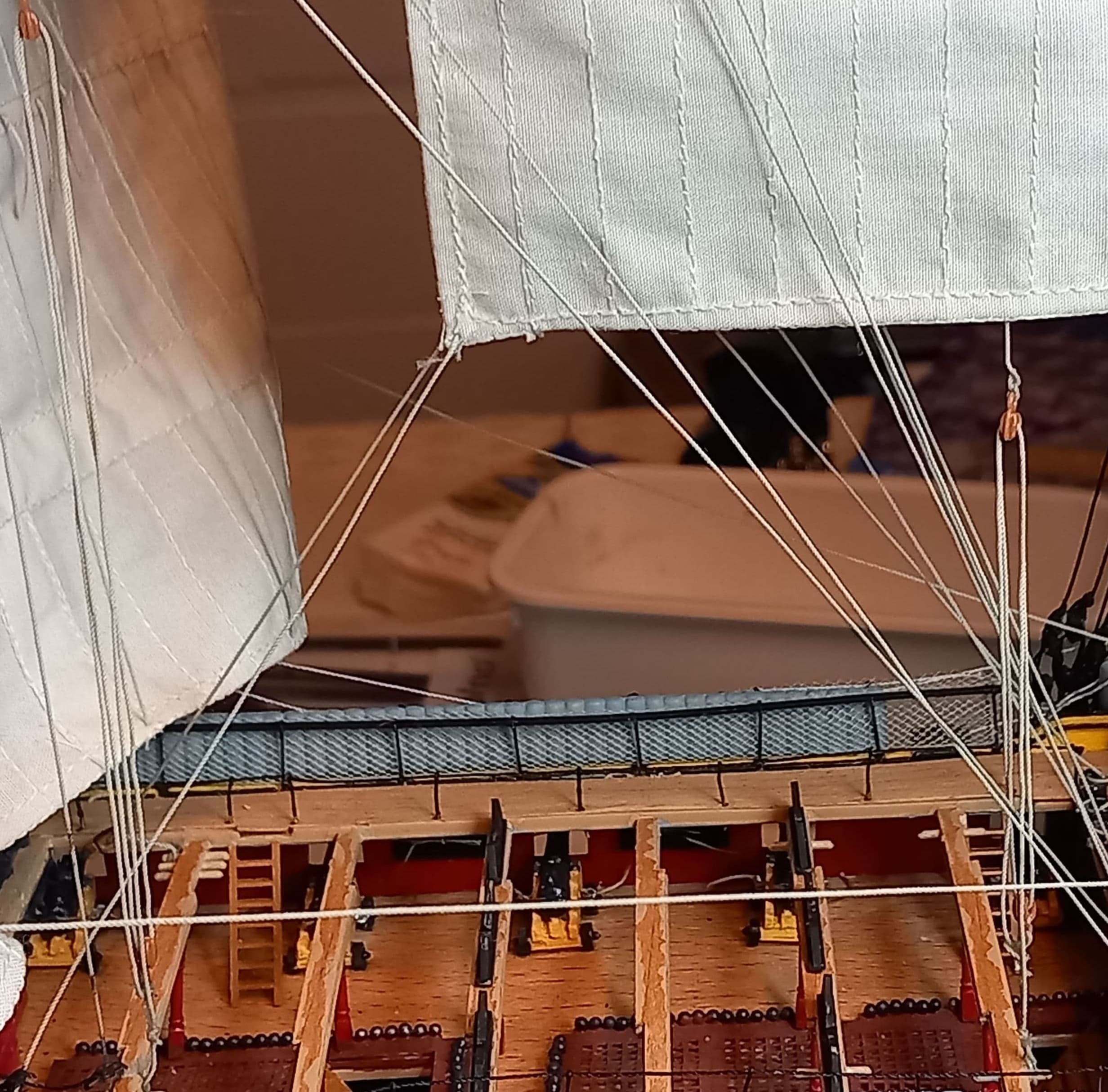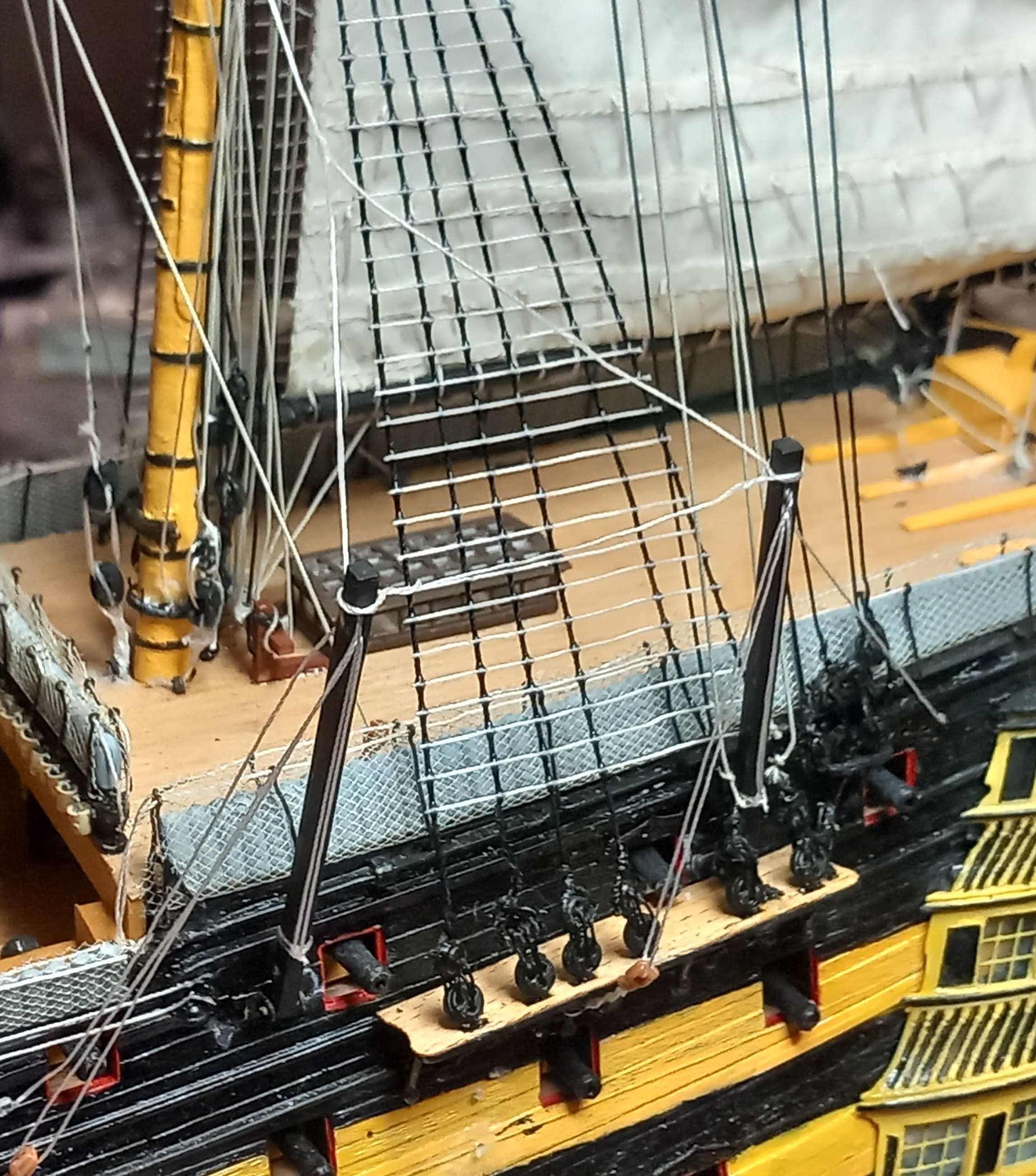 Die Stückpforten habe ich nicht, wie von Heller empfohlen, mit dünnem Draht befestigt sondern ich habe Tau in 0,25 mm Stärke verwendet. Erscheint mir authentischer. Das Ganze war wochenlange (Straf)Arbeit. Auf jeden Fall nähert das Projekt sich dem Ende zu. Noch die Anker und etwas Besatzung. Gruß Ingo