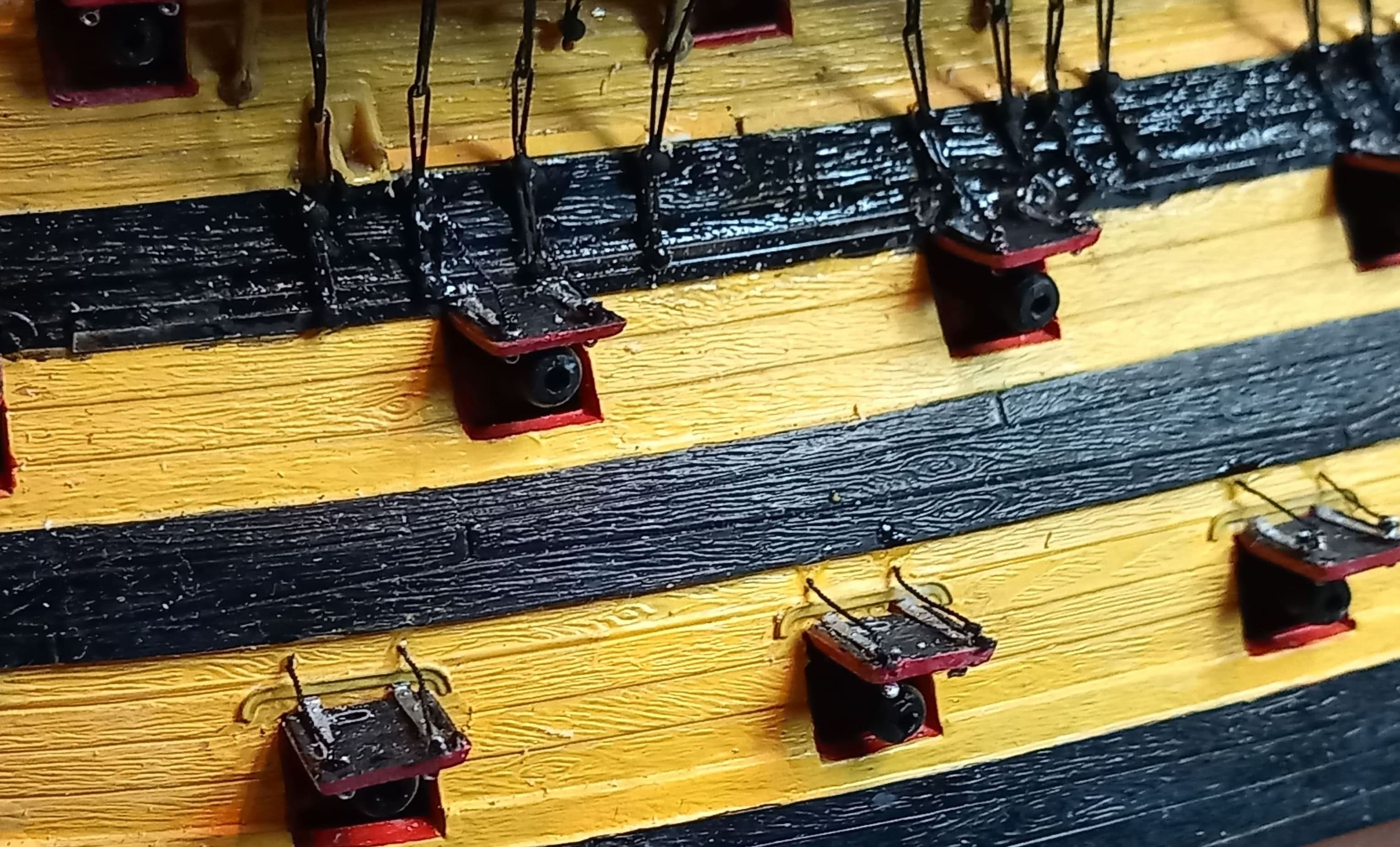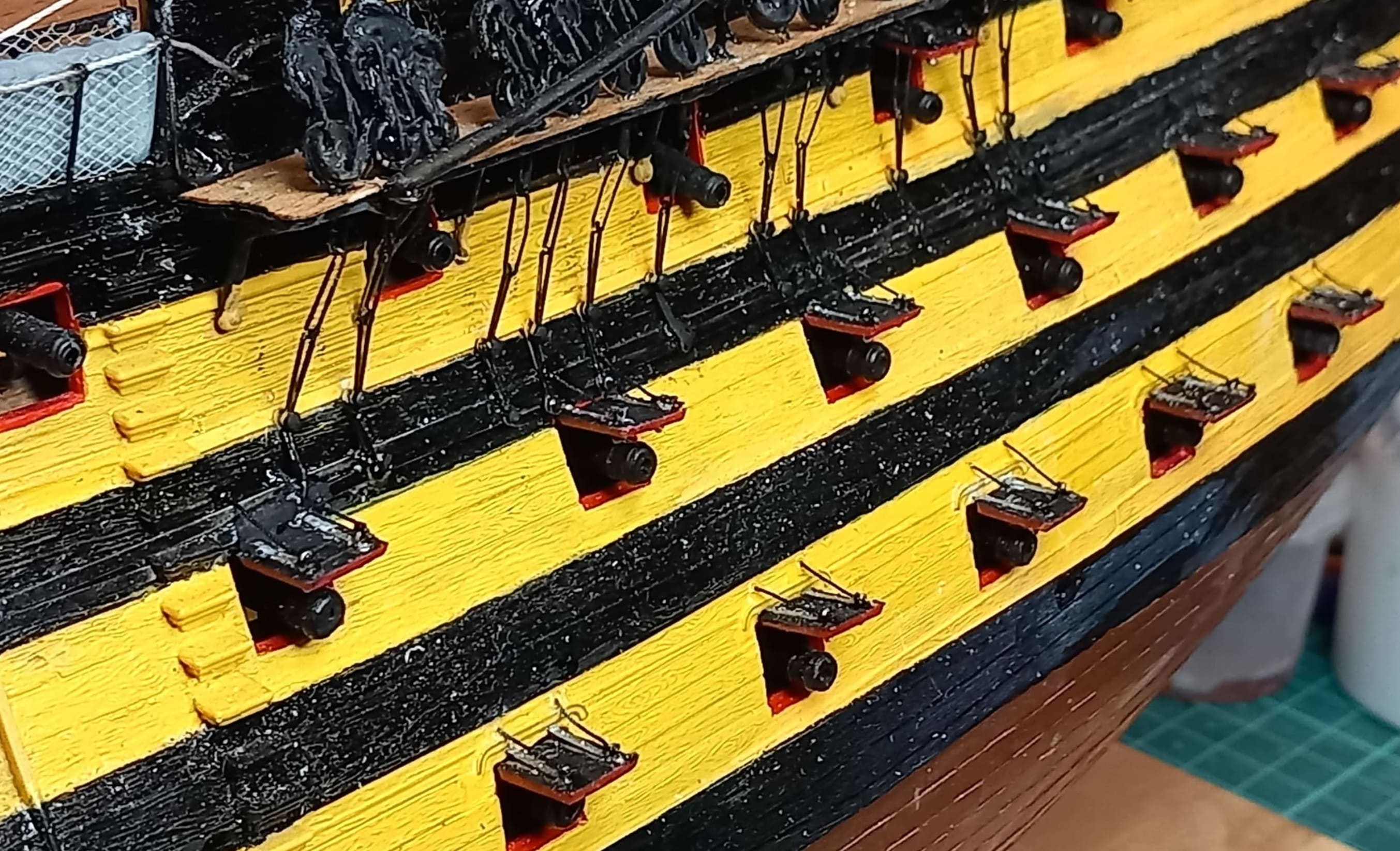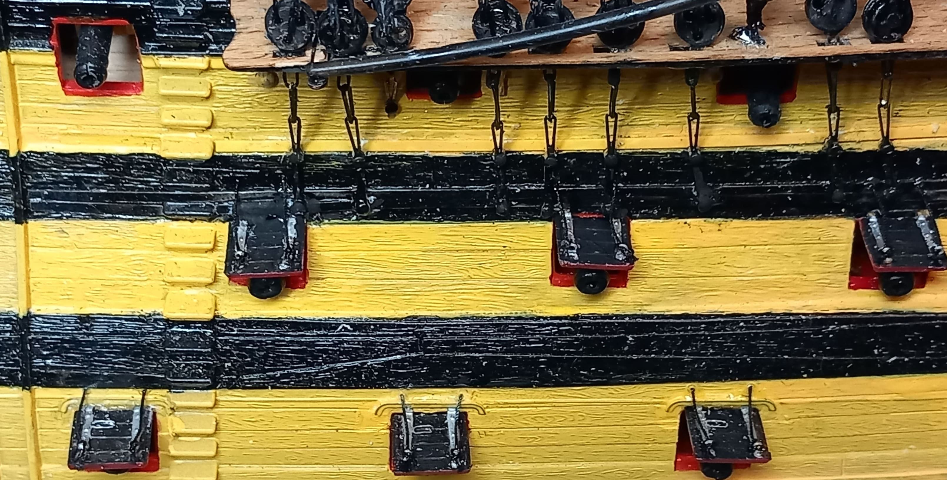 Hallo. Wieder langsam weitere Fortschritte. Die Stückpforten sind angebracht. Dazu wurden 80 Klüsendeckel, 80 Beschläge und 316 Augbolzen angebracht.