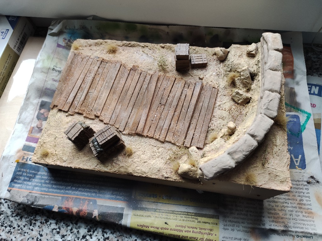 So gestern habe ich zumindest den Boden weitergehend fertig gemacht. Nach dem mit Airbrush der Sand verschieden Lackiert würde, habe ich den Holzkisten mit Ölfarben eine Maserung verpasst und mit Aquas Darkearth den Boden-Brettern, anschließend gab es noch Pigmenten, Grasbüschel und trockene Seeschaumäste. Das ganze wurde dann mit Weißleim-Wasser fixiert. Ich überlege allerdings erneut nochmal ein aar Pigmente ein zu massieren. Was sagt ihr?