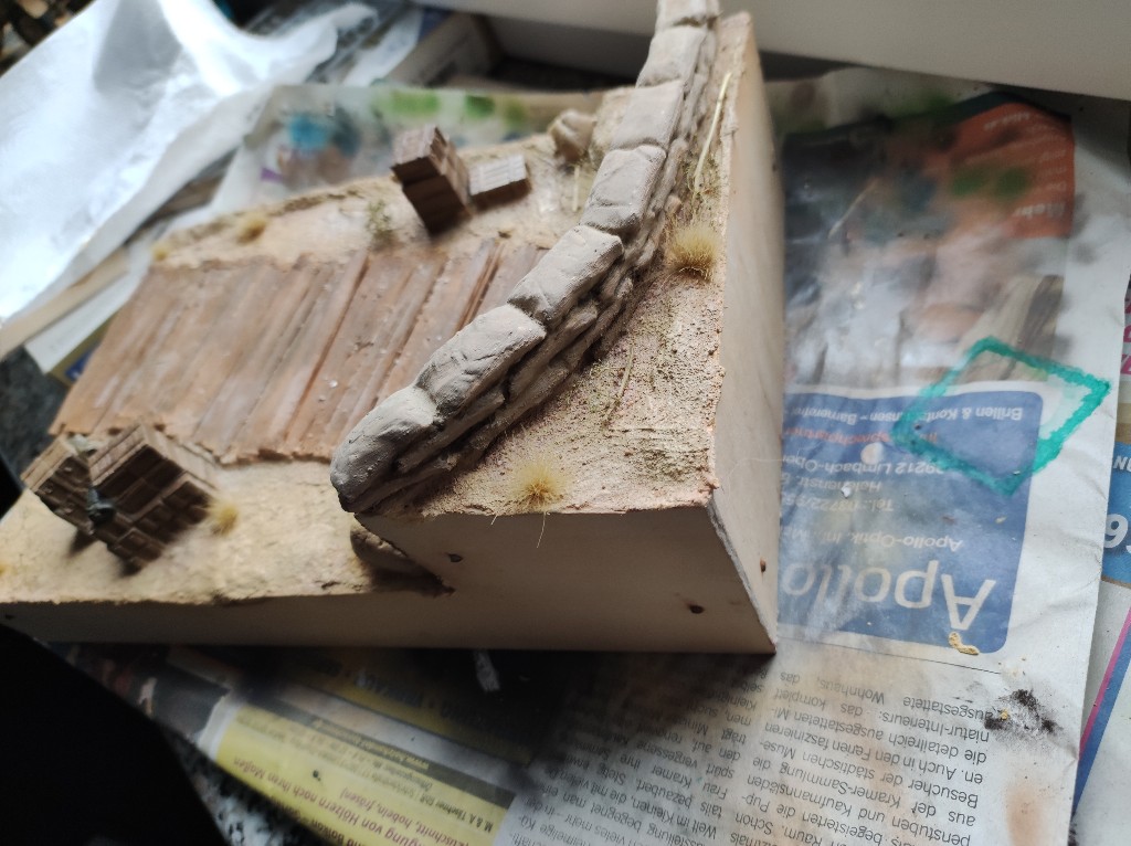 Gestern habe ich die großen Lücken an der Sandsackmauer geschlossen, in dem ich diese mit Gips verschlossen habe und überstände mit einem feuchten Pinsel beseitigt habe.