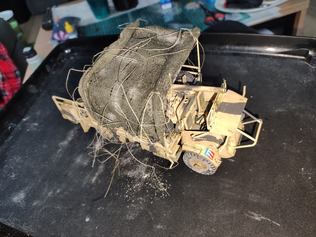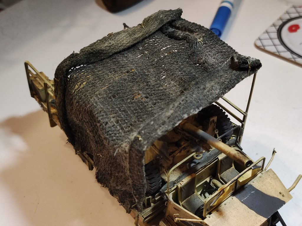Die nächsten Punkte sind erstmal ein Pinwash und das Tarnnetz, so wie ein paar Planen, die Rampen und das Ersatzrad. Auch die Gewehre fehlen noch.