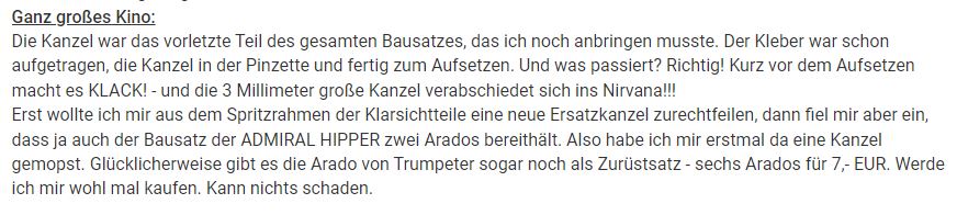 20 Monate (!!!) ist es her, als mir beim Bau der Admiral Graf Spee die transparente Kanzel des Bordflugzeugs aus der Pinzette sprang und sich nicht wiederfinden ließ: