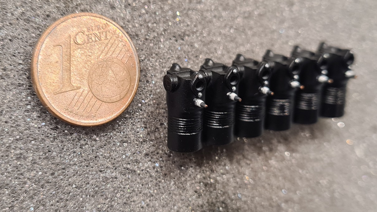 Für Ventilstangen aus Metall wurde das Palstik zuvor für alle Ventile an den entsprechenden Stellen aufgebohrt. Die Stangen sind hinterher "Nickel Silver Rods, 0.45mm" von Albion Alloys. Jeder der 6 Zylindern hat am Ende 2 Ventilstangen, je eine rechts und eine links.
