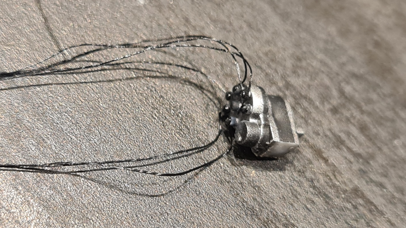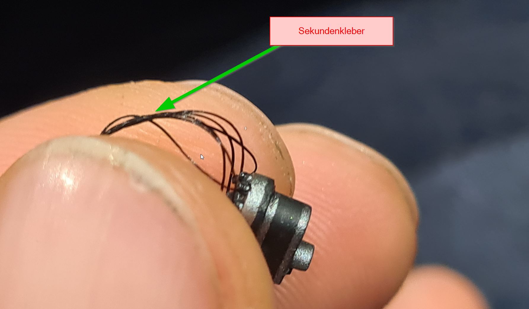 Ich hatte es erst mit dünnen Drähten und einem dünnen Plastikstück als Kabelkanal probiert, aber die Drähte haben das nicht mitgemacht und sahen unschön aus. Ich habe dann auf einen elastischen schwarzen Faden gewechselt, der auch für die Verspannung genutzt wird. Hier oben im Bild das Produkt von Infini. Klappt aber sicher ebenso mit Uschi.