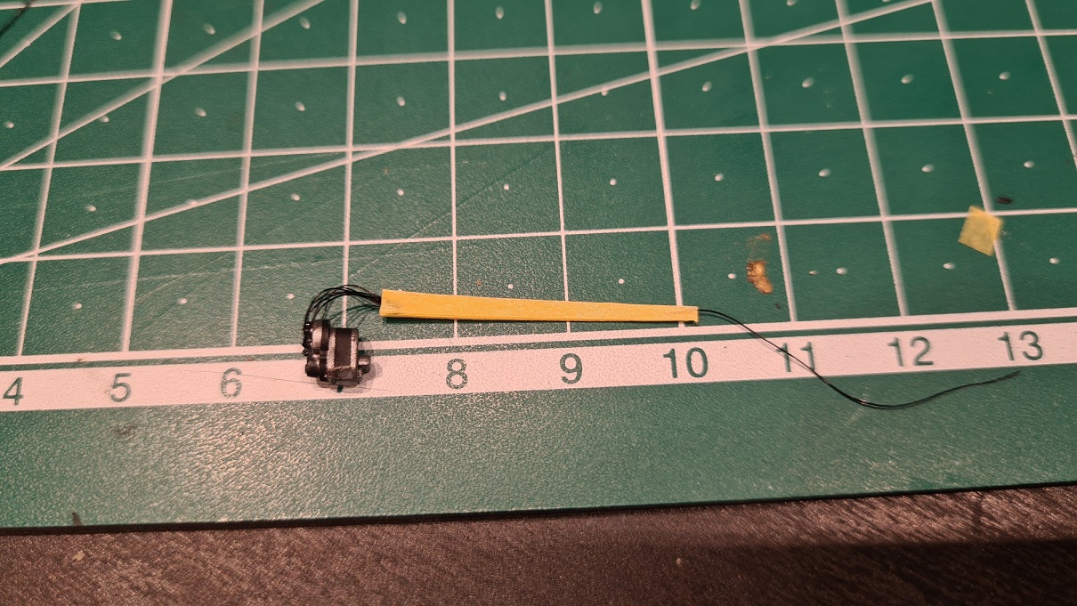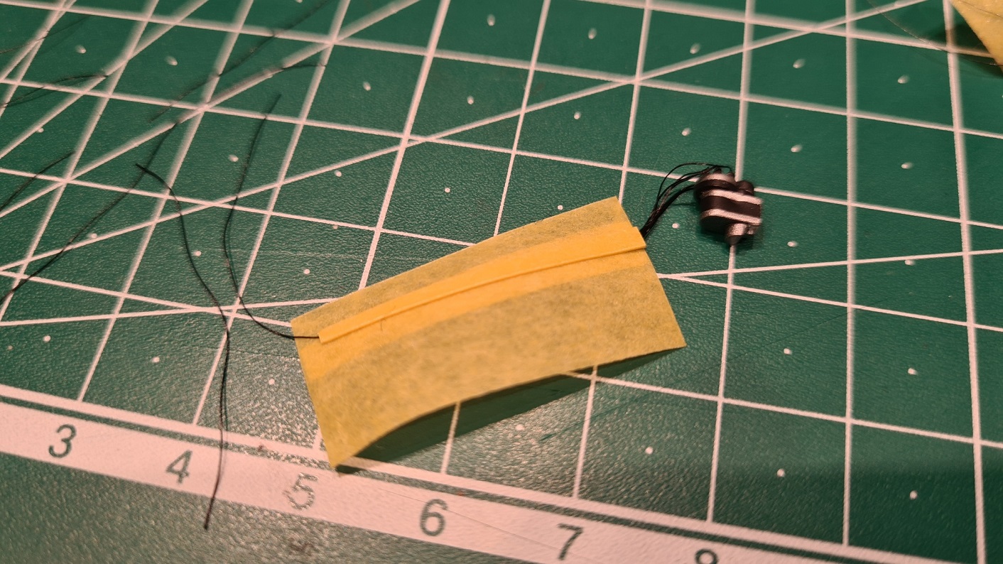 Für den Kabelkanal habe ich 3 Lagen Tamiya Maskierband übereinandergeklebt, die letzte Lage falsch herum, also Klebefläche auf Klebefläche. Dann passend ausgeschnitten. Hierauf wurde dann der Kabelstrang aufgeklebt. In etwa so: