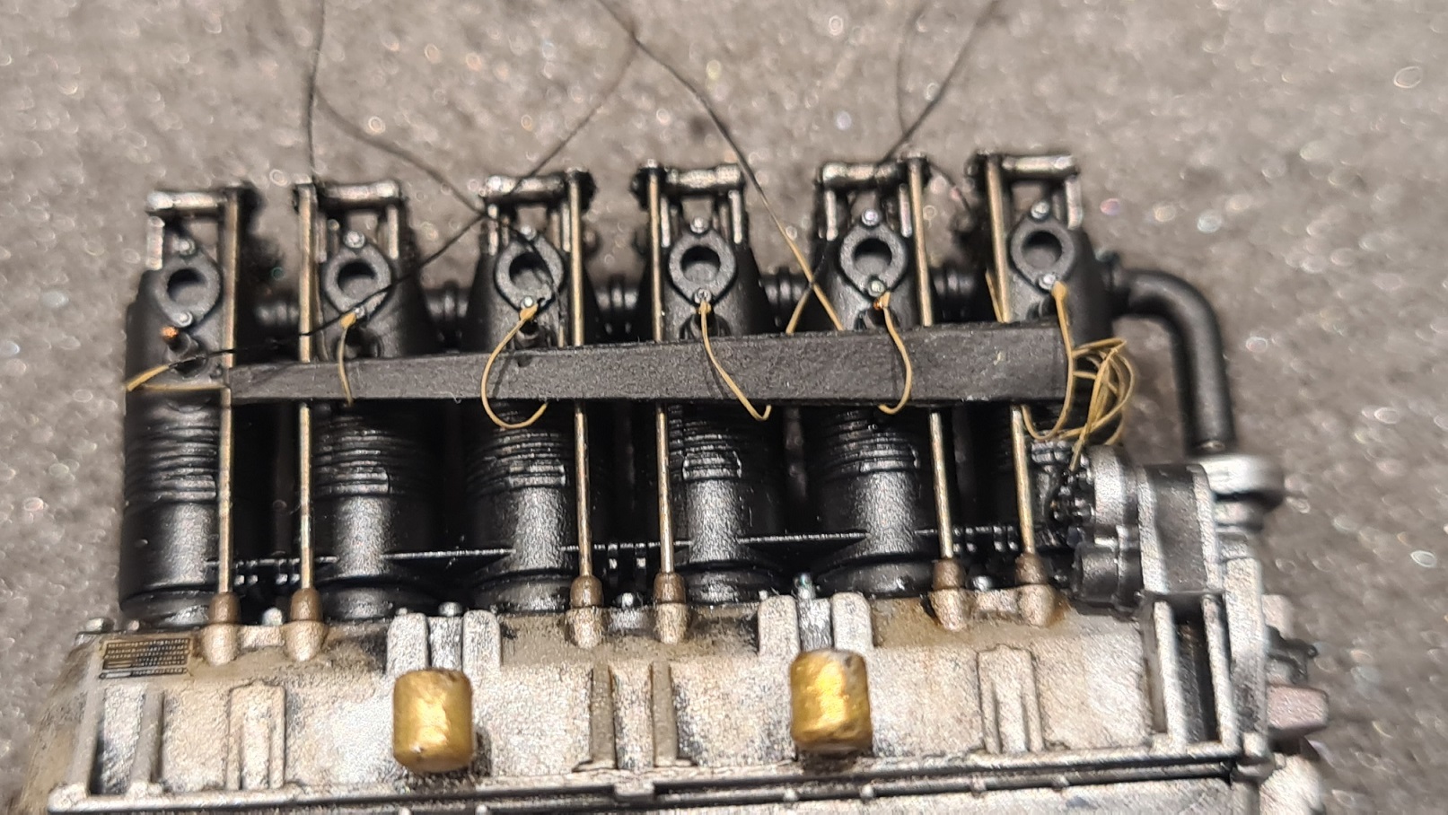 Das Masking Tape, sprich der Kabelkanal, wurde ganz einfach schwarz lackiert. Also Magneto einkleben, Kabelkanal etwa in Position bringen. An die ersten 5 Zündkerzen wurden Fäden geklebt. Für die 6. Zündkerze kommt der Faden schon aus dem Kabelkanal.