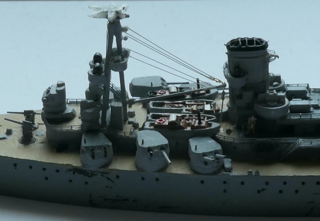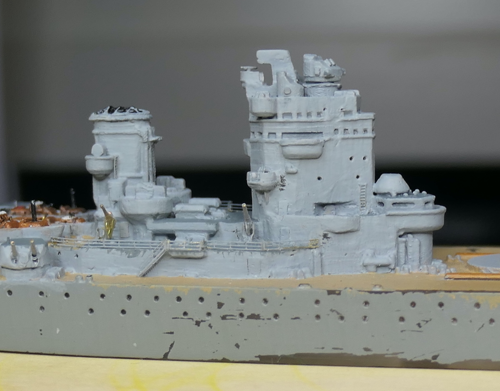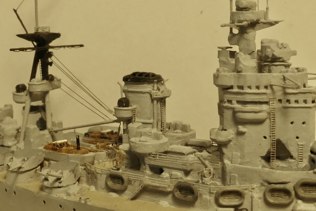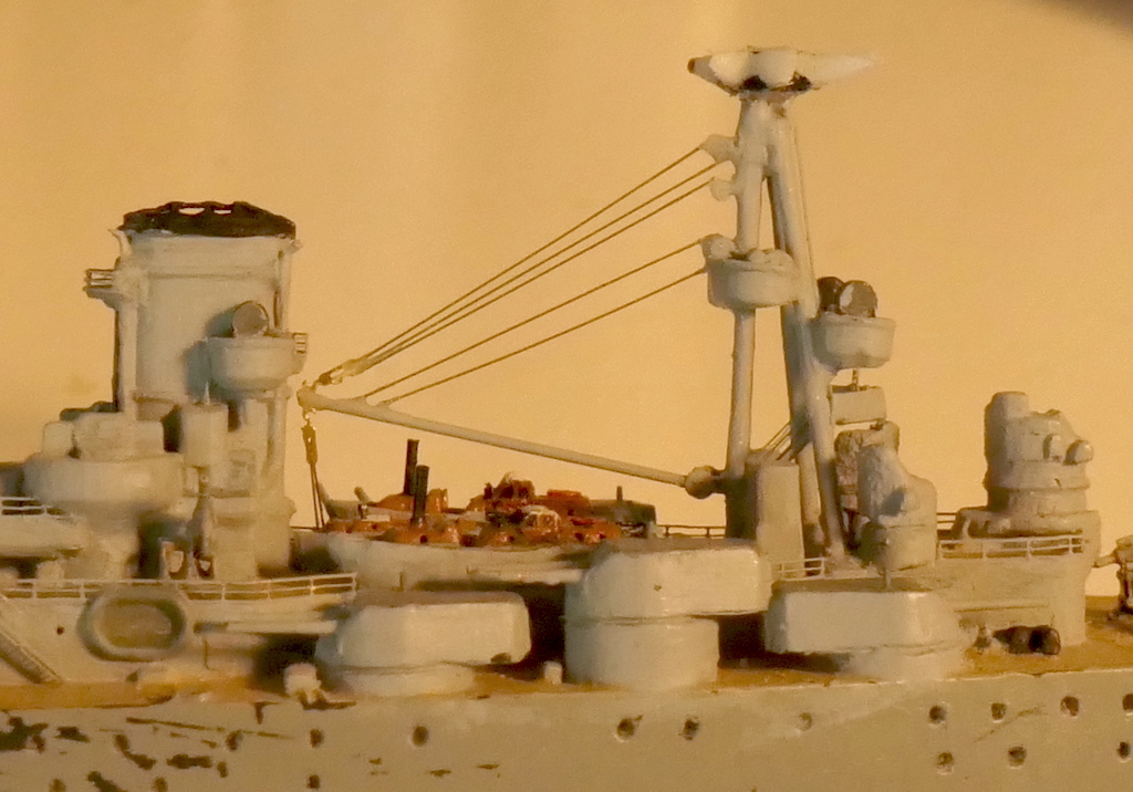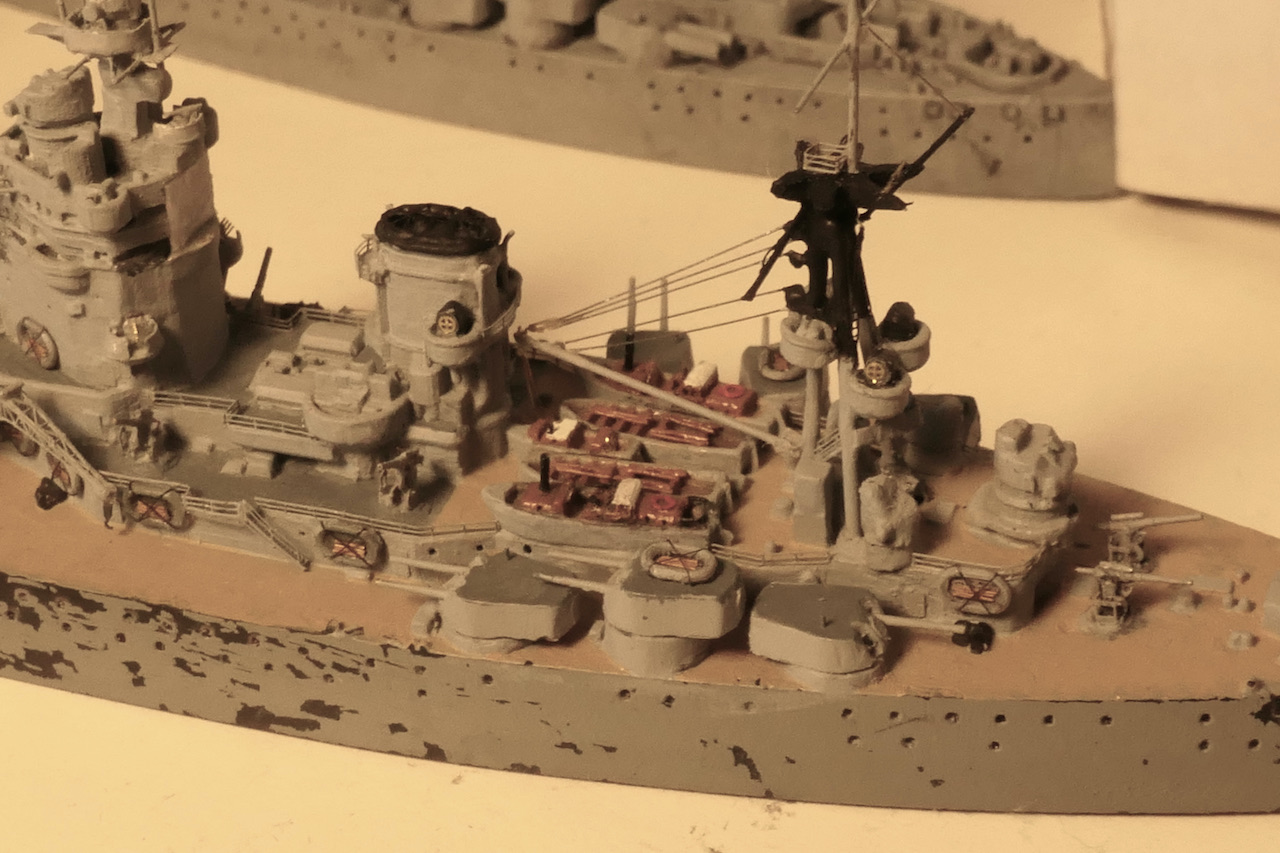 Kleine Anmerkung zum Modell: Zu sehen ist neu die schwere Artillerie mit den Lafetten so wie sie vor den ersten Salven gegen die Bismarck ausgerichtet waren. Bemalen werde ich sie demnächst mit meiner kürzlich erworbenen HS Ultra - mit dem Pinsel muss ich grundsätzlich einfach zu viel Farbe auftragen bzw. sind homogene Flächen bei dem Massstab sehr schwierig. Bin gespannt, ob die Arbeit mit der Airbrush meine Erwarten erfüllt.