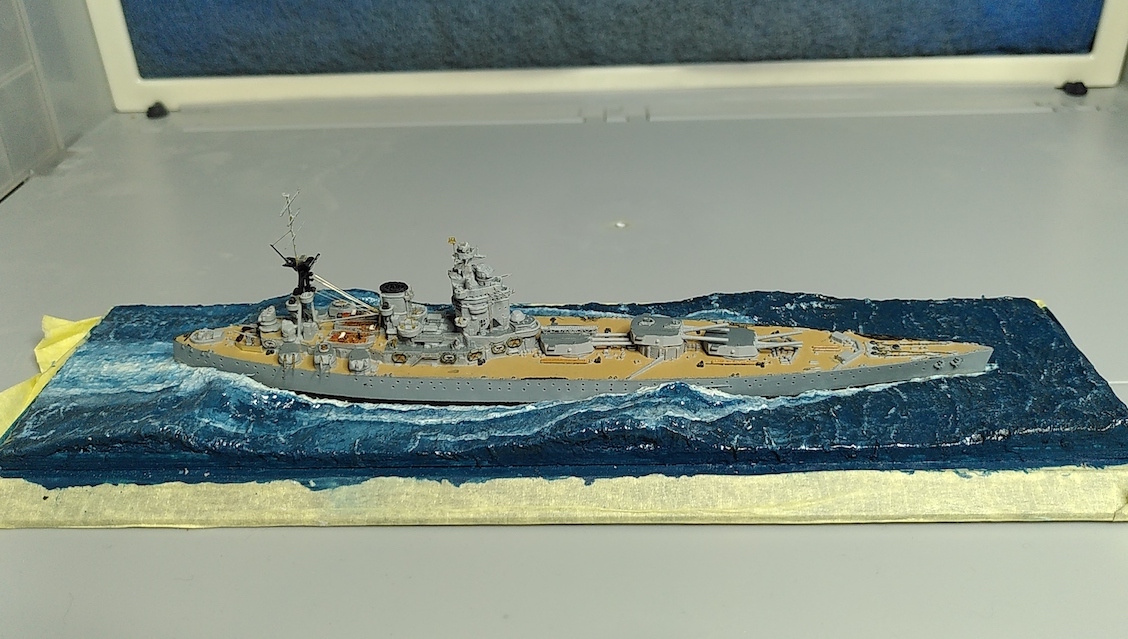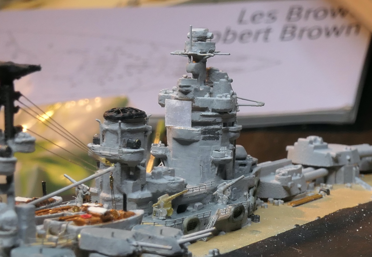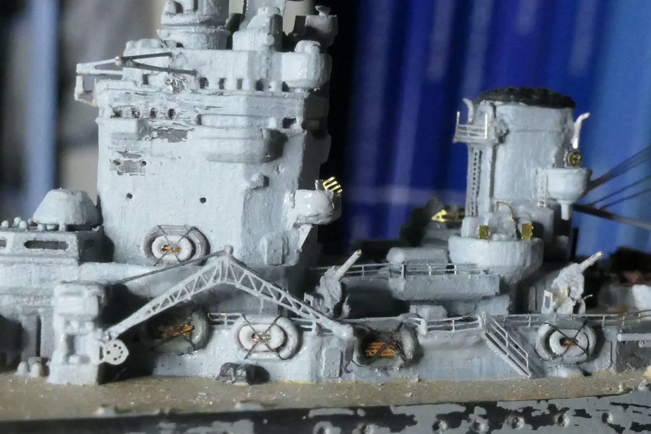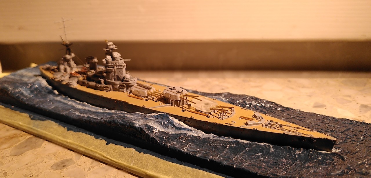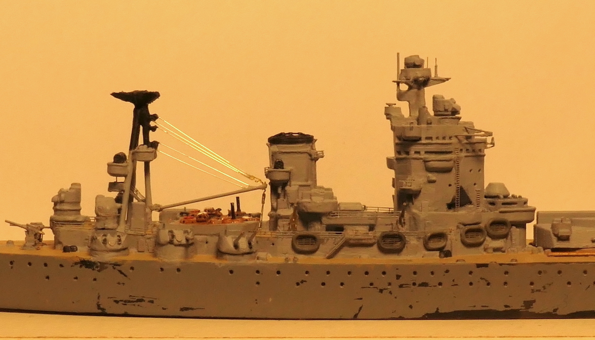 Kleine Anmerkung zum Modell: Zu sehen ist neu die schwere Artillerie mit den Lafetten so wie sie vor den ersten Salven gegen die Bismarck ausgerichtet waren. Bemalen werde ich sie demnächst mit meiner kürzlich erworbenen HS Ultra - mit dem Pinsel muss ich grundsätzlich einfach zu viel Farbe auftragen bzw. sind homogene Flächen bei dem Massstab sehr schwierig. Bin gespannt, ob die Arbeit mit der Airbrush meine Erwarten erfüllt.