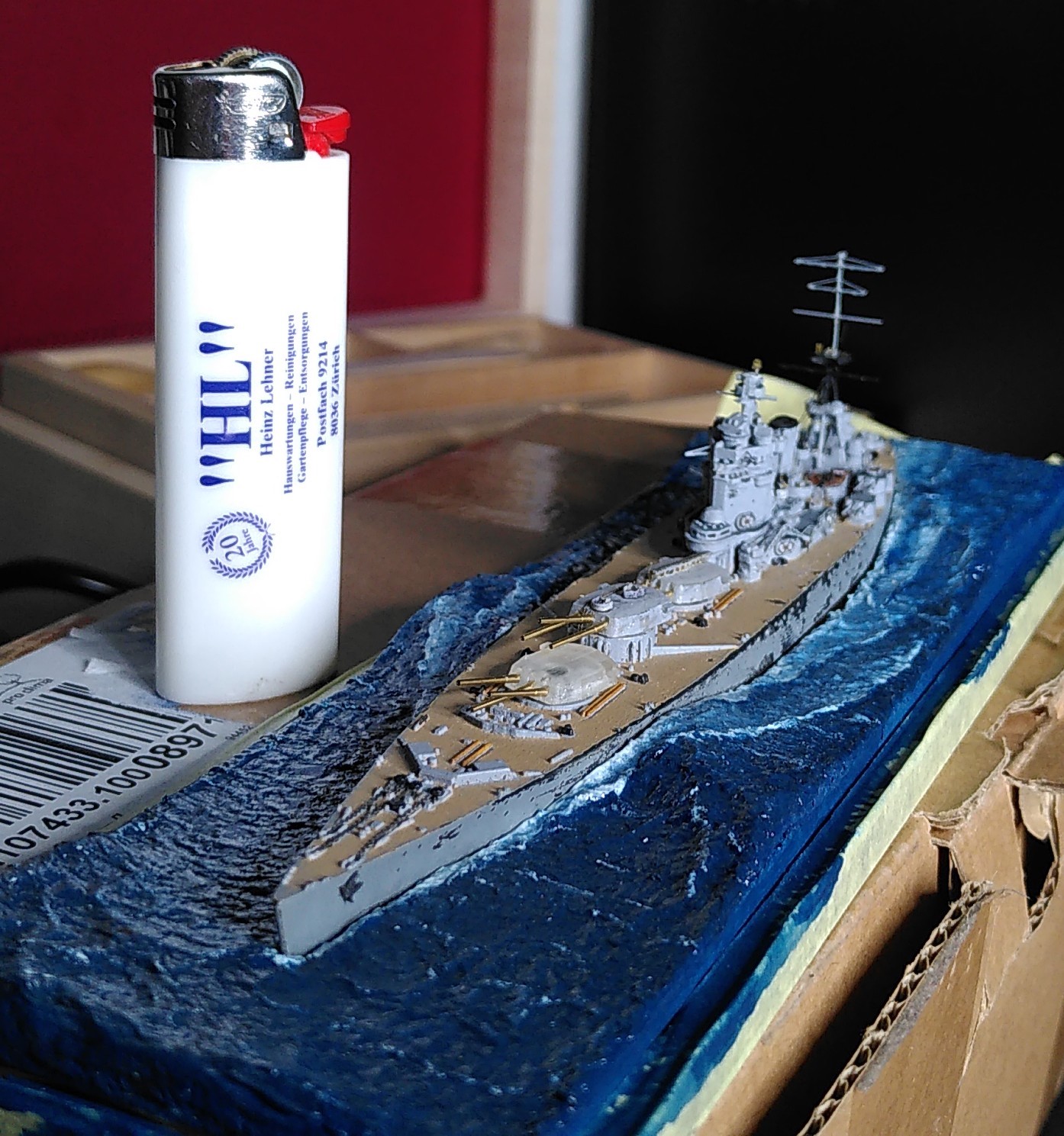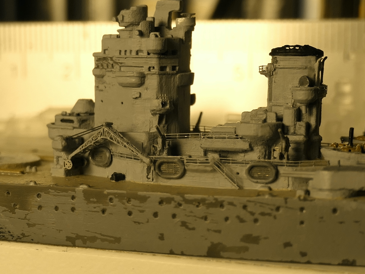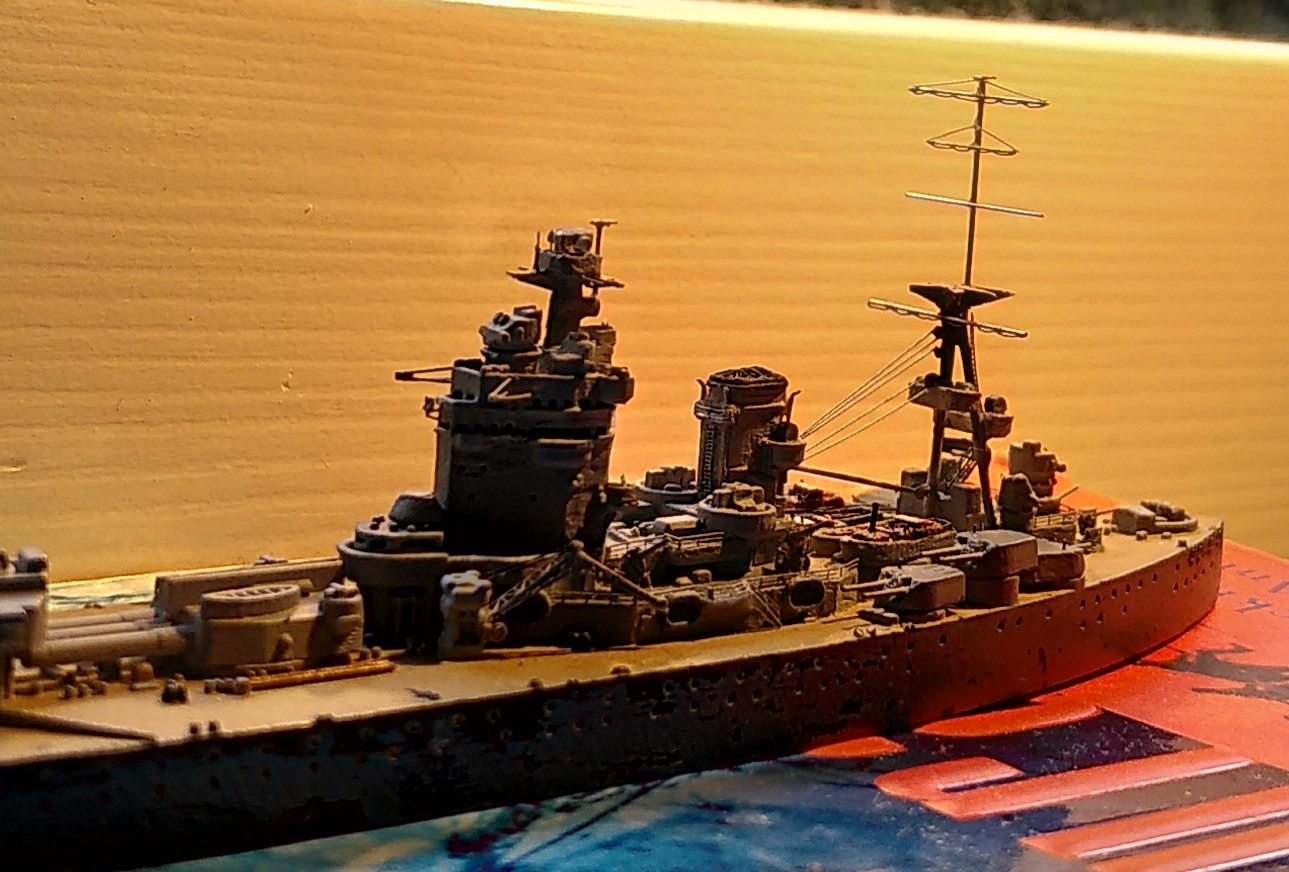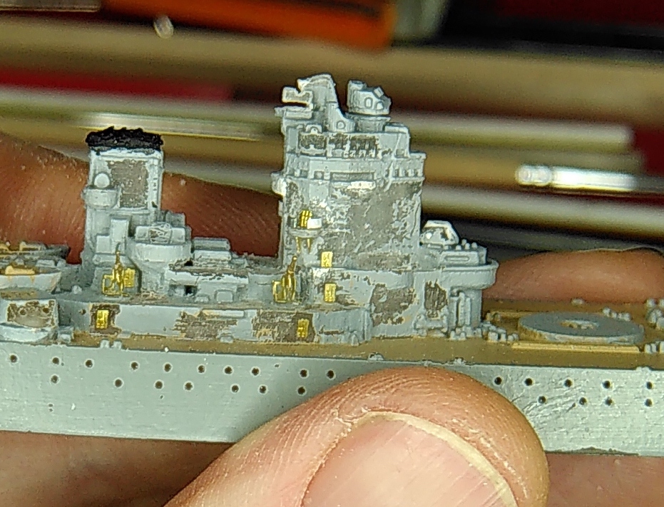 Kleine Anmerkung zum Modell: Zu sehen ist neu die schwere Artillerie mit den Lafetten so wie sie vor den ersten Salven gegen die Bismarck ausgerichtet waren. Bemalen werde ich sie demnächst mit meiner kürzlich erworbenen HS Ultra - mit dem Pinsel muss ich grundsätzlich einfach zu viel Farbe auftragen bzw. sind homogene Flächen bei dem Massstab sehr schwierig. Bin gespannt, ob die Arbeit mit der Airbrush meine Erwarten erfüllt.