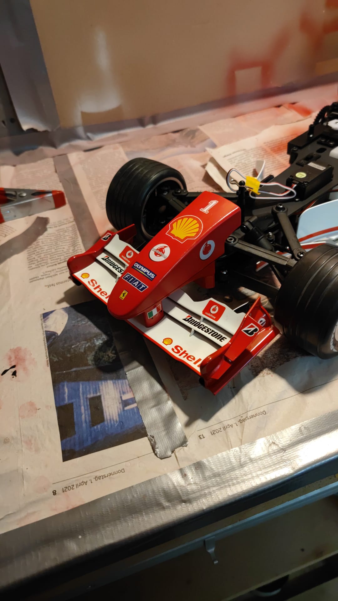 Überhaupt macht sich das Alter des Bausatzes bemerkbar. Ich habe die Karosserie fast nicht auf das Chassis gebracht, einfach weil sie keinerlei Flexibilität mehr hat..... das Highlight, ich musste den Motor wieder ausbauen, da dafür einfach kein Platz ist.