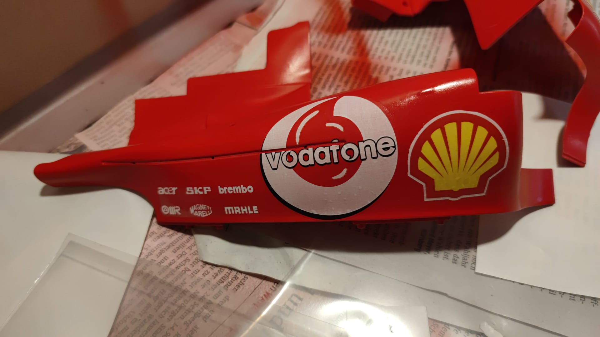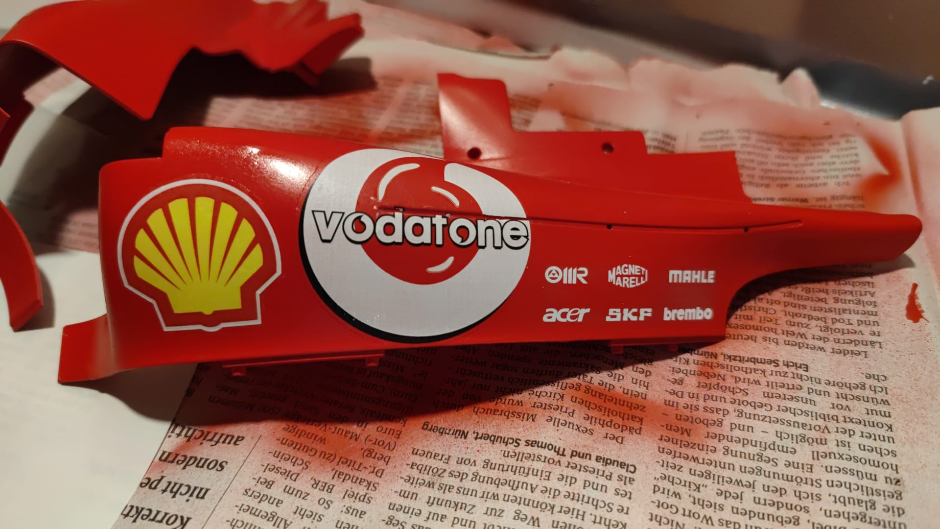 Weiße Decals sind immer problematisch, gerade auf Untergründen mit kräftigen Farben. Auf dem linken Vodafone-Decal scheinen ein paar Lufteinschlüsse zu sein. Du könntest versuchen, die mit einer feinen Nadel aufzupieksen und die Luft vorsichtig herauszureiben.