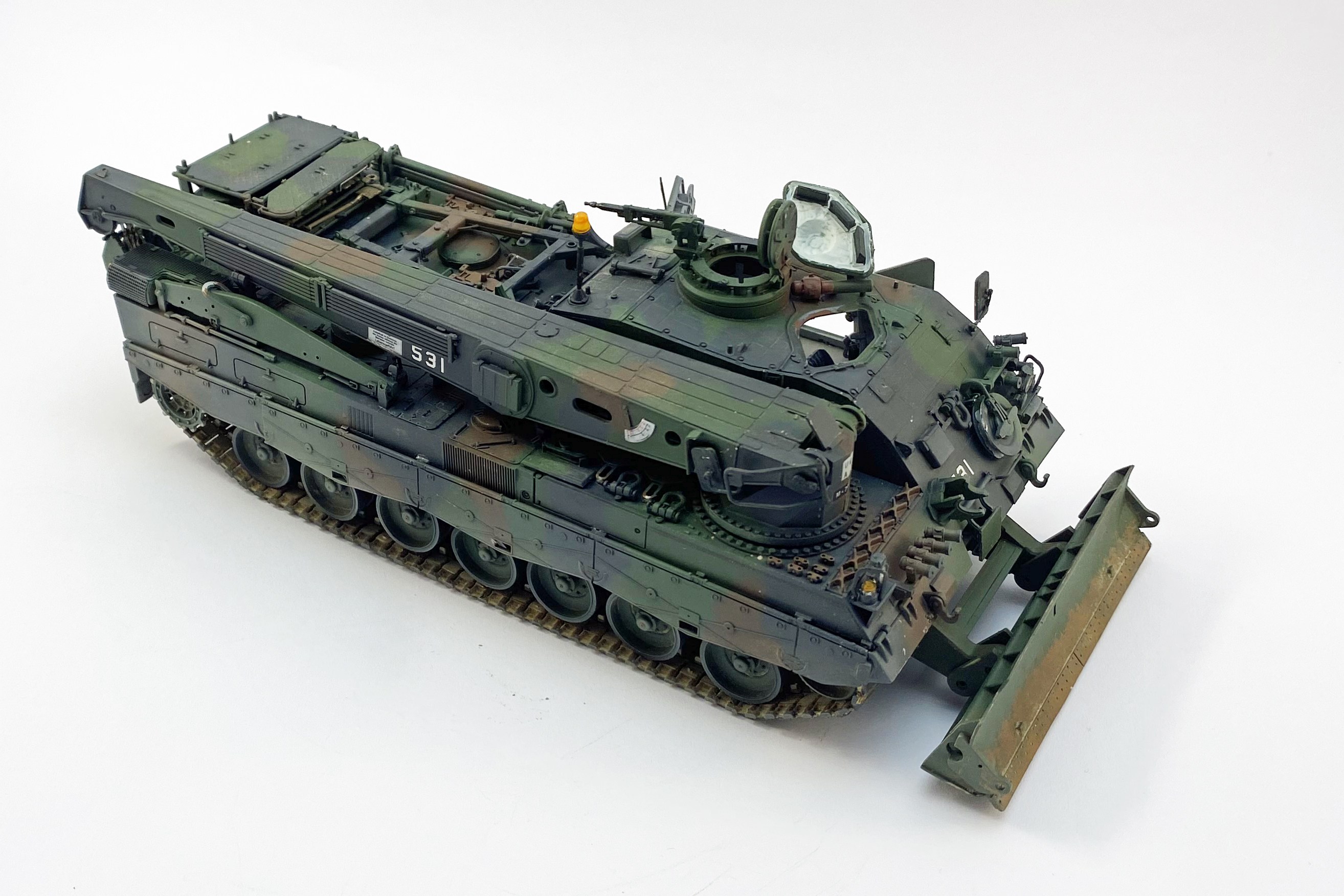 Es handelt sich um einen sehr aufwändigen aber aus meiner Sicht Top-Bausatz, auf der Wanne sind unzählige Ausrüstungsteile anzubringen und dann auch zu bemalen. Die Flecktarnung ist mit der Airbrush ohne Maskierung freihändig aufgetragen. Anschliessend wurde das Modell mit auf Ölfarbe basierenden Filtern und Panellinewhash bearbeitet. Wie bei den vorgegangenen Modellen habe ich mich auch beim Büffel entschieden, ein minimales Weathering durchzuführen, der Panzer soll so dargestellt sein, wie er nach einer Strassenfahrt aussehen könnte.