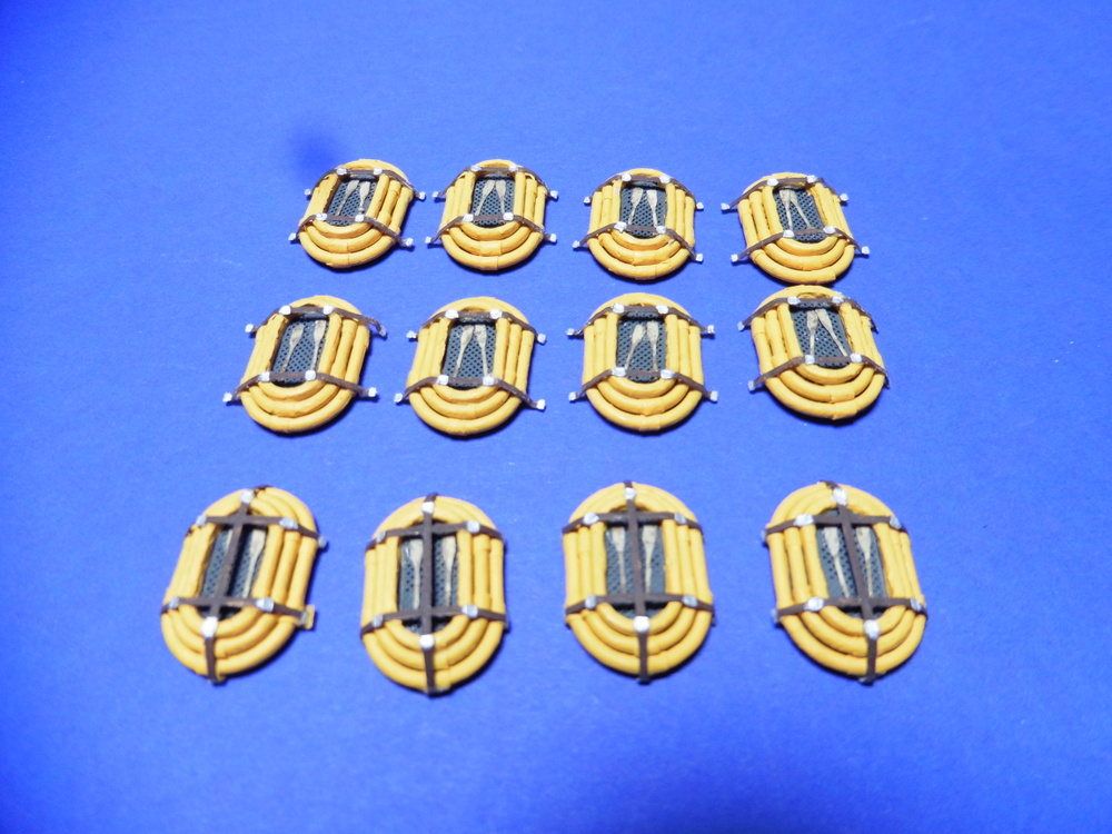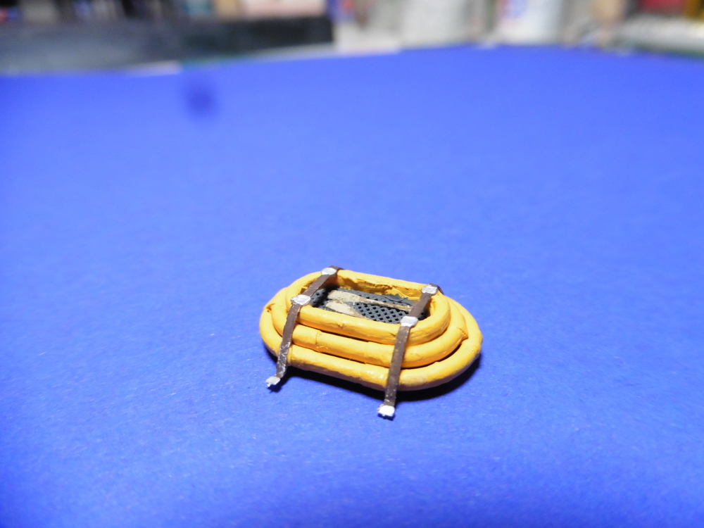 Die Trommeln hatte ich erst in Deck Tan ( Tamiya ) bemalt was mir zu hell war . Wenn man an Haltetaue denkt sind die dann doch mehr Gelbbraun. Ich hab diese dann in NewWood von AK bemalt . Und dann das ganze mit einem Braun Schwarzen Wash versehen . Dieses dann mit Q Tips bearbeitet .