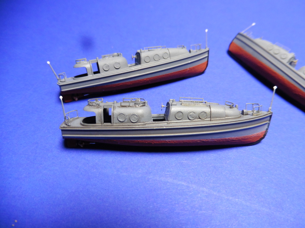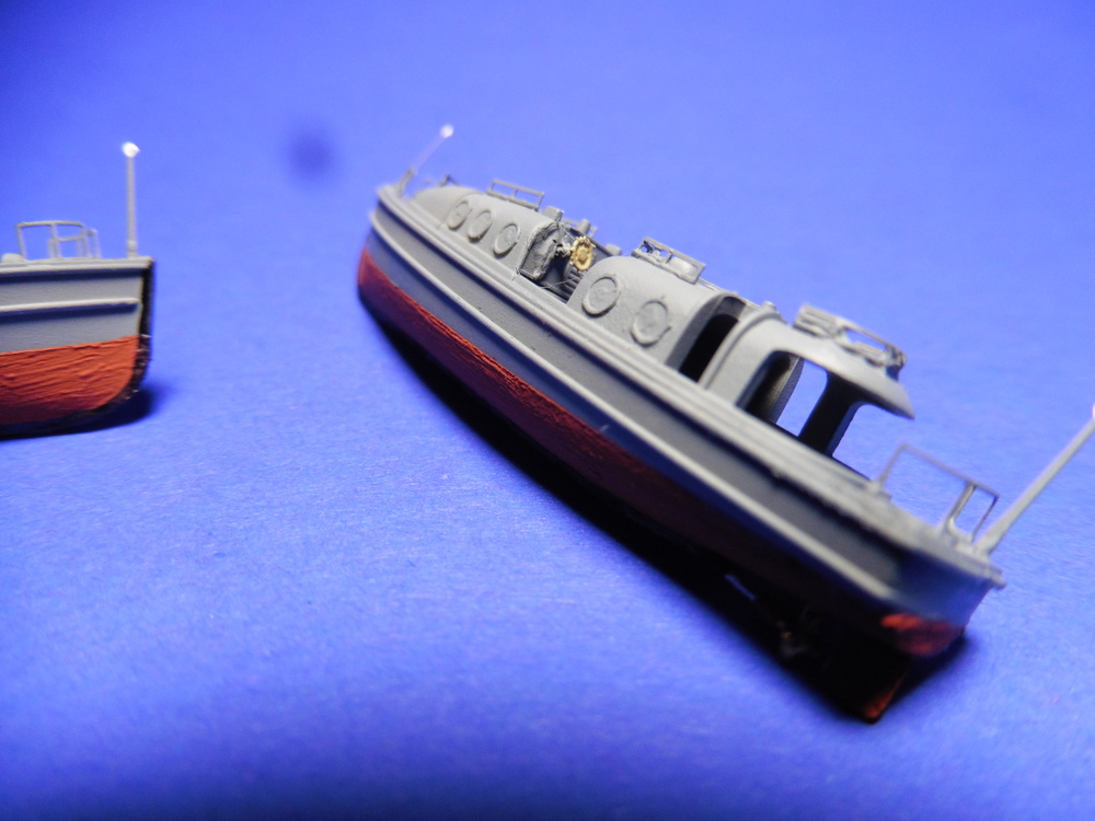 Die Motorbarkassen waren recht einfach . Rumpf und Aufbauten verklebt und dann ein paar Ätzteile drauf.. fertig