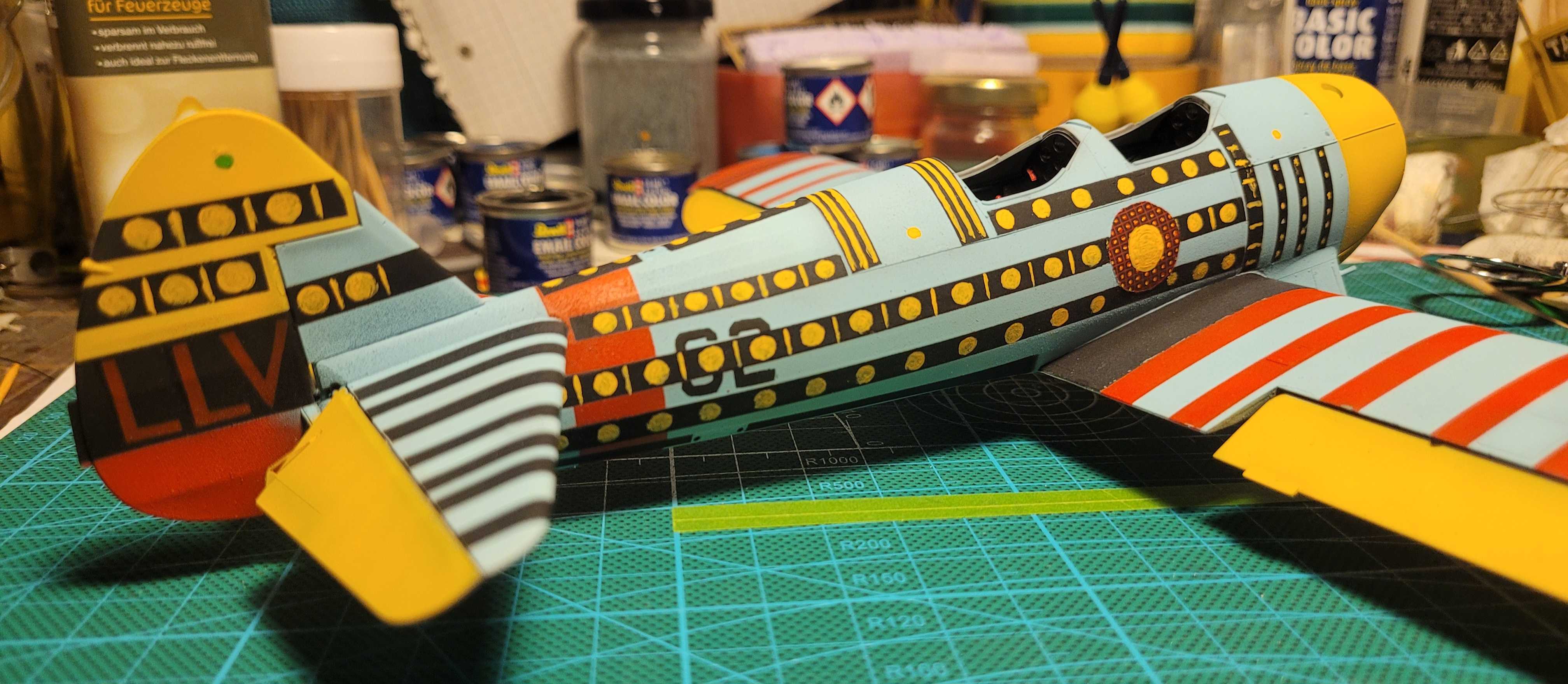 Momentan steck ich mittendrin in der Detailbemalung von Rumpf/unterer Tragfläche.