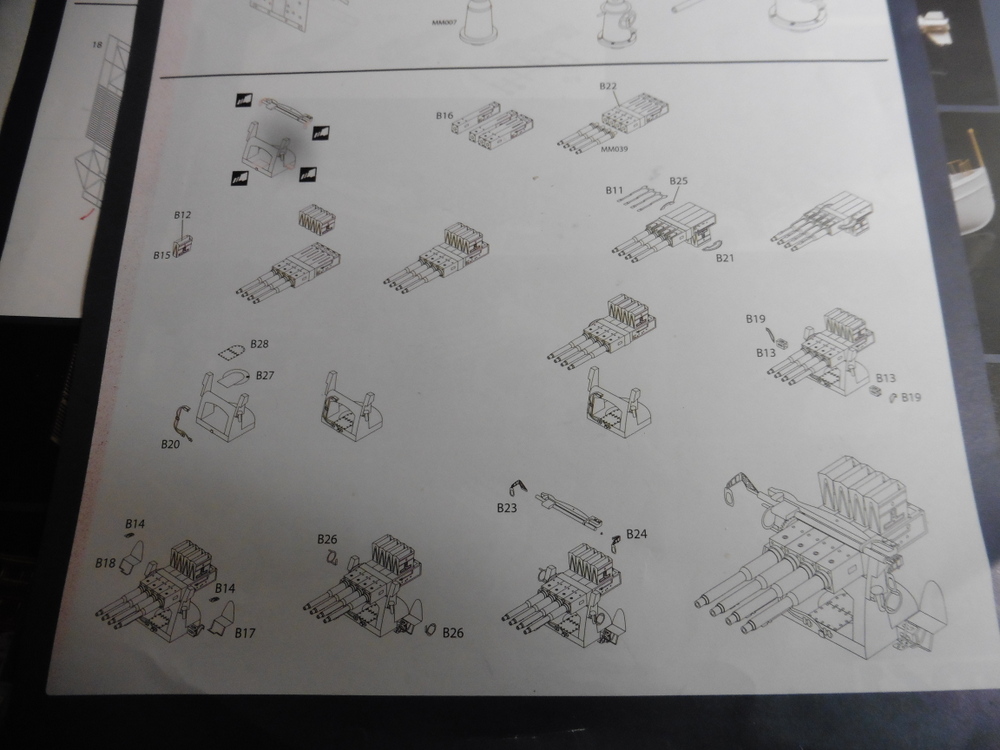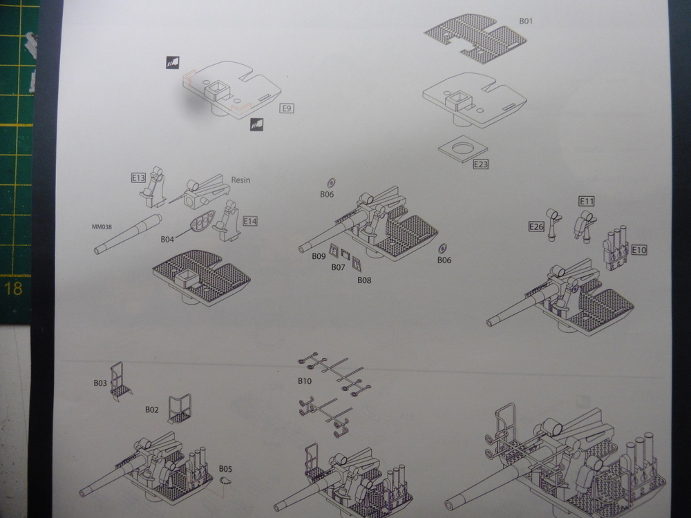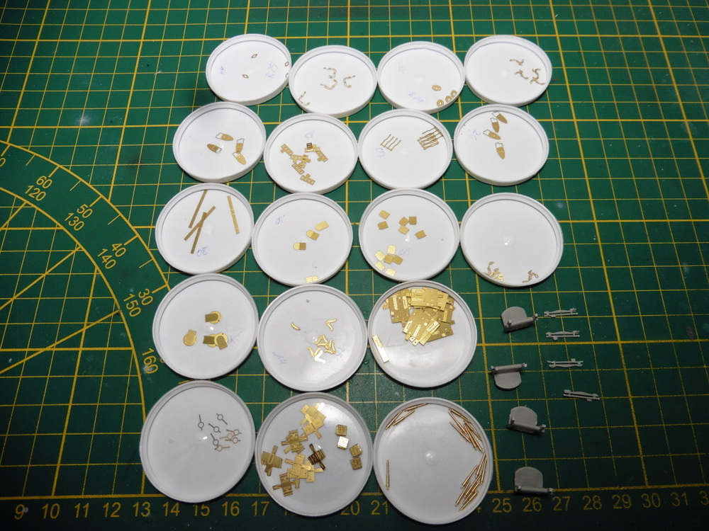 Ich war bei den 5'' Geschützen stehen geblieben . Hier sind 8 Stck zu fertigen . Also Überschaubar. Diese bestehen aus 19 Teilen . Auch hier kommt auch ein Teil der Komponenten aus dem Ätzteillager .