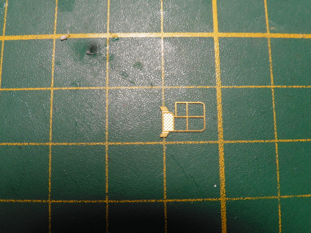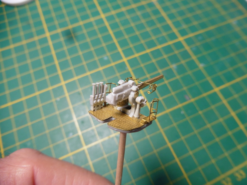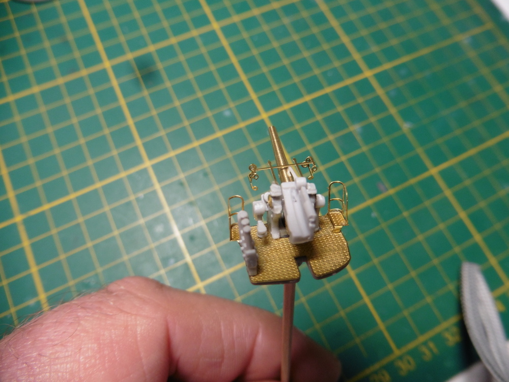 Desweiteren haben wir vorne Rechts und Links eine erhöhte Stellung . Diese wird durch jeweils ein Ätzteil realisiert. Hier ist dann das Schutzgitter / Reeling das schwierigste . Diese muß in einem leichet Bogen gebogen werden. Also kein rechter Winkel. Da die Haltepunkte an der Plattform nur 2 mini Stellen sind ist hier ein Abbrechen ganz schnell möglich . Auch ein zweites Biegen funktioniert nicht . Man hat also nur eine Chance das richtig zu machen .