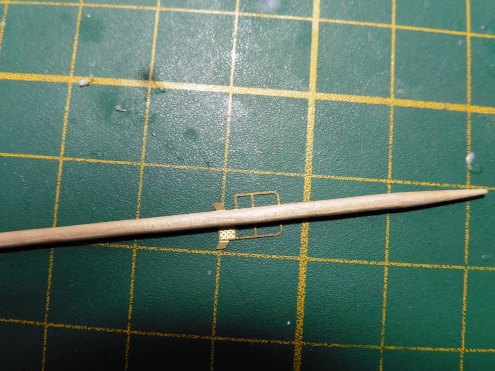 Ich hab das Ätzteil Flach auf eine feste Unterlage gelegt . Dann die Wunderwaffe Zahnstocher auf die gewollte Biegekannte gelegt und mit 2 Fingern fixiert . Dann habe ich meinen Klingenbeitel unter die Reeling geschoben und das ganze dann über den Zahnstocher gebogen . Somit bekommt man eine Rundung in die Reeling . Dann einen Tropfen Kleber unter die Biegekante und die Reeling dann Aufgestellt .