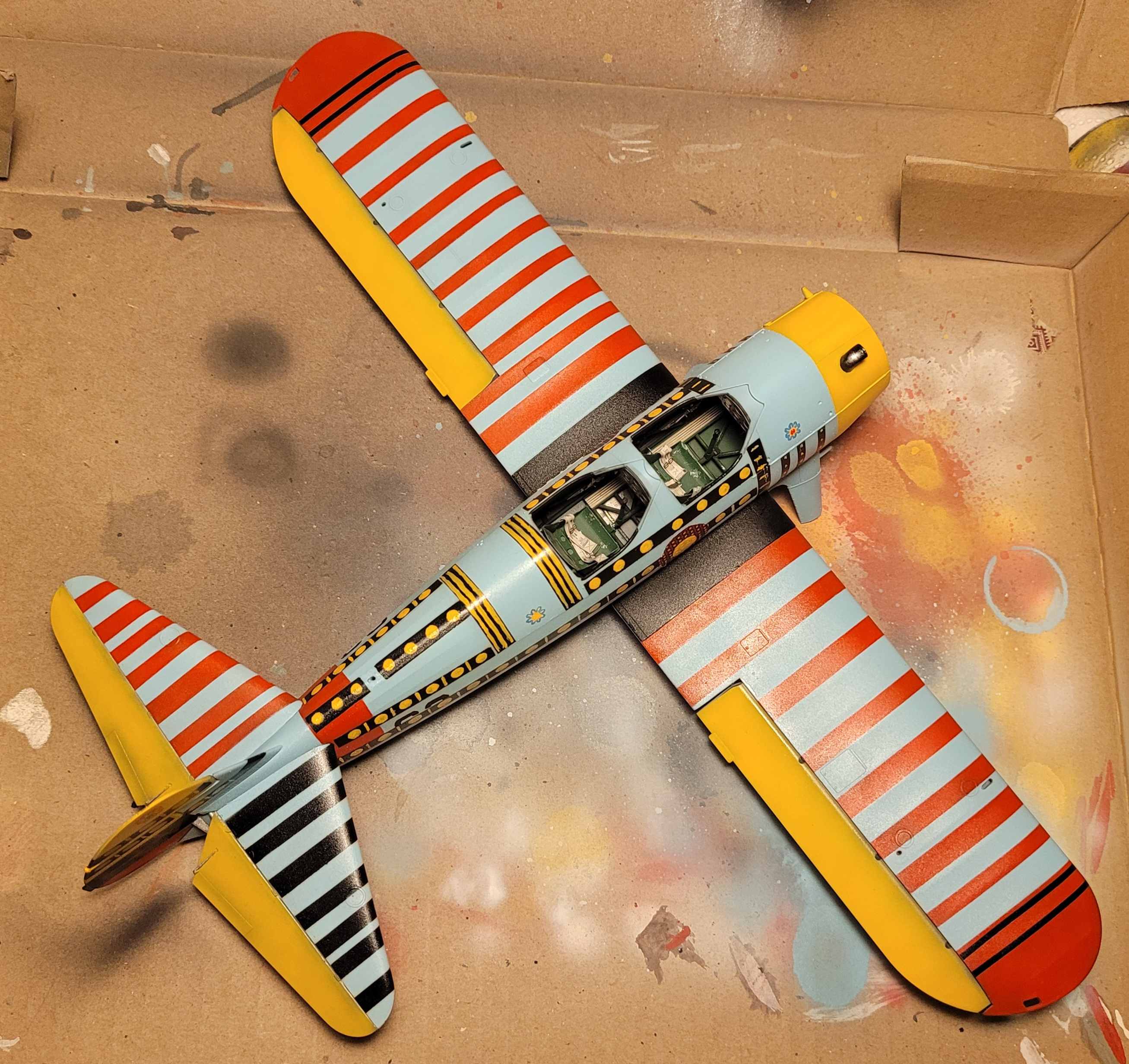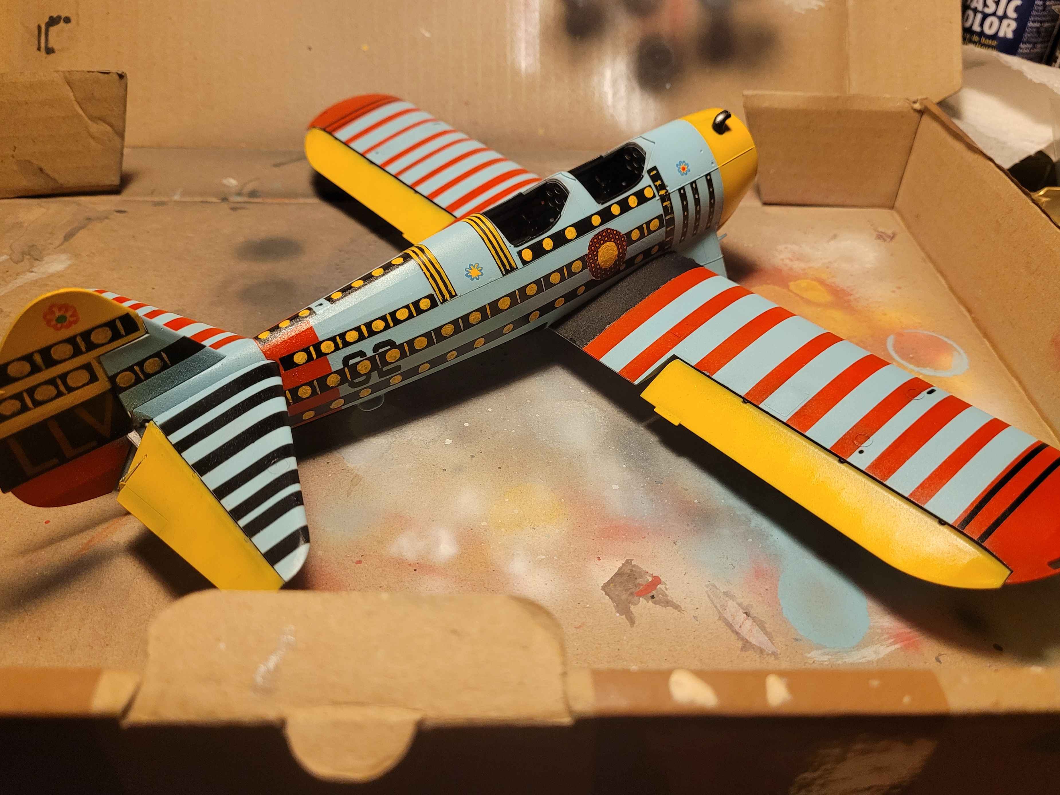 Seit dem letzten Update ging es munter weiter mit der oberen Tragfläche...grundieren, maskieren, kolorieren...ummaskieren, nochmal kolorieren. :lol: