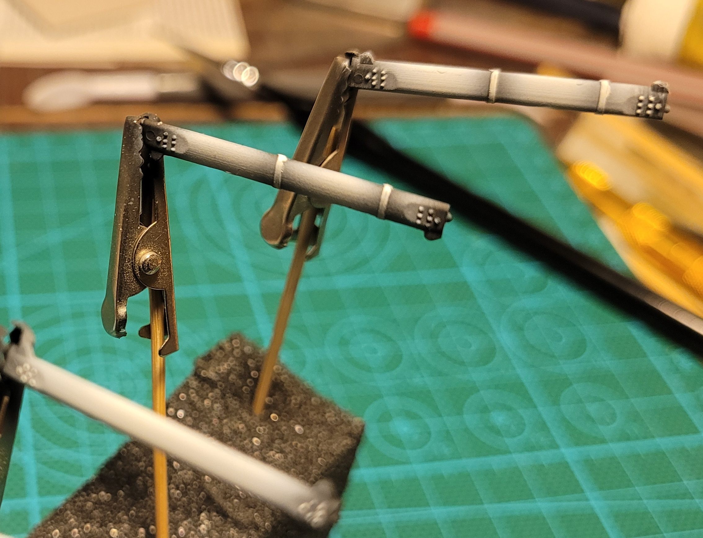 Danach hab ich mich endlich den Tragflächenstreben gewidmet. Hab das lange vor mir her geschoben, weil ich Teile mit solchen Angüssen nahezu hasse: