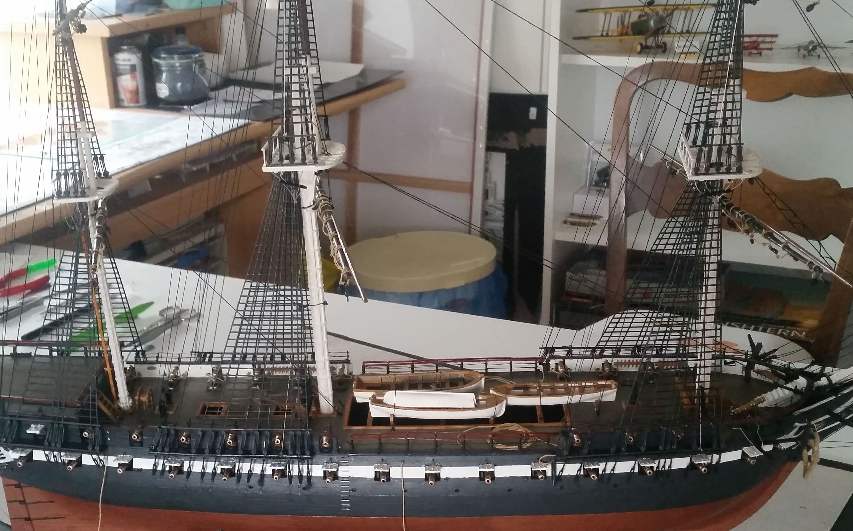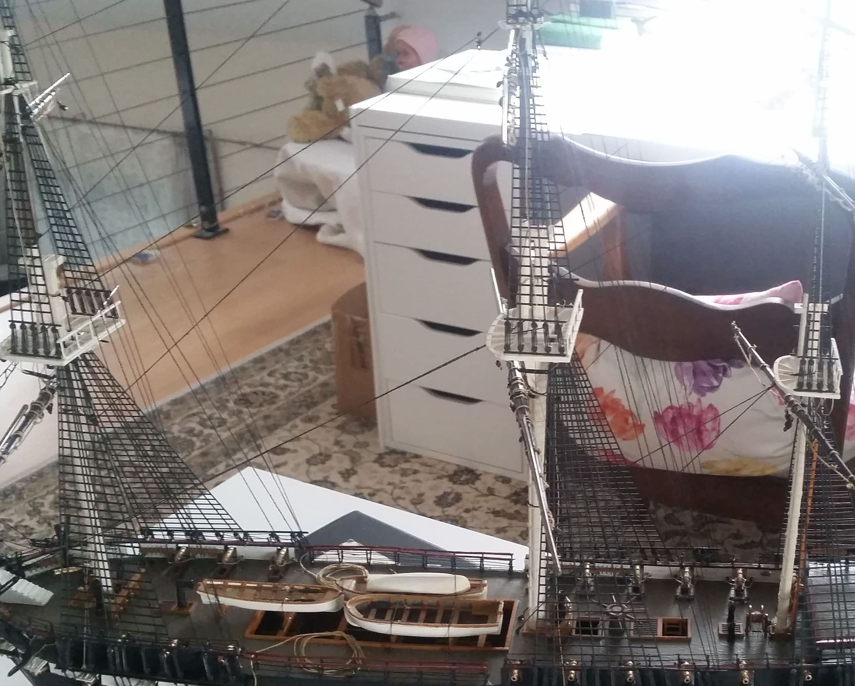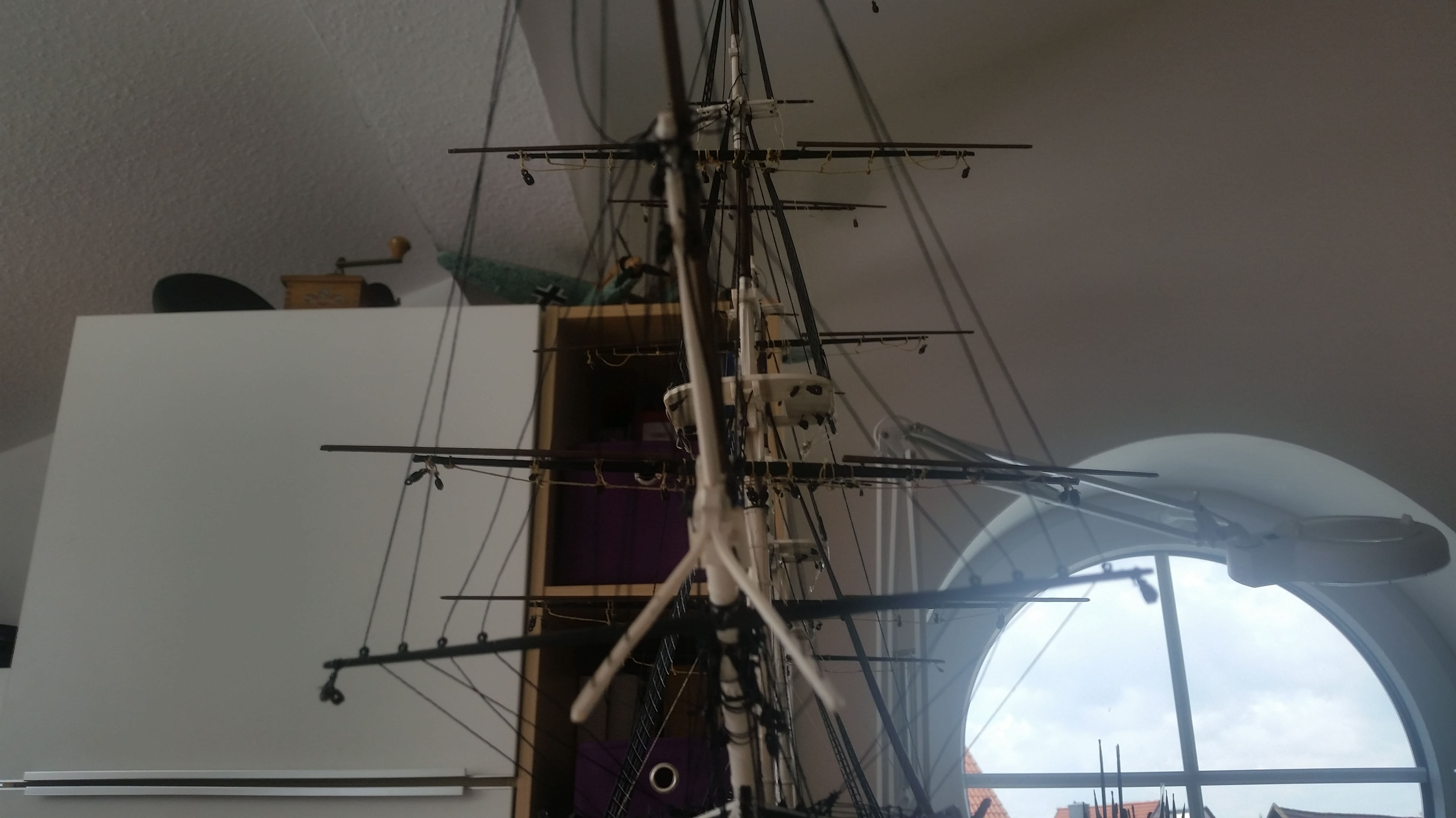 Du hast Christian. In der Bauanleitung war die Lage dieser 4 Taue nicht genau zu erkennen. Also habe ich sie vom Mast "abstehen" lassen. Bei genauerer Betrachtung dürften diese Taue die Fußpferde für die Matrosen sein, um ganz vorne hinzukommen. Genau wie an den Rahen. Das werde ich noch ändern. Dürfte kein so großer Aufwand sein. Das Takeln vom stehenden Gut habe ich jetzt beendet. Ein bißchen musste ich die Taue ändern aber das hielt sich noch in Grenzen. Die Masten stehen in einer Linie, sind gerade und die Seile hängen nicht durch. Bin recht zufrieden mit meiner Arbeit bisher.