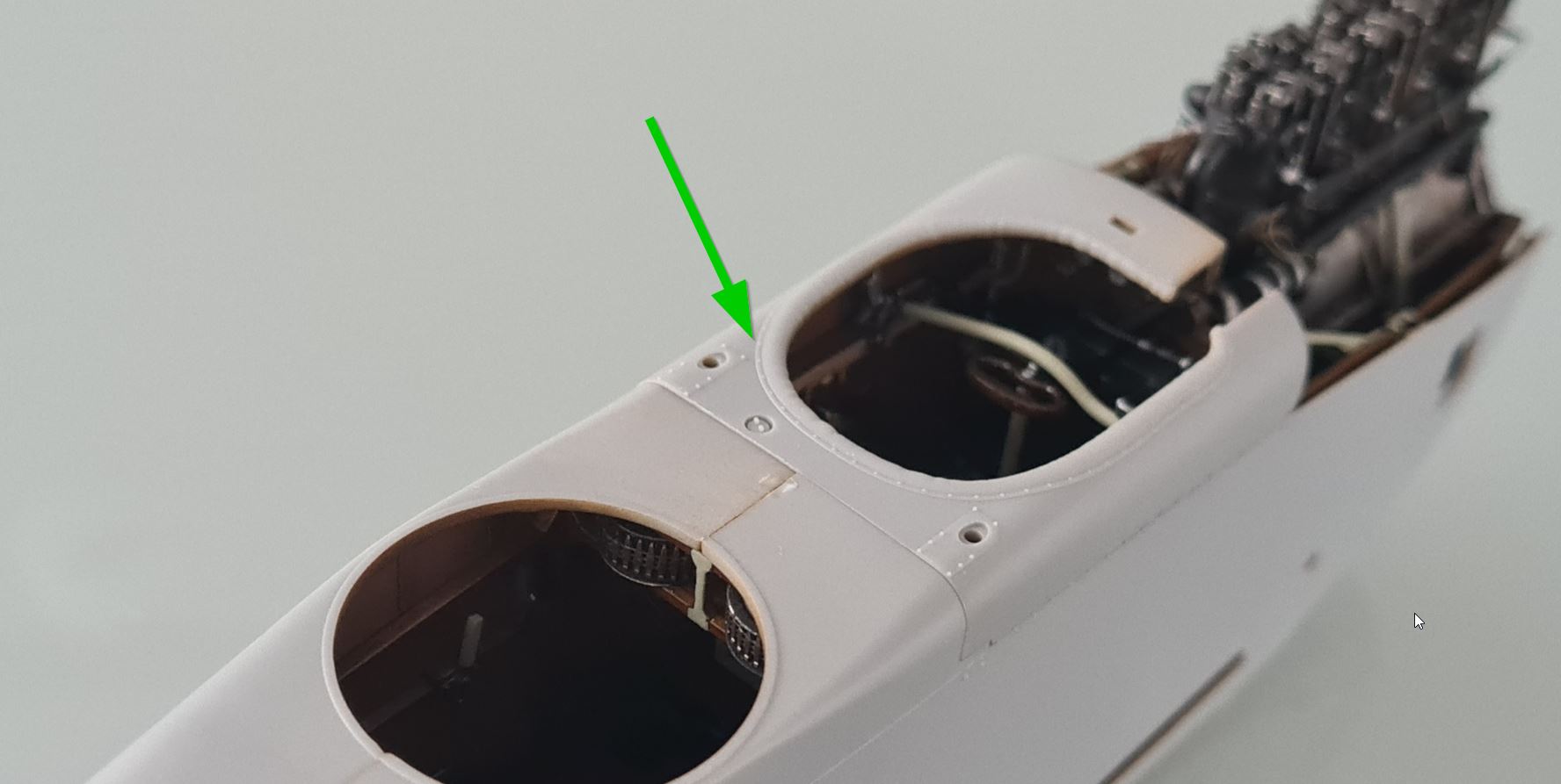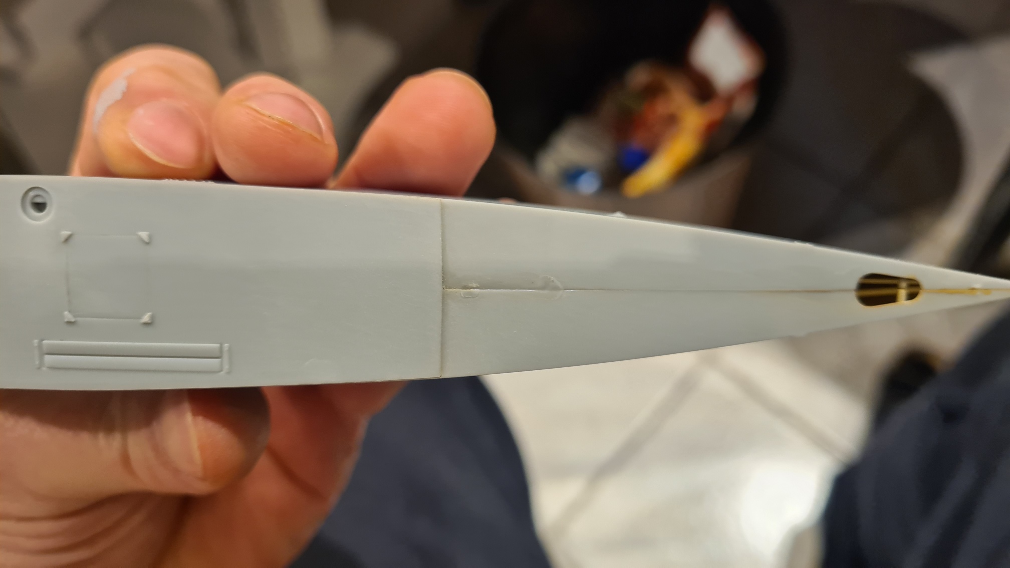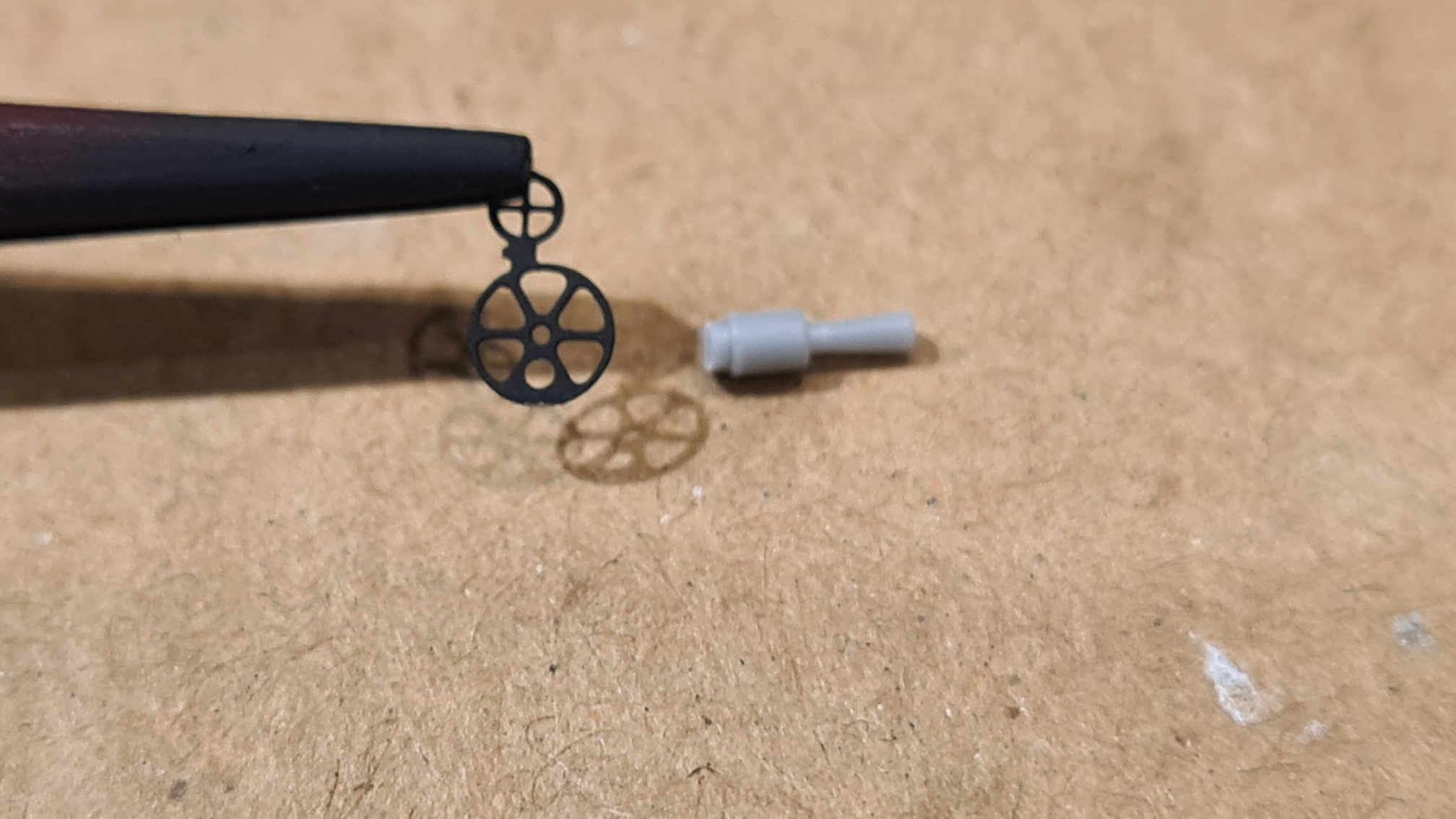 An einem Übungsstück hat es wunderbar funktioniert, also meine grundsätzliche Empfehlung für die Methode. Aber die PE-Teile von Wingnut Wings sind vergleichsweise dick. Es war eine Frickelei und das Endergebnis ist nicht so überzeugend, da bei der Prozedur das Werkstück an 2 Schwachstellen (Löchern) gebrochen ist. In diesem Fall aber nicht so wichtig, weil man hinterher kaum noch etwas davon sieht. Siehe spätere Fotos.