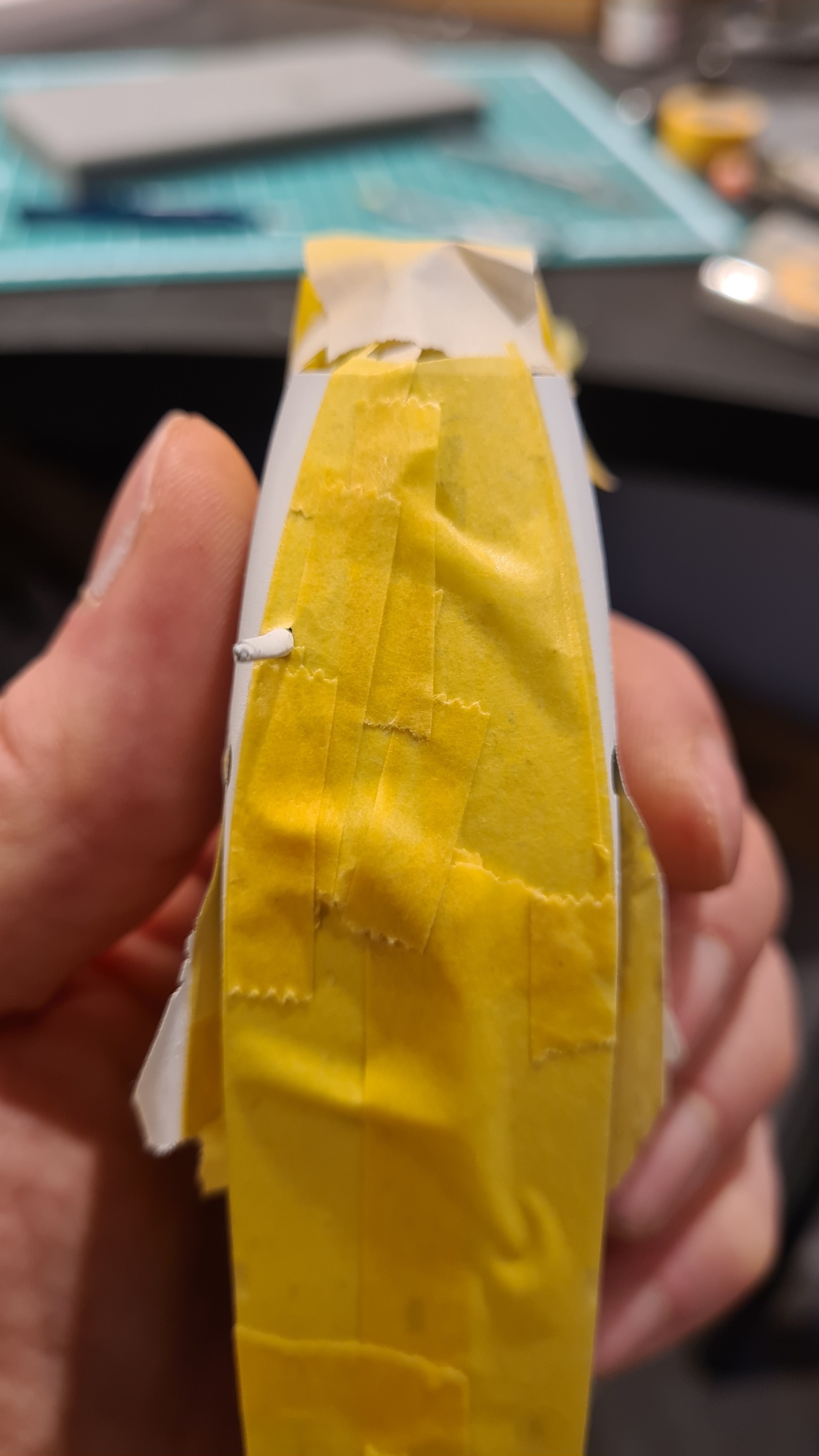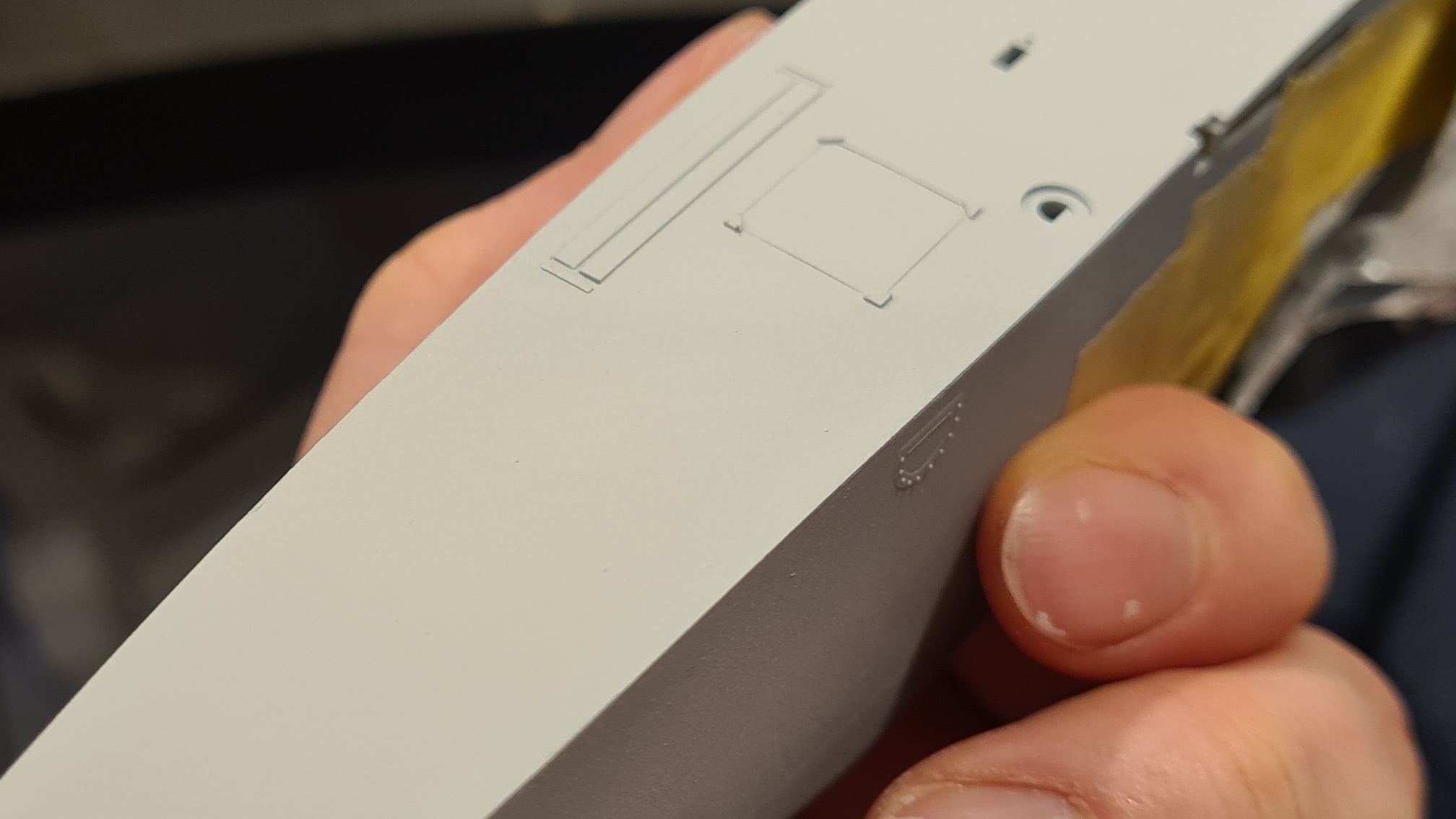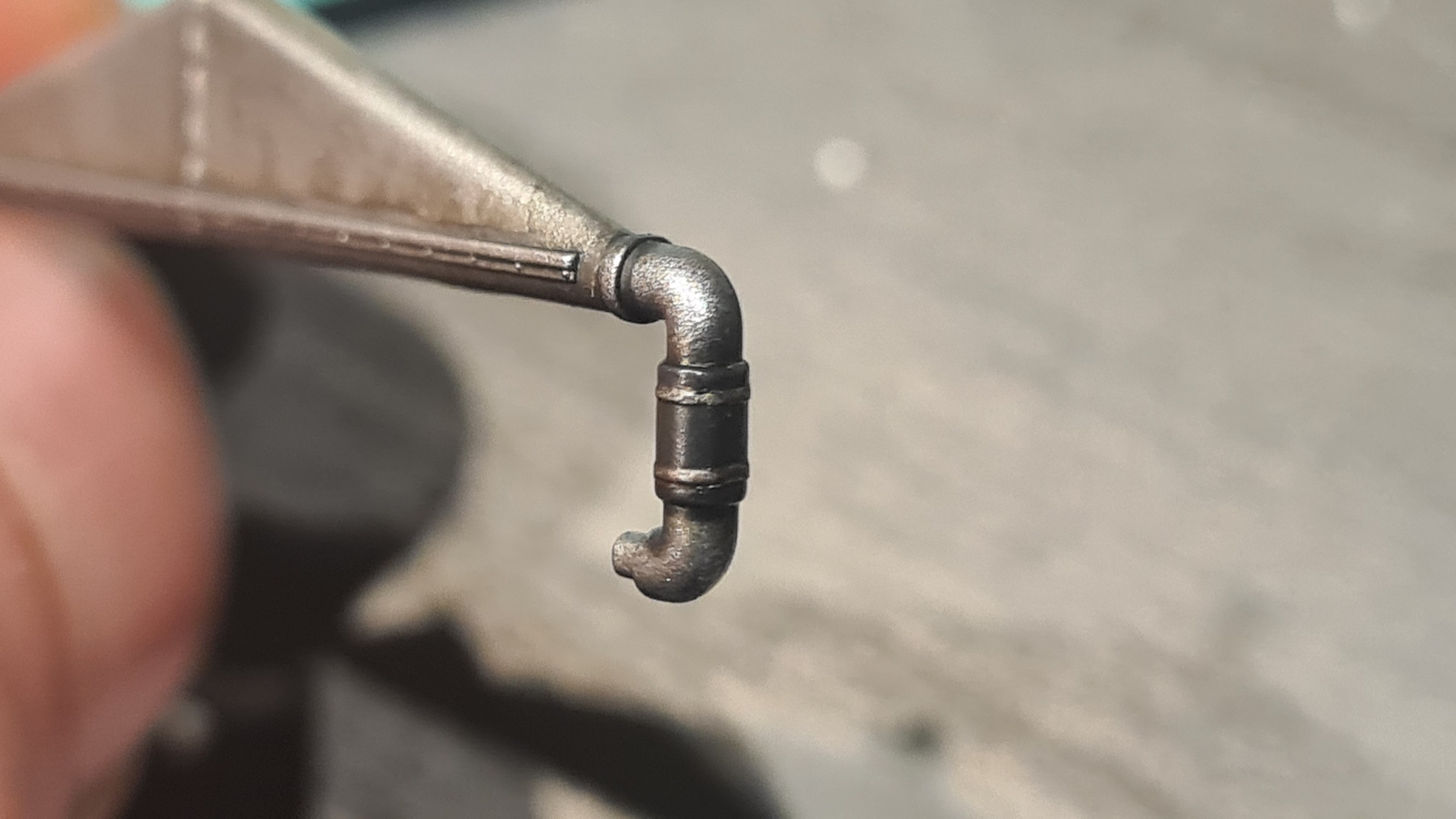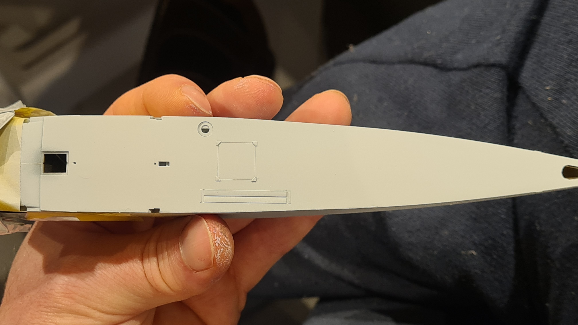 An einem Übungsstück hat es wunderbar funktioniert, also meine grundsätzliche Empfehlung für die Methode. Aber die PE-Teile von Wingnut Wings sind vergleichsweise dick. Es war eine Frickelei und das Endergebnis ist nicht so überzeugend, da bei der Prozedur das Werkstück an 2 Schwachstellen (Löchern) gebrochen ist. In diesem Fall aber nicht so wichtig, weil man hinterher kaum noch etwas davon sieht. Siehe spätere Fotos.