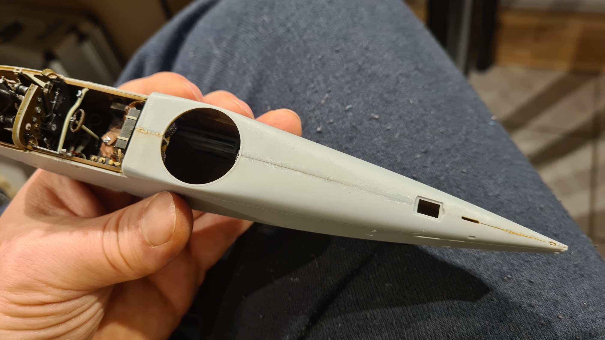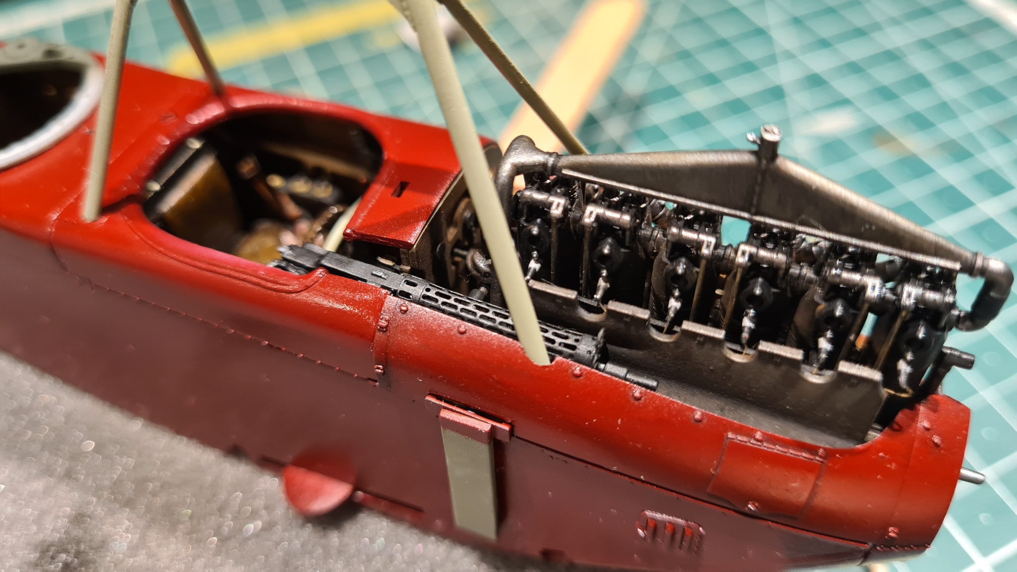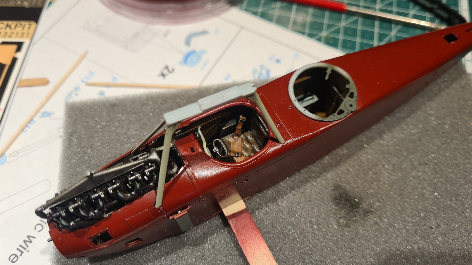 Als nächstes bekommen die "Einstiegslöcher" eine Lederumrandung. Große Decals müssen geklebt werden (davor drücke ich mich gerne). Aber ich denke, zuerst werden die Oberseiten der Flügel gesprüht.