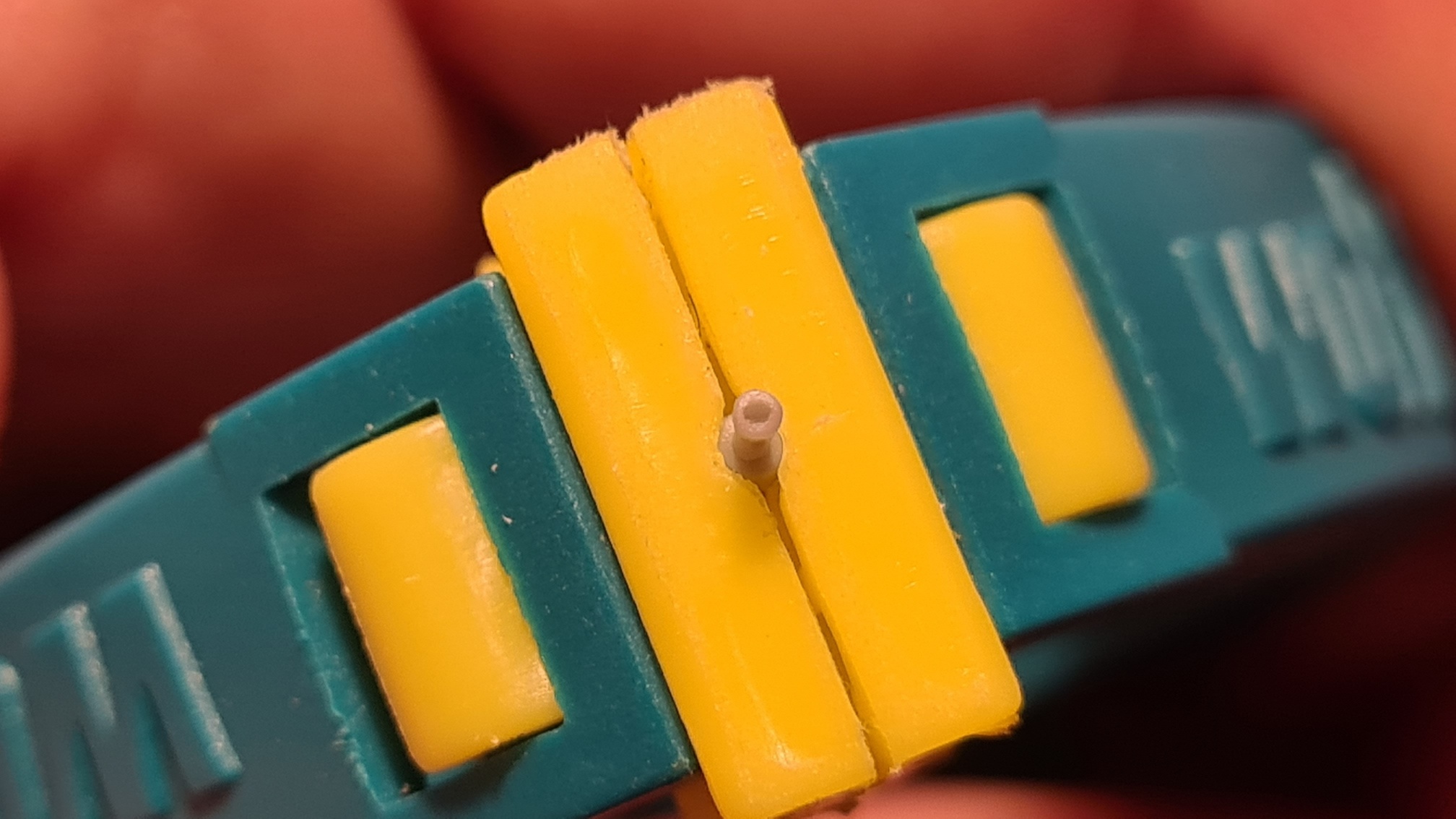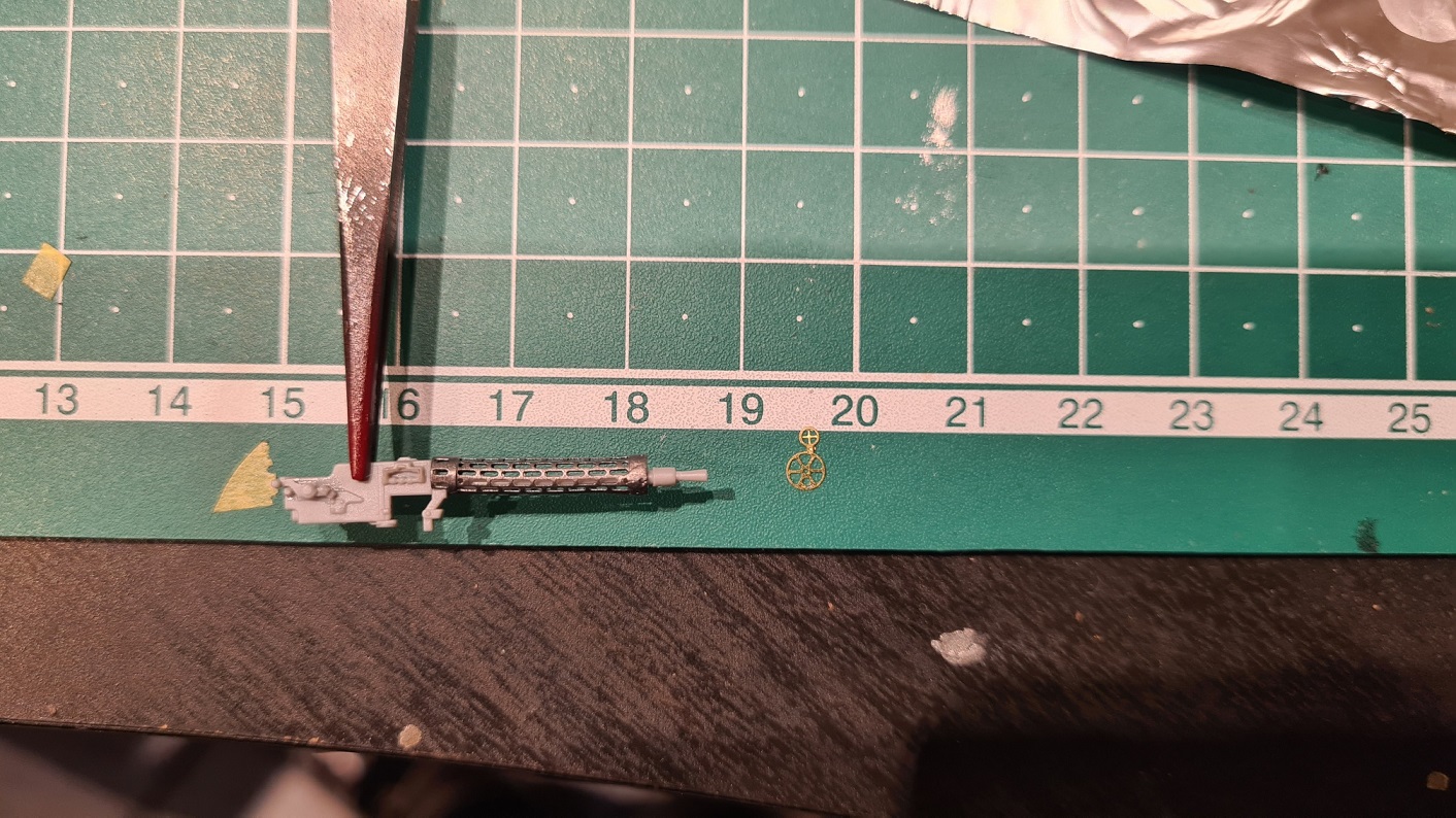 Hier zeigt sich direkt das nächste Problem. Der (eben aufgebohrte) Lauf passt natürlich nicht durch das Loch des PE-Teils. Also sauber abtrennen
